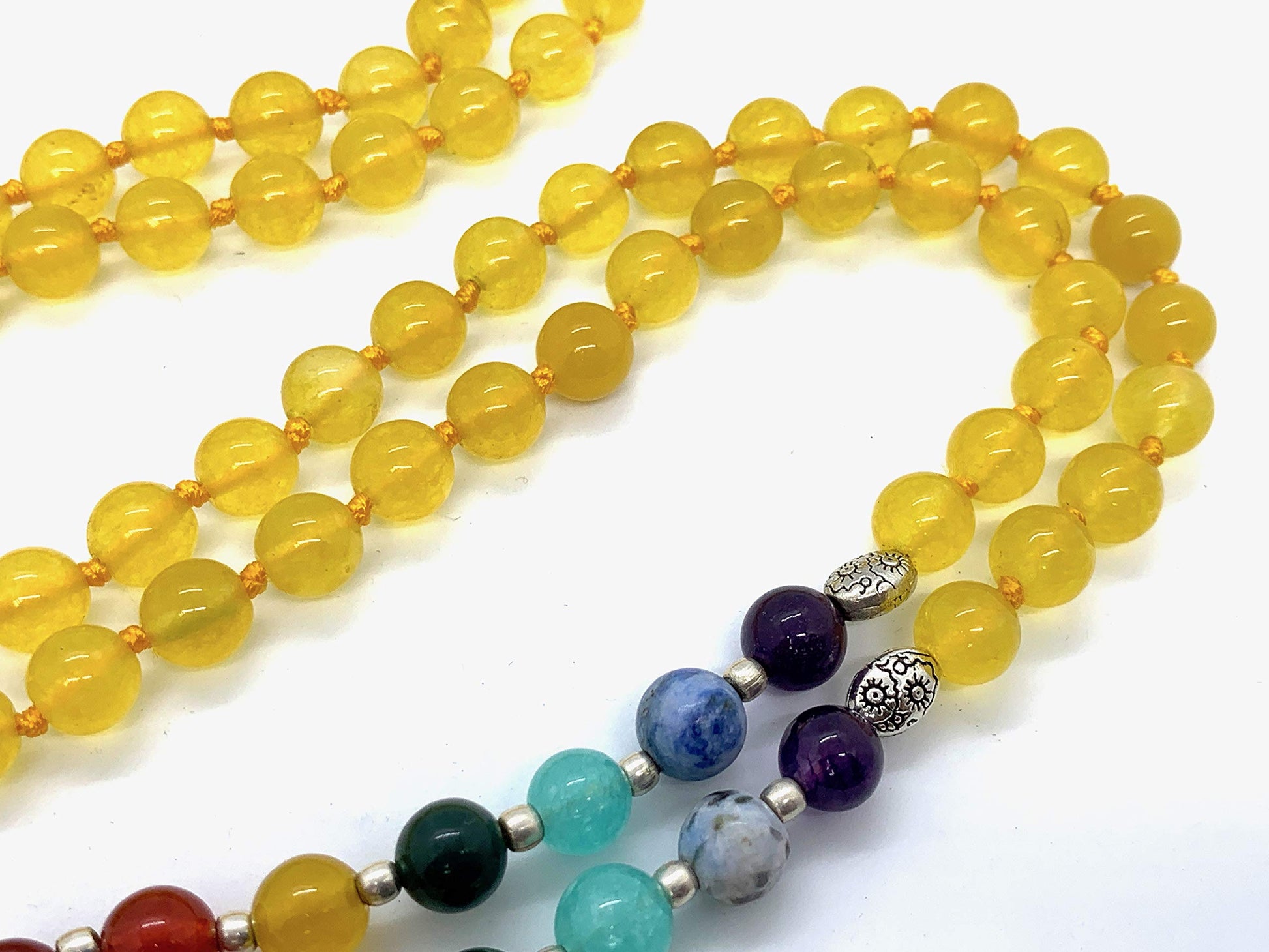 - Elevate your spiritual practice with our Hand Knotted 7 Chakra Yellow Jade Mala Necklace. This exquisite piece is designed to bring balance and harmony to your life, featuring vibrant yellow jade beads and seven chakra stones for a holistic approach to wellness and mindfulness.