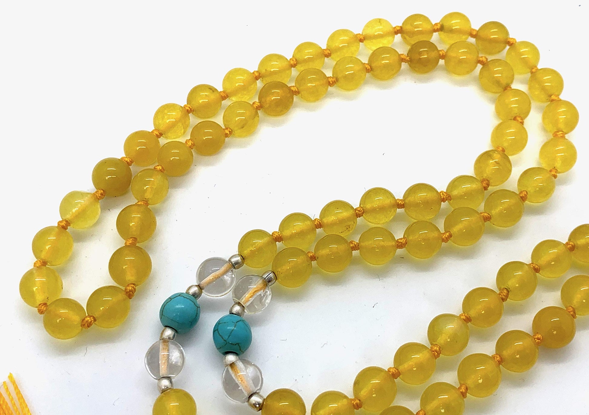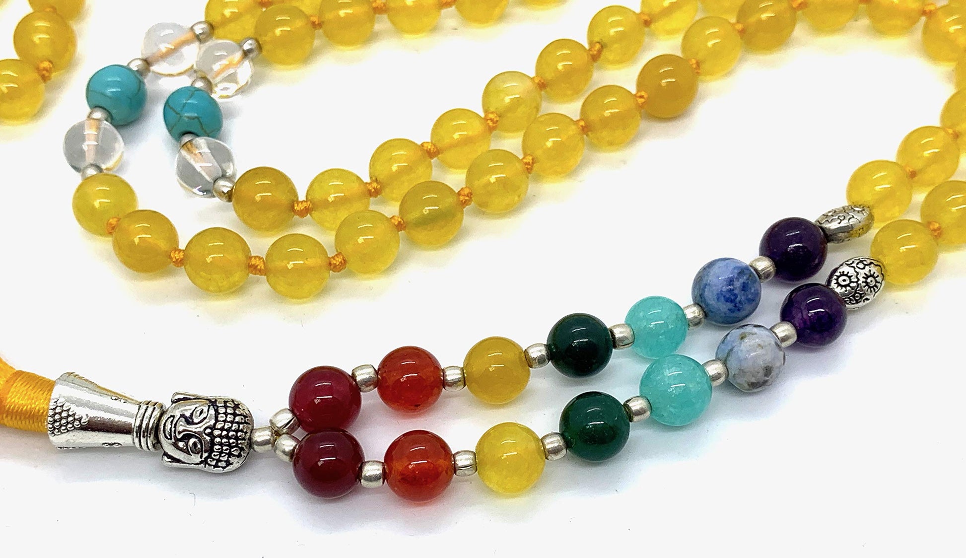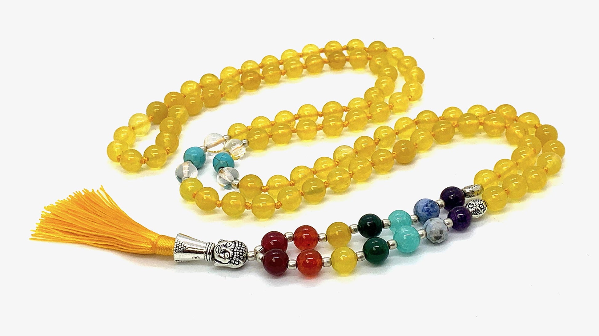 - Key Features: Type: Hand Knotted 7 Chakra Yellow Jade Mala Necklace. Bead Size: 8mm. Guru Bead: Buddha (Zinc Alloy). Birthstone: Gemini (Yellow Jade). Astrological Sign: Gemini. Chakra: Balancing All Seven Chakras. Craftsmanship: Hand Knotted.