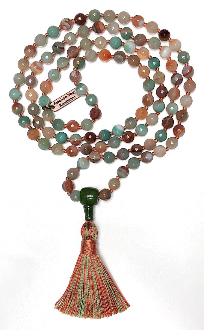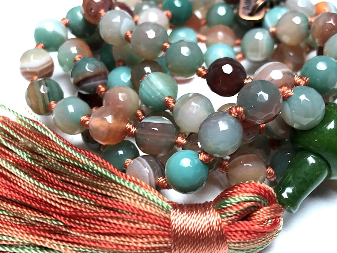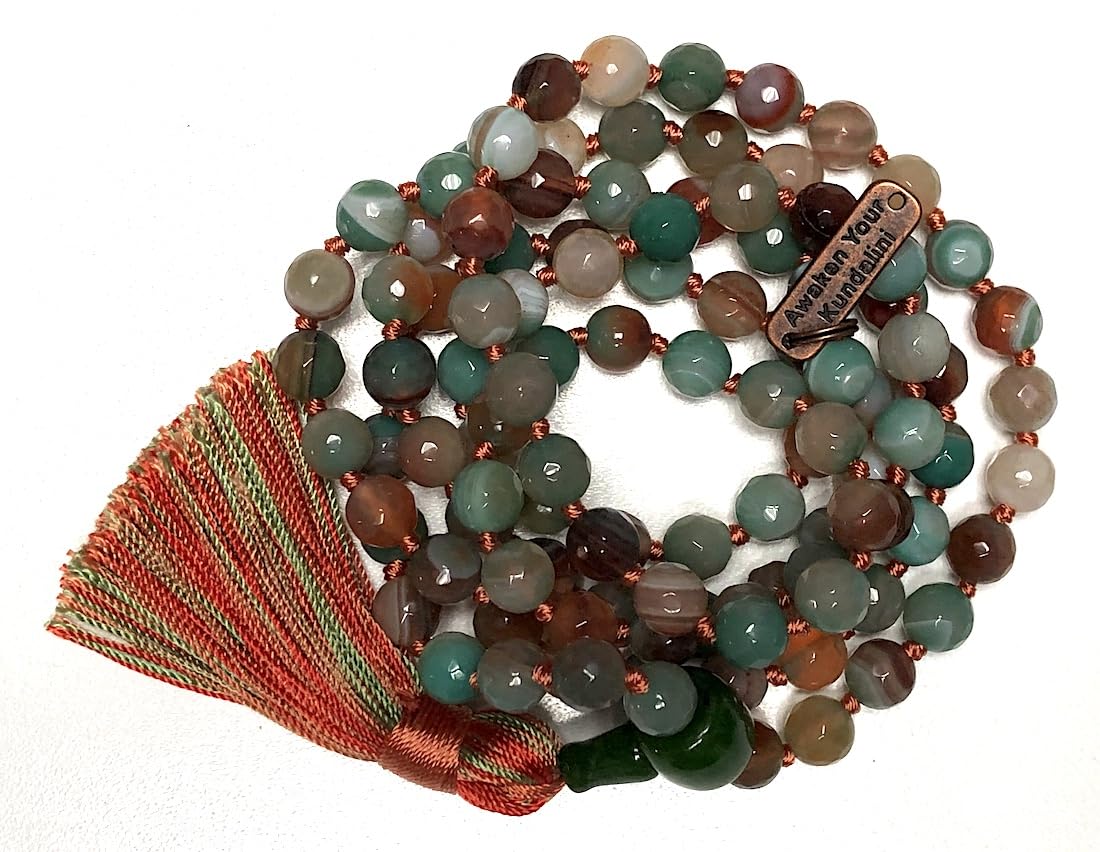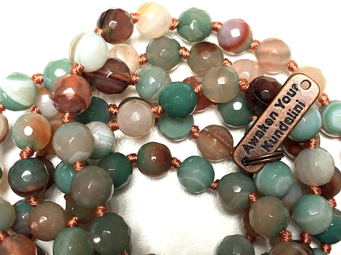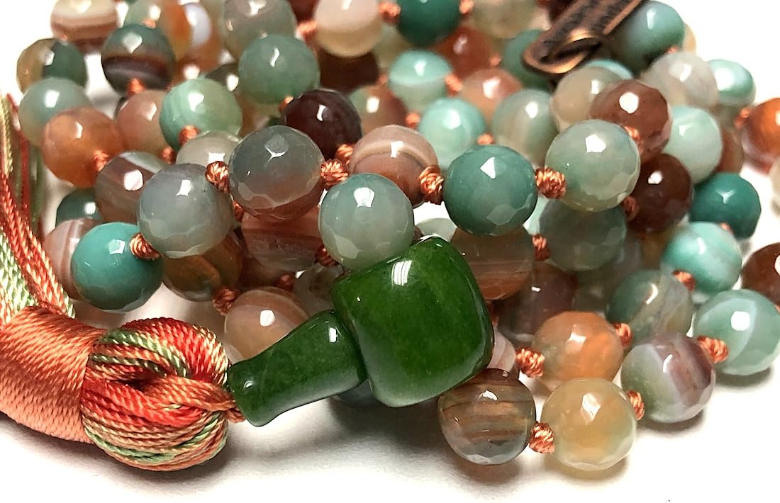 - Elevate your spiritual practice and everyday style with the 8mm Faceted Hand-Knotted Indian Agate Mala Beads Necklace. Crafted from AAA Grade Indian Agate beads, this necklace showcases the natural beauty of agate in a faceted design that catches the light and adds a touch of elegance to any outfit. Each bead is hand-knotted to ensure a durable and flexible necklace that drapes beautifully, offering a tactile experience during meditation or daily wear.