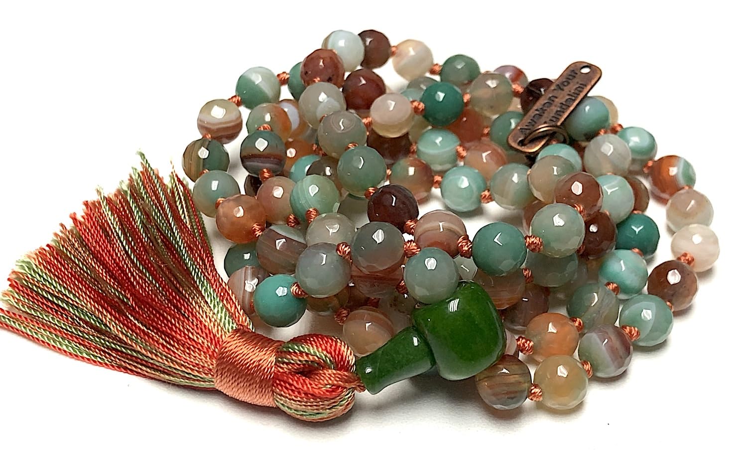 Experience Serenity & Balance with the Hand-Knotted Indian Agate Mala Beads Necklace - Taurus & Gemini Birthstone, Heart & Root Chakra Activation