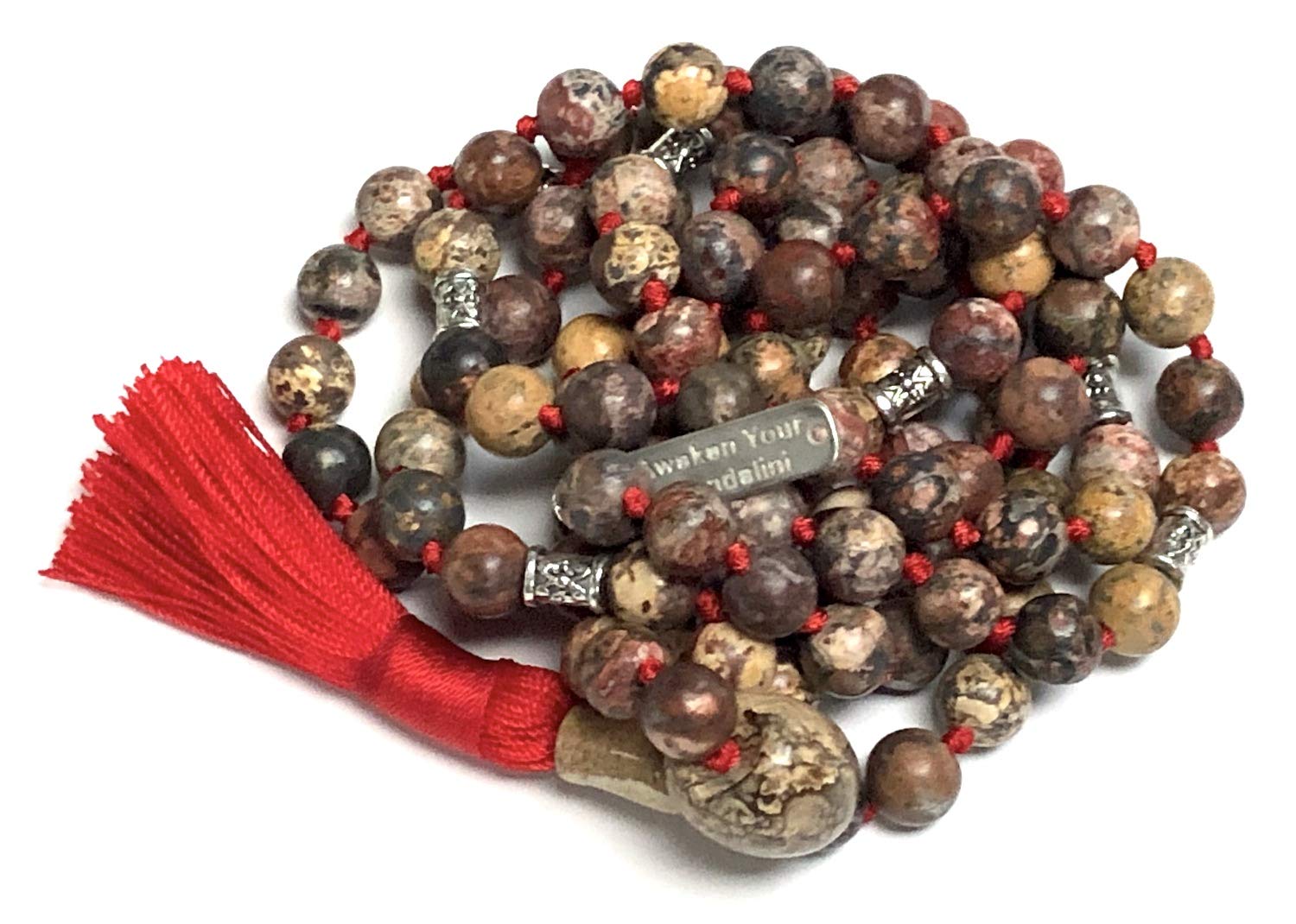 - Hand-Knotted for Authenticity: Each 8mm leopard skin jasper bead is meticulously hand-knotted, following the traditional mala practice of 108 beads. This adds a touch of mindfulness and artisan quality to the piece. Stylish & Meaningful: The captivating patterns of leopard skin jasper, combined with the sleek zinc alloy spacers, create a visually striking and unique necklace. The comfortable length makes it perfect for meditation practice or wearing as a statement piece.