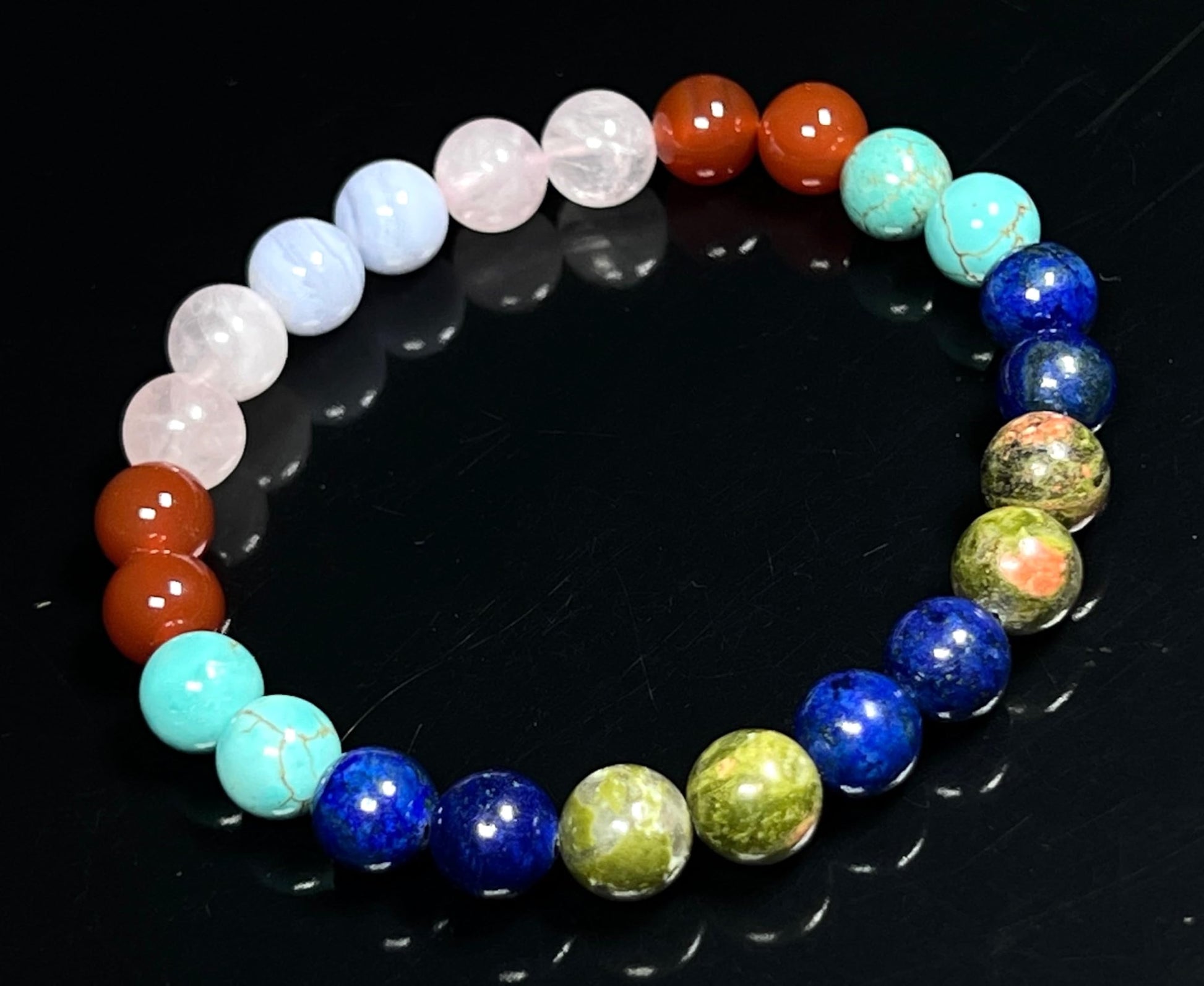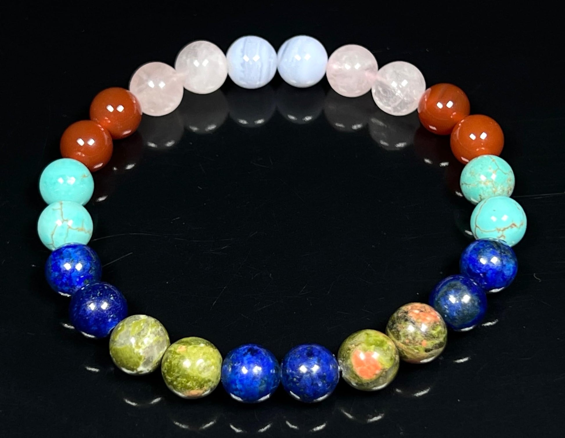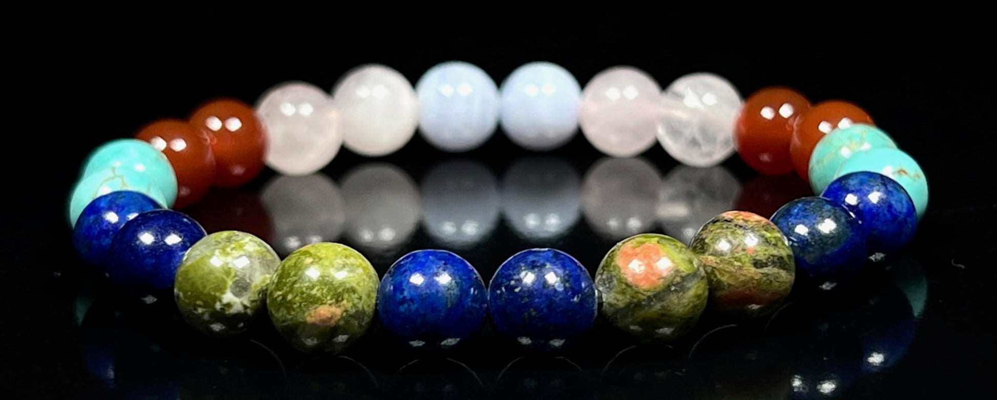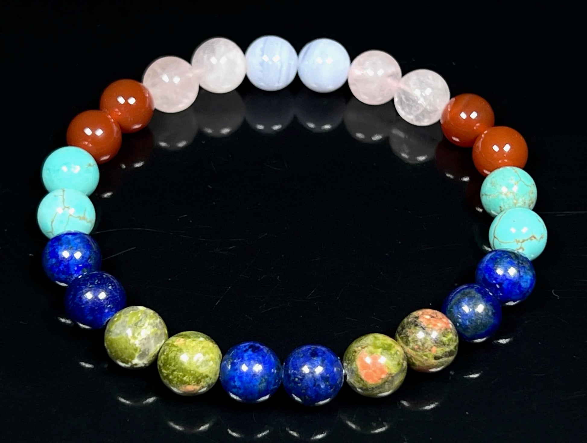 - Celebrate your friendships with this beautiful handmade bracelet featuring six different gemstones. Lapis Lazuli is a stone of wisdom and truth, while Blue Lace Agate promotes calm and tranquility. Carnelian is known for its energy and vitality, and Unakite is believed to bring balance and harmony. Rose Quartz is the stone of unconditional love, and Turquoise is said to bring good fortune and protection.