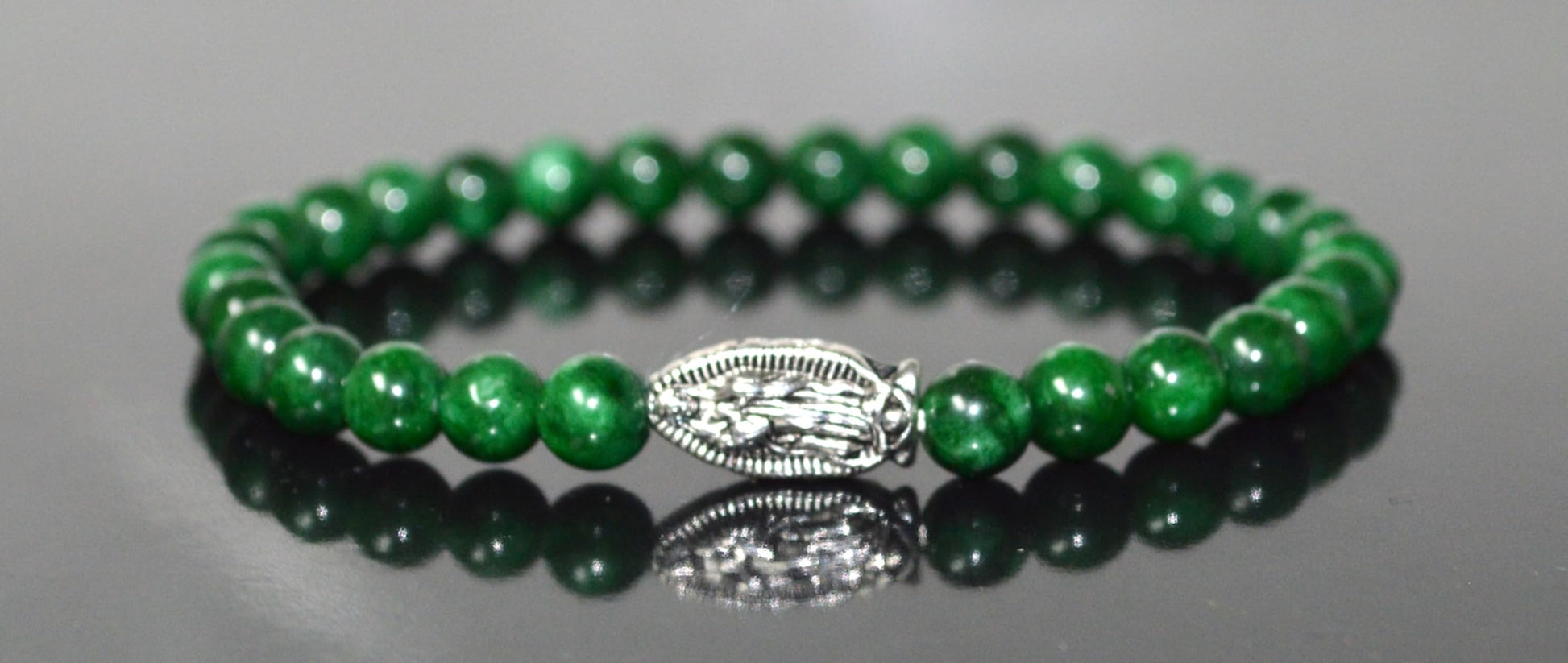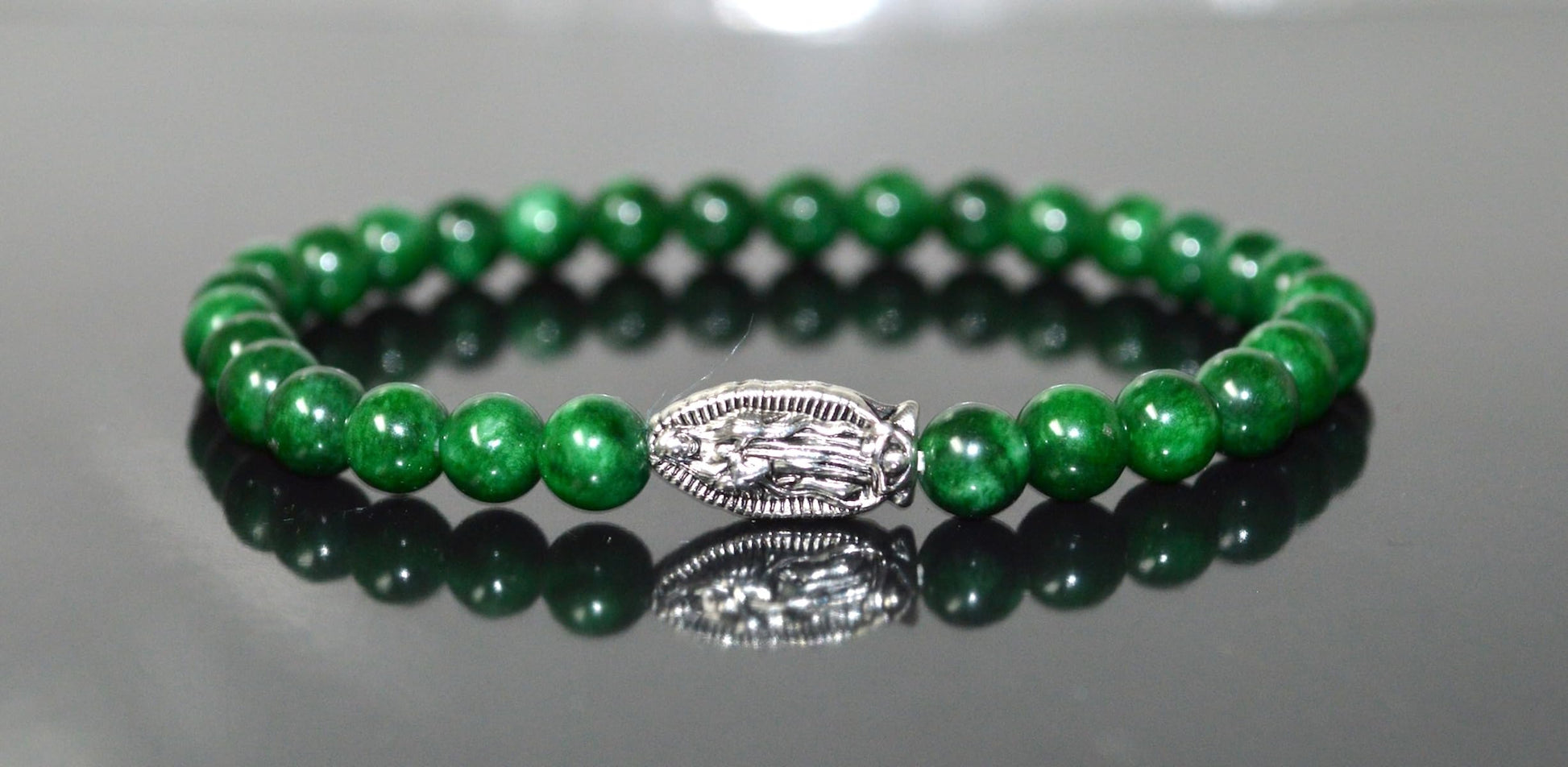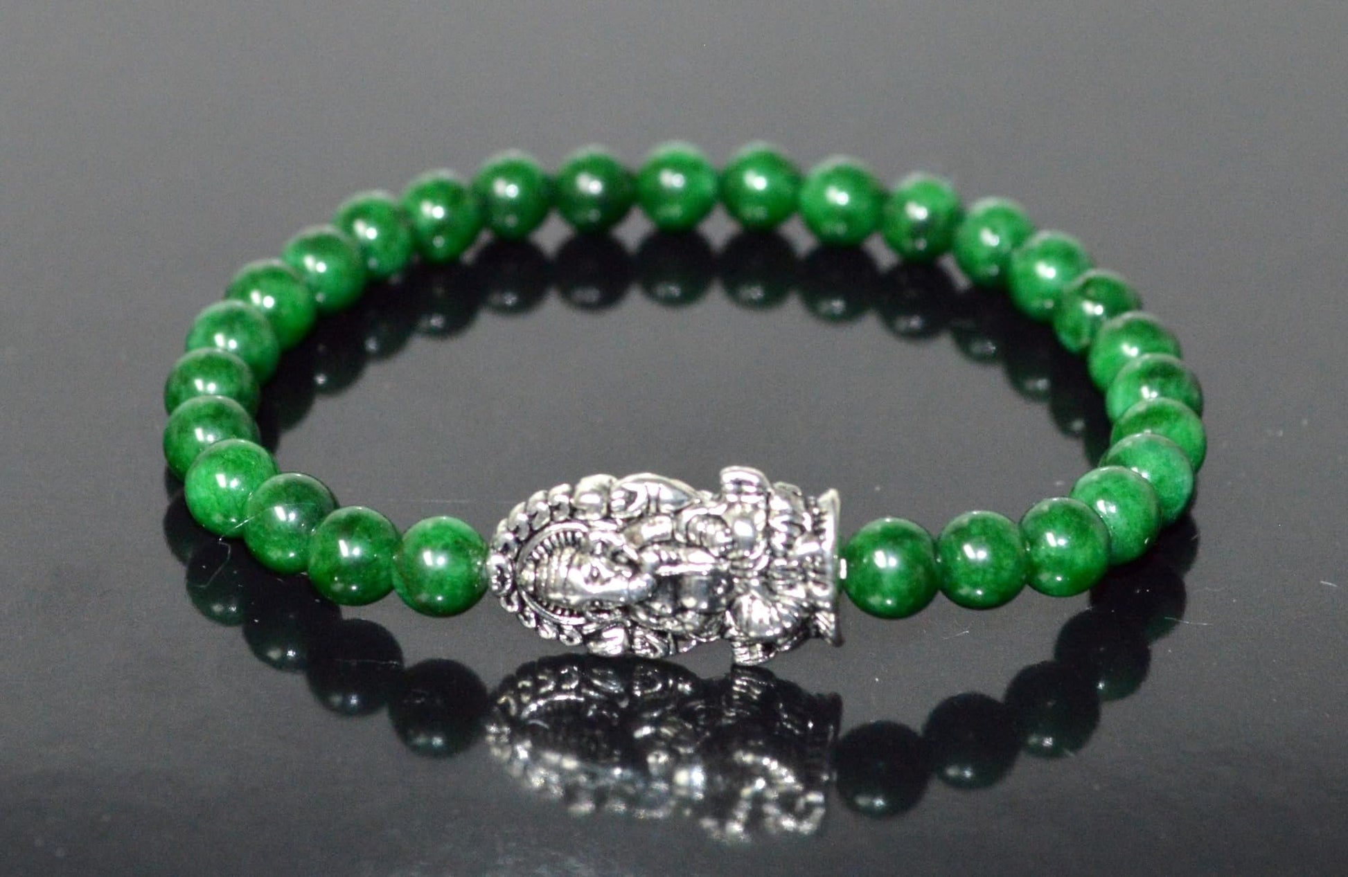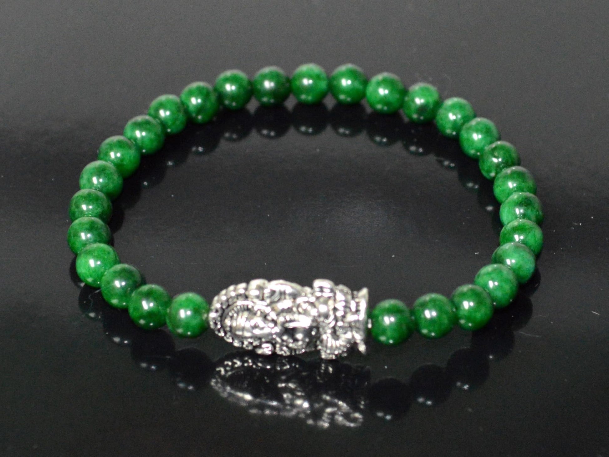 - Key Features: Material: High-quality 6mm green jade beads. Accents: Ganesha, Mother Mary, 2 elephants, and owl centerpieces in silver-finish alloy. Wrist Size: Stretchable, fits wrists from 6 to 9 inches. Birthstone: Green jade is associated with the May birthstone, making this bracelet ideal for Taurus sun signs. Astrological Sign: Taurus (May), Virgo. Chakra Association: Heart Chakra (4th Chakra) - Connected to love, compassion, and emotional balance.