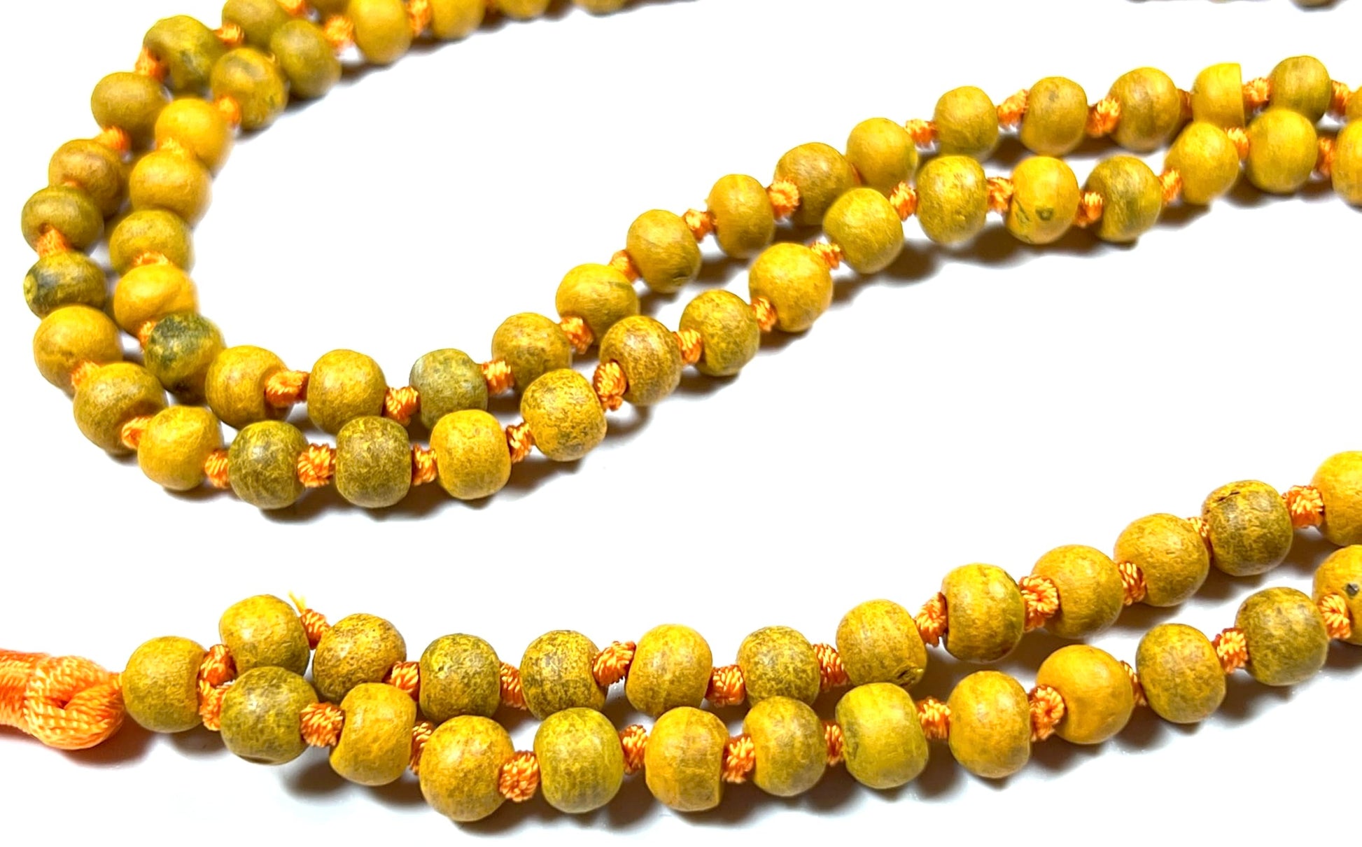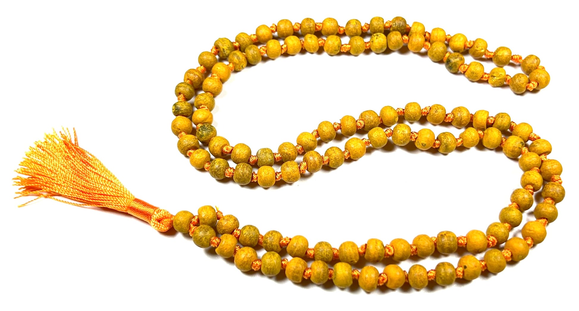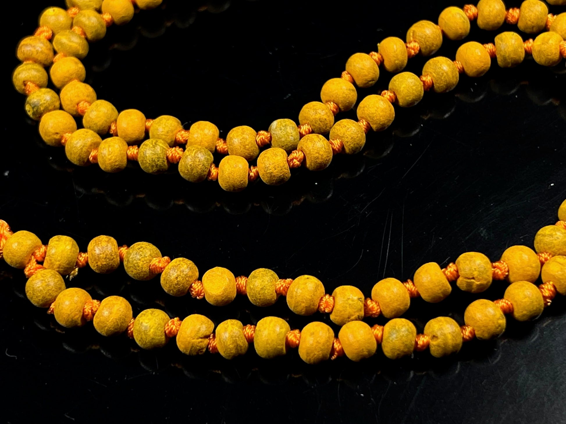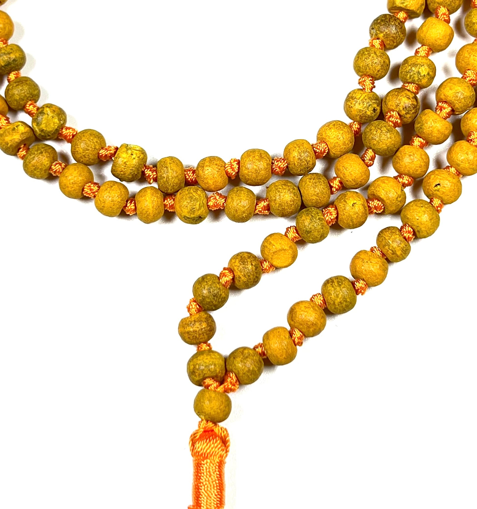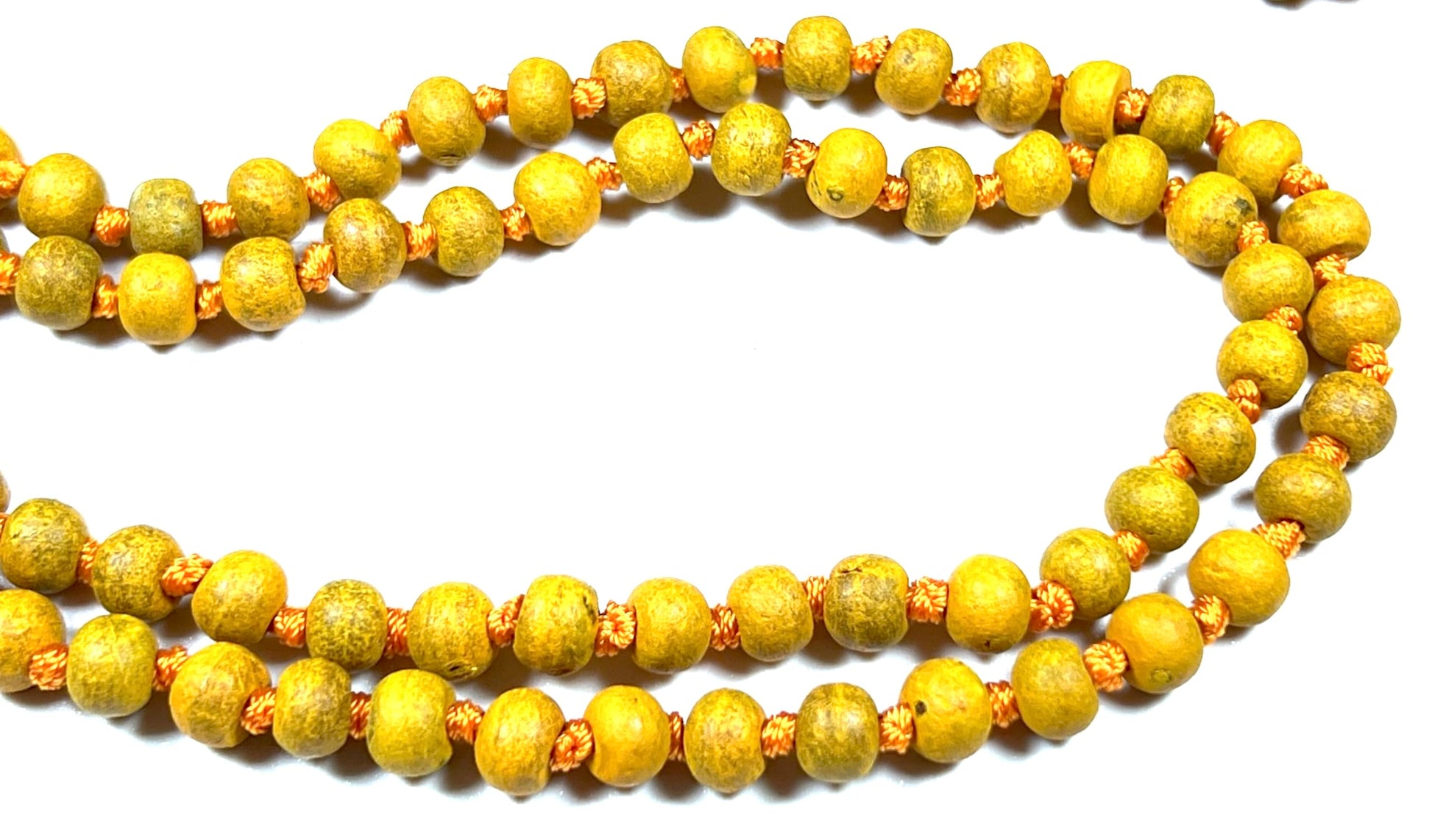 Hand knotted Haldi (Turmeric) mala necklace for Manipura and Svadhisthana chakra healing. Purification, fire rituals, and sacred Ayurvedic energy. 108 beads.