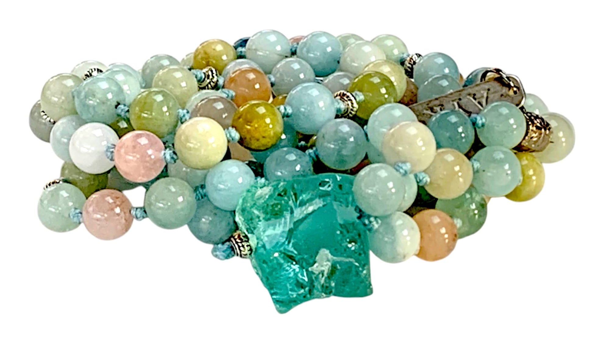 - Wear this talisman to speak your truth with clarity and grace, while staying rooted in compassion. Channel the serene power of flowing waters with our Hand Knotted Amazonite Mala, featuring 108 soothing 8mm beads of natural amazonite in tranquil blue-green hues. Known as the "Stone of Courage and Truth," this mala is a sacred tool for clear communication, emotional balance, and creative flow. Each bead is ethically sourced and meticulously hand-knotted for durability and energetic integrity.