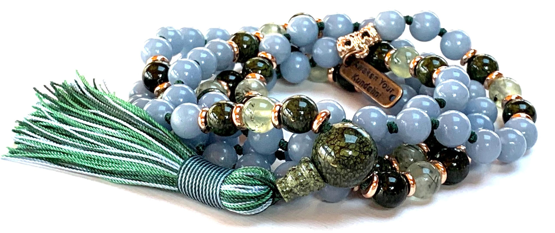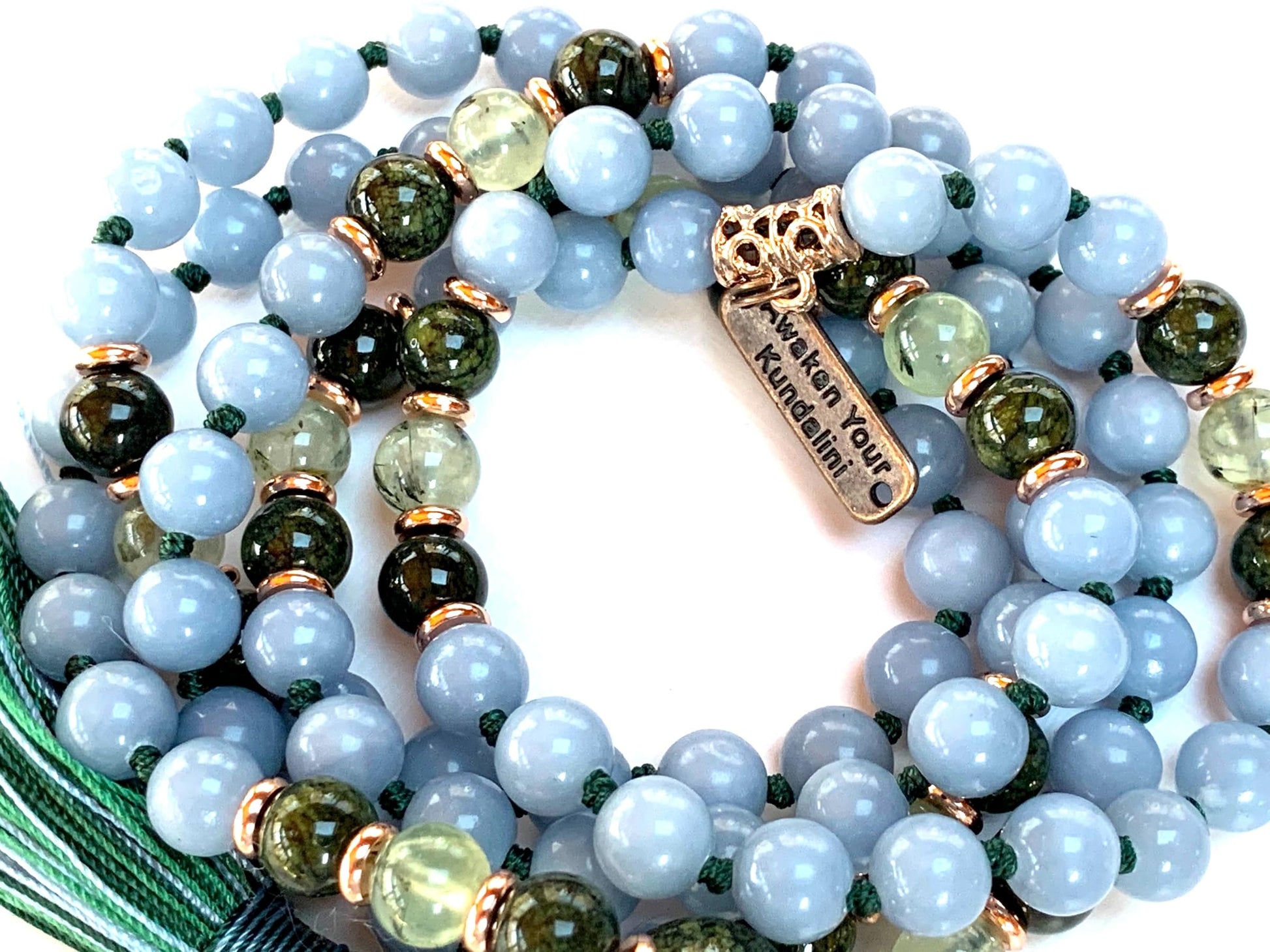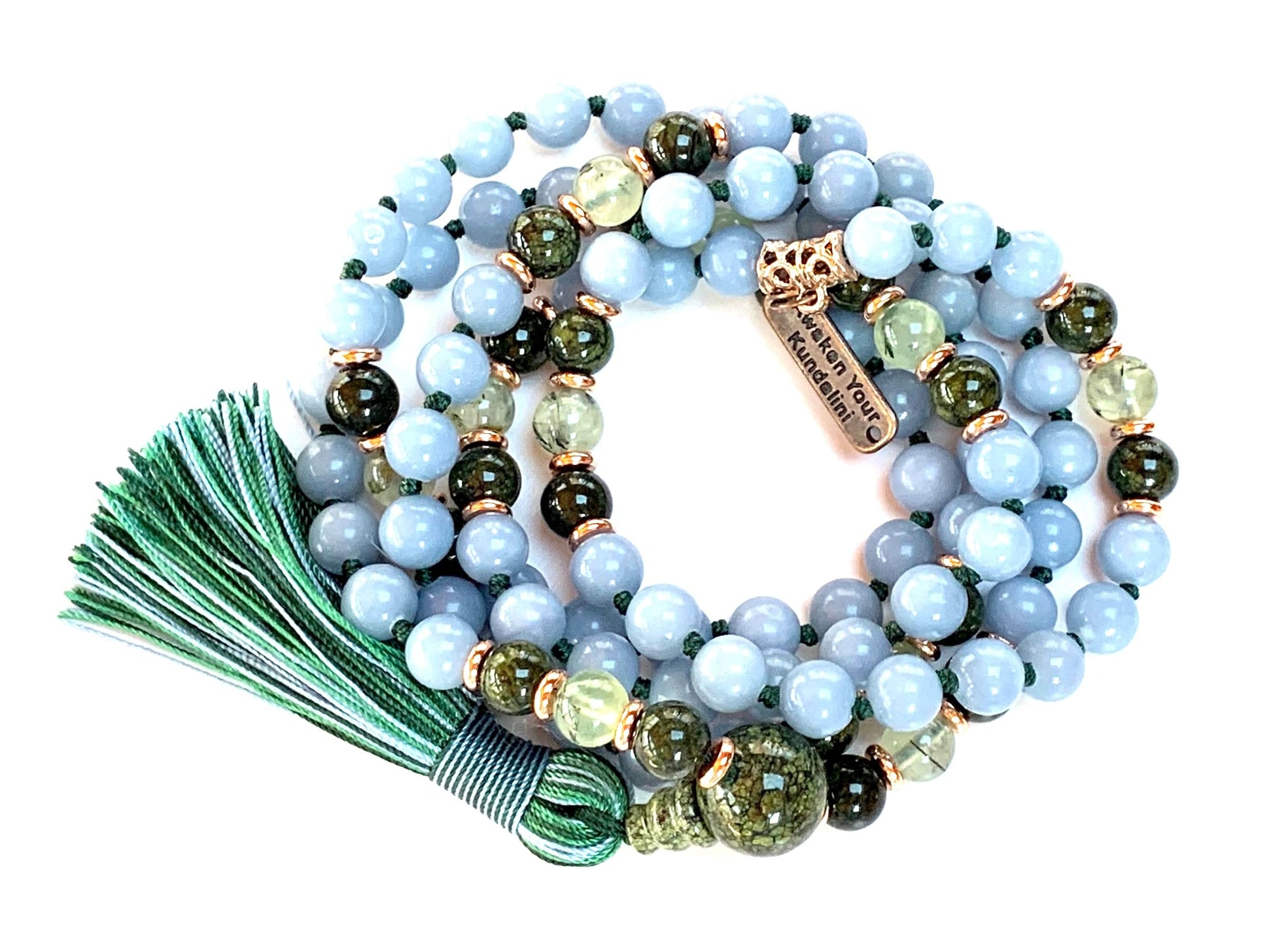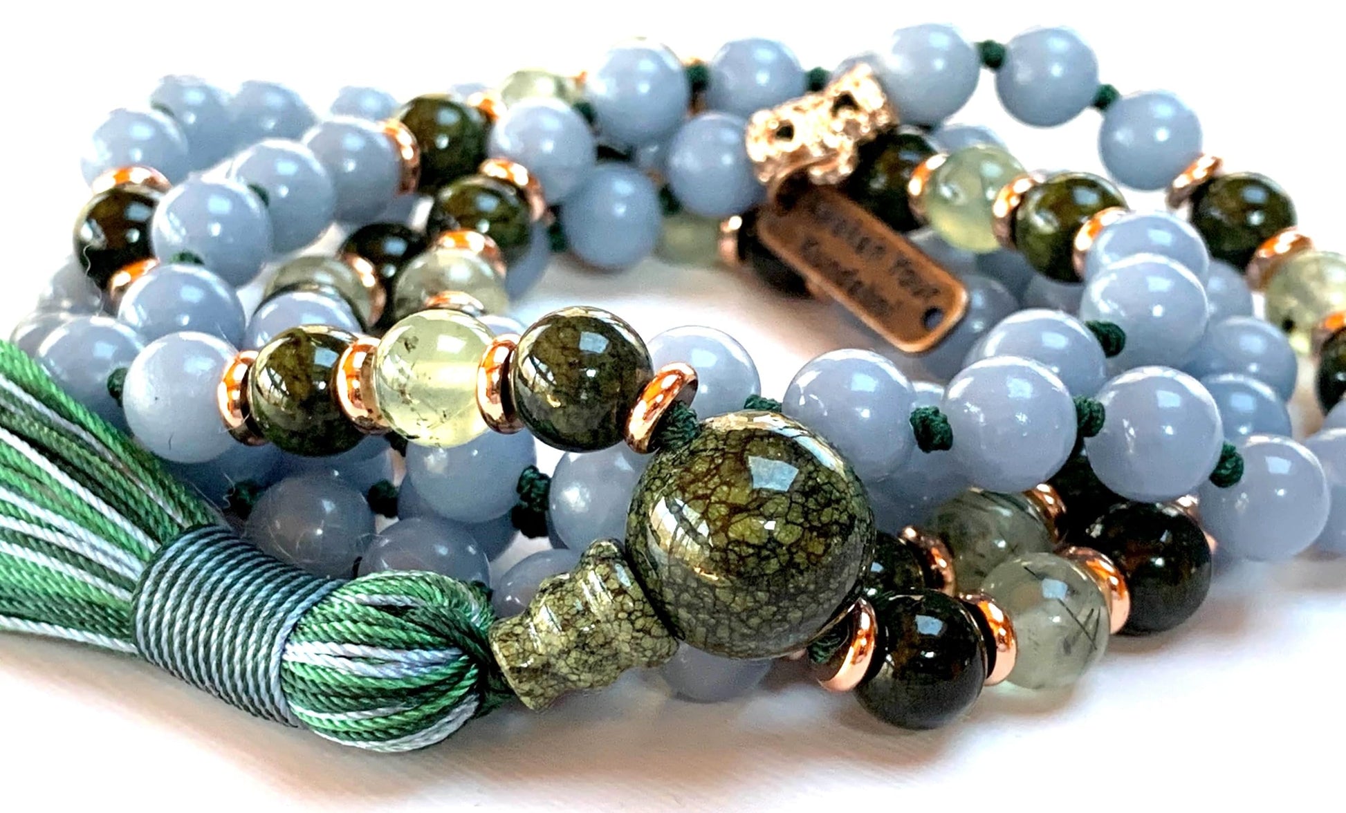 Angelite, Prehnite,& Serpentine Mala Necklace 8mm 108 Beads | Heart & Throat Chakras | MOUNA Collection
