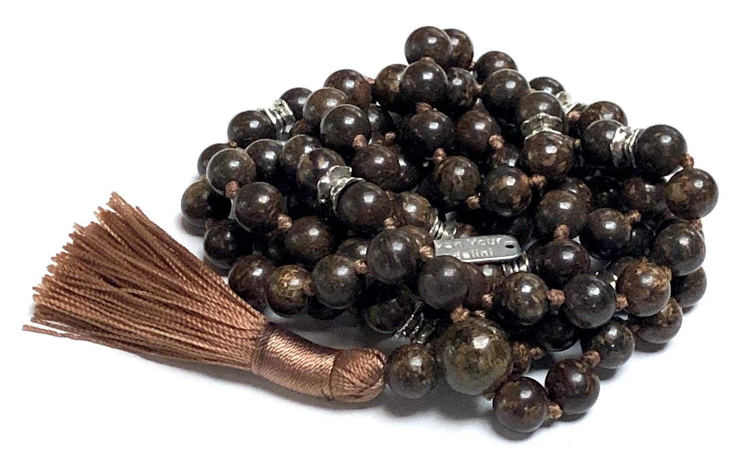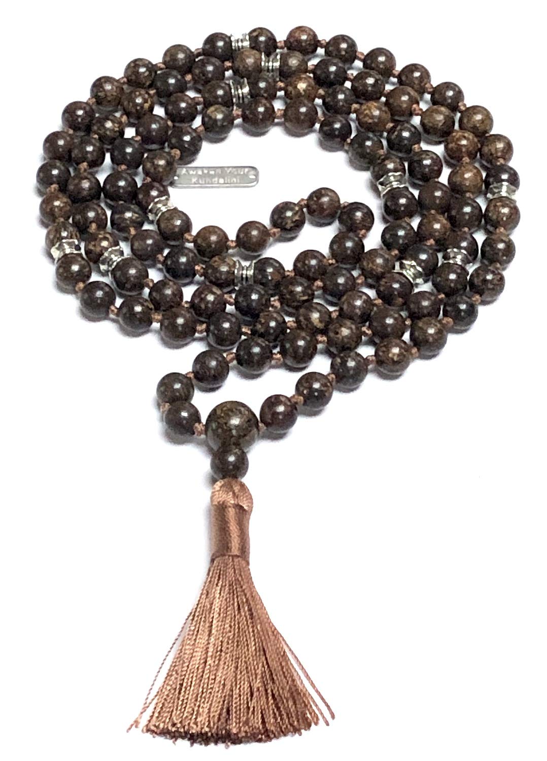 - Embrace Grounding Energy with our Hand Knotted Bronzite Mala Necklace. This stunning necklace features 108 hand-knotted 8mm Bronzite beads, complemented by elegant zinc alloy spacers, designed to bring stability, protection, and courage into your life. Perfect for meditation, prayer, or as a stylish accessory, this mala necklace is a harmonious blend of beauty and spirituality.