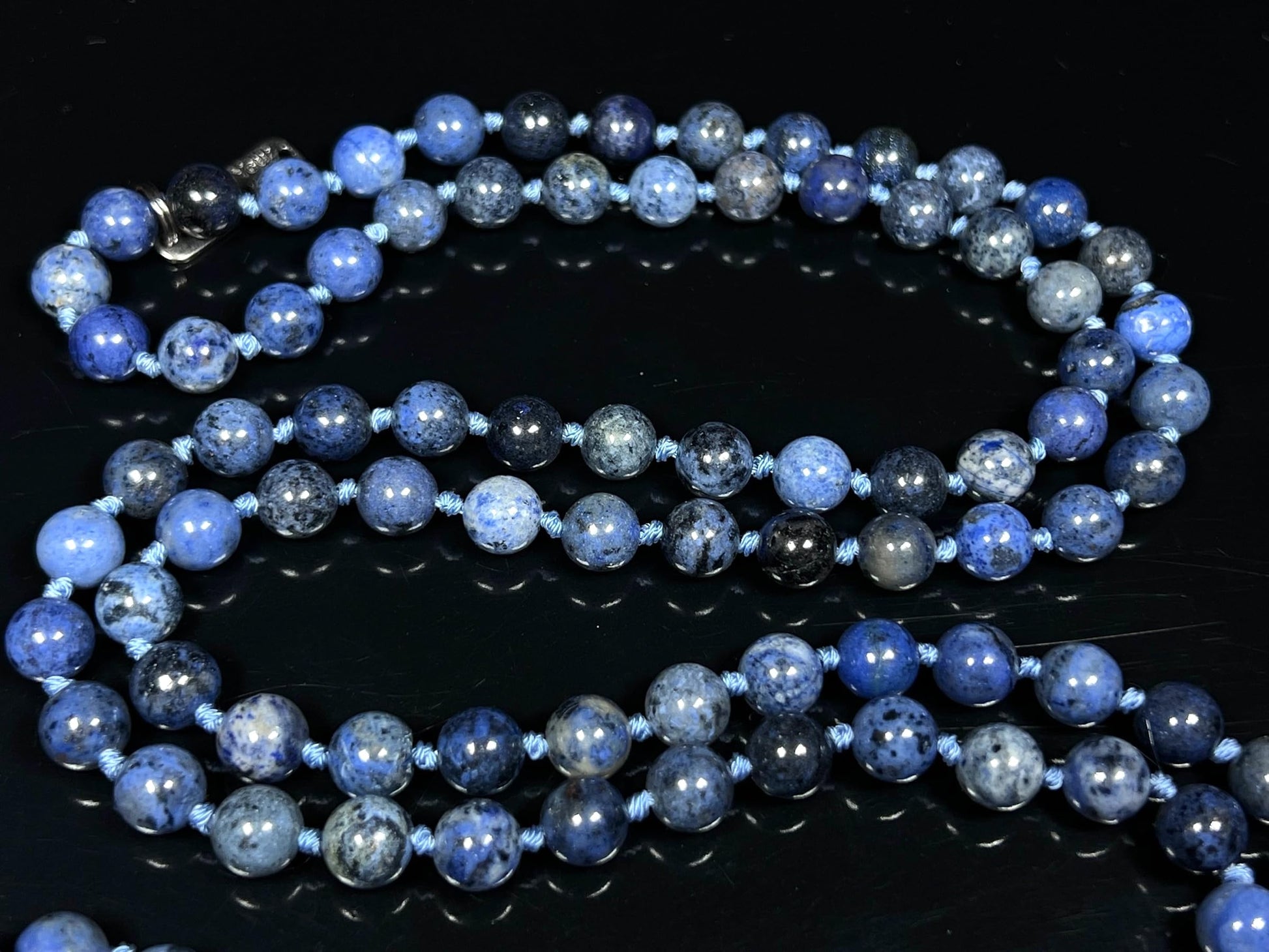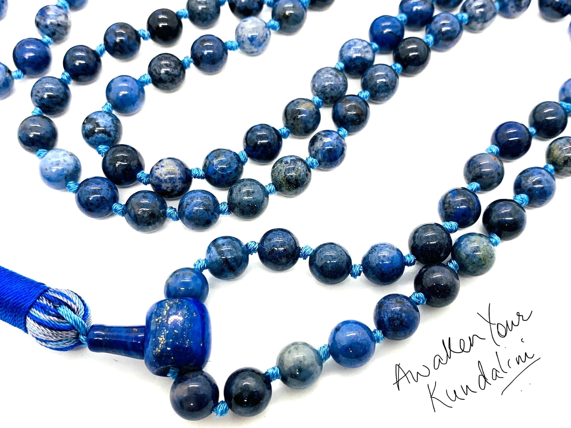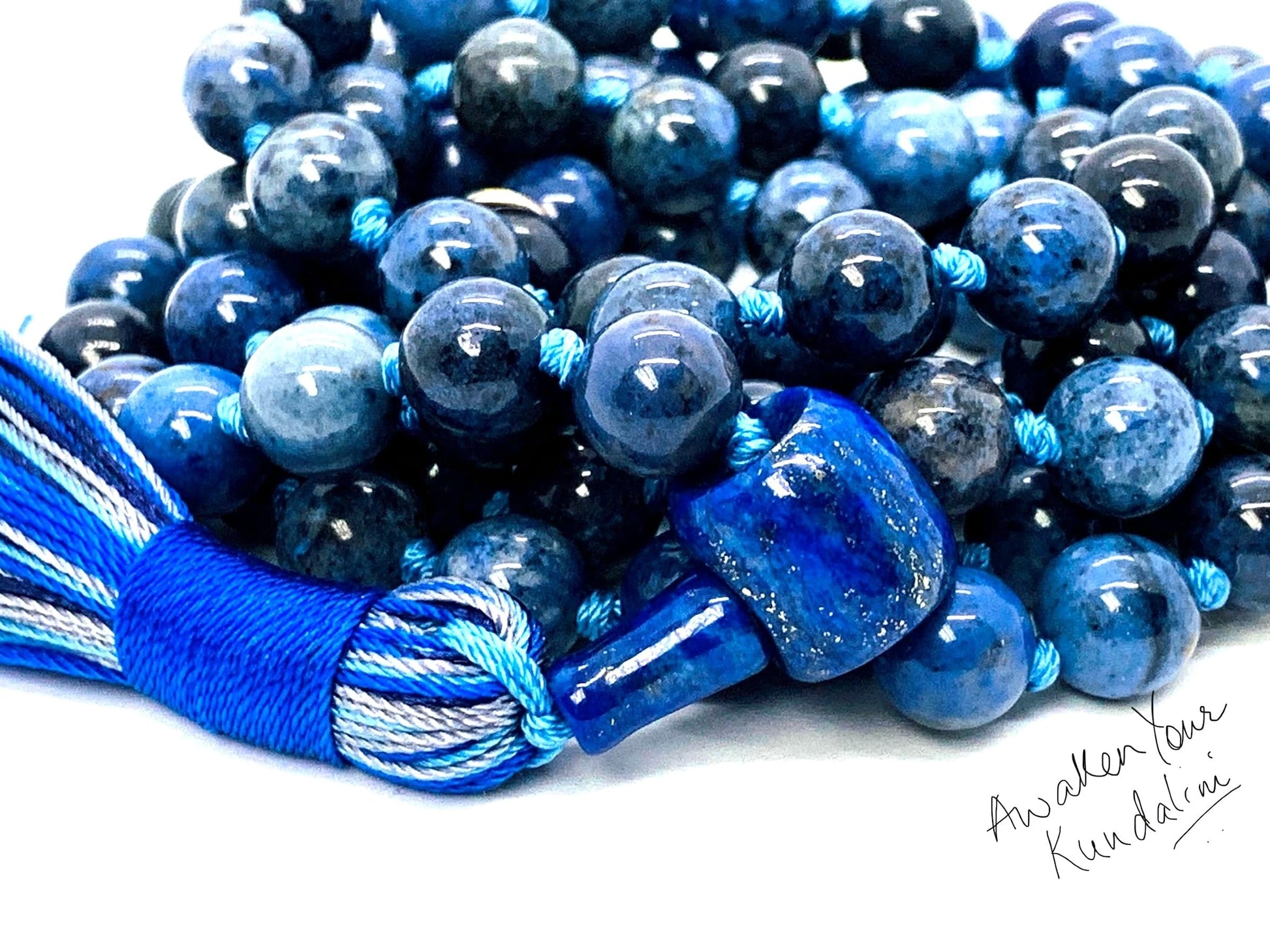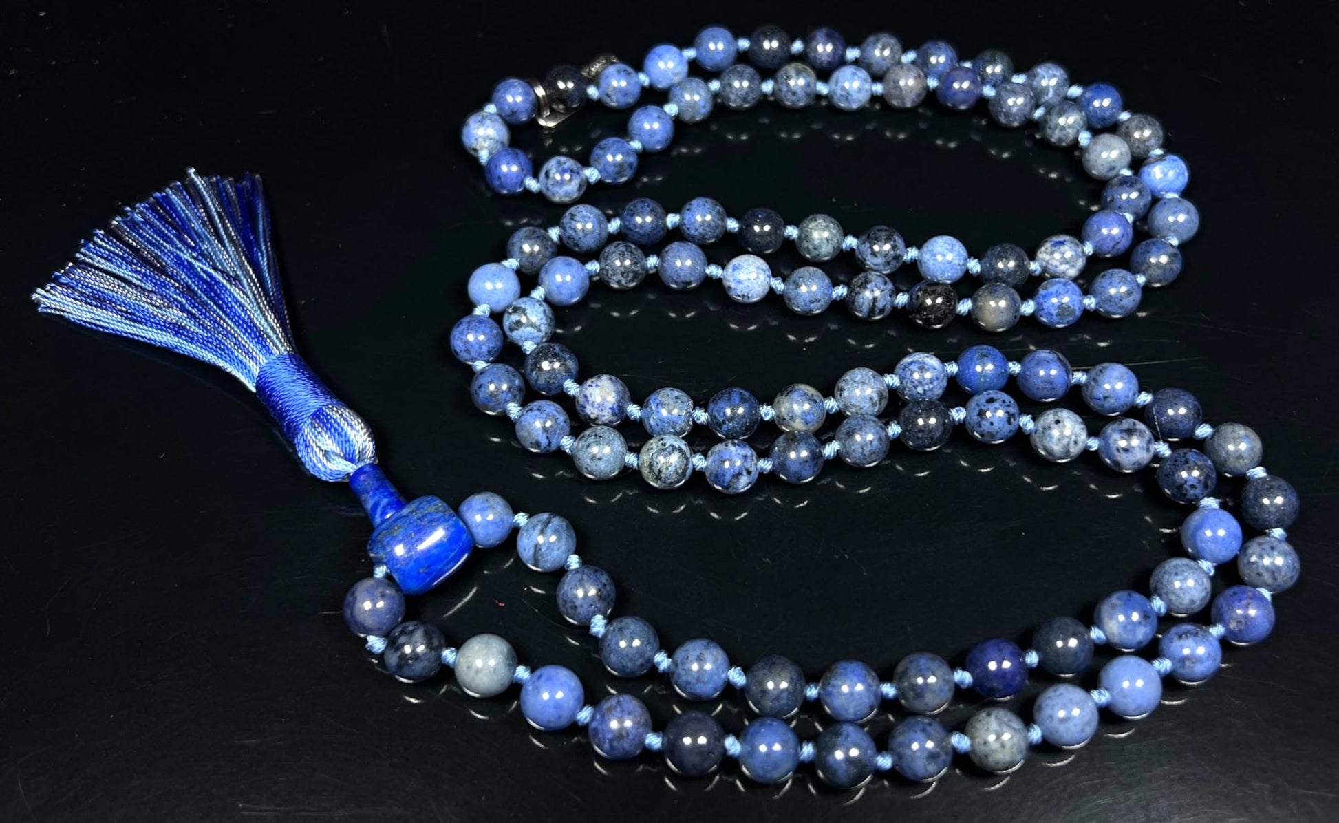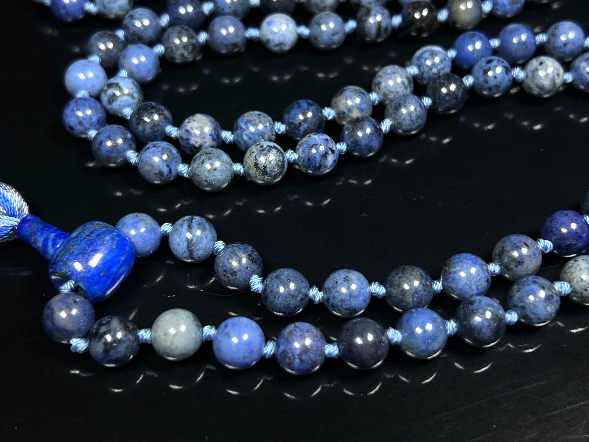 - 💎 Why This Mala Resonates: ✔ Third Eye & Throat Chakra Synergy – Enhances intuition while supporting authentic expression. ✔ September Birthstone Alternative – A unique companion to traditional sapphire energy. ✔ Natural Denim-Blue Hue – Rare stone with mesmerizing mineral patterns in each bead. ✔ Substantial 8mm Beads – Ideal weight for meditation and daily wear. ✔ Hand-Knotted with Intention – Nylon-strung for durability between each bead.