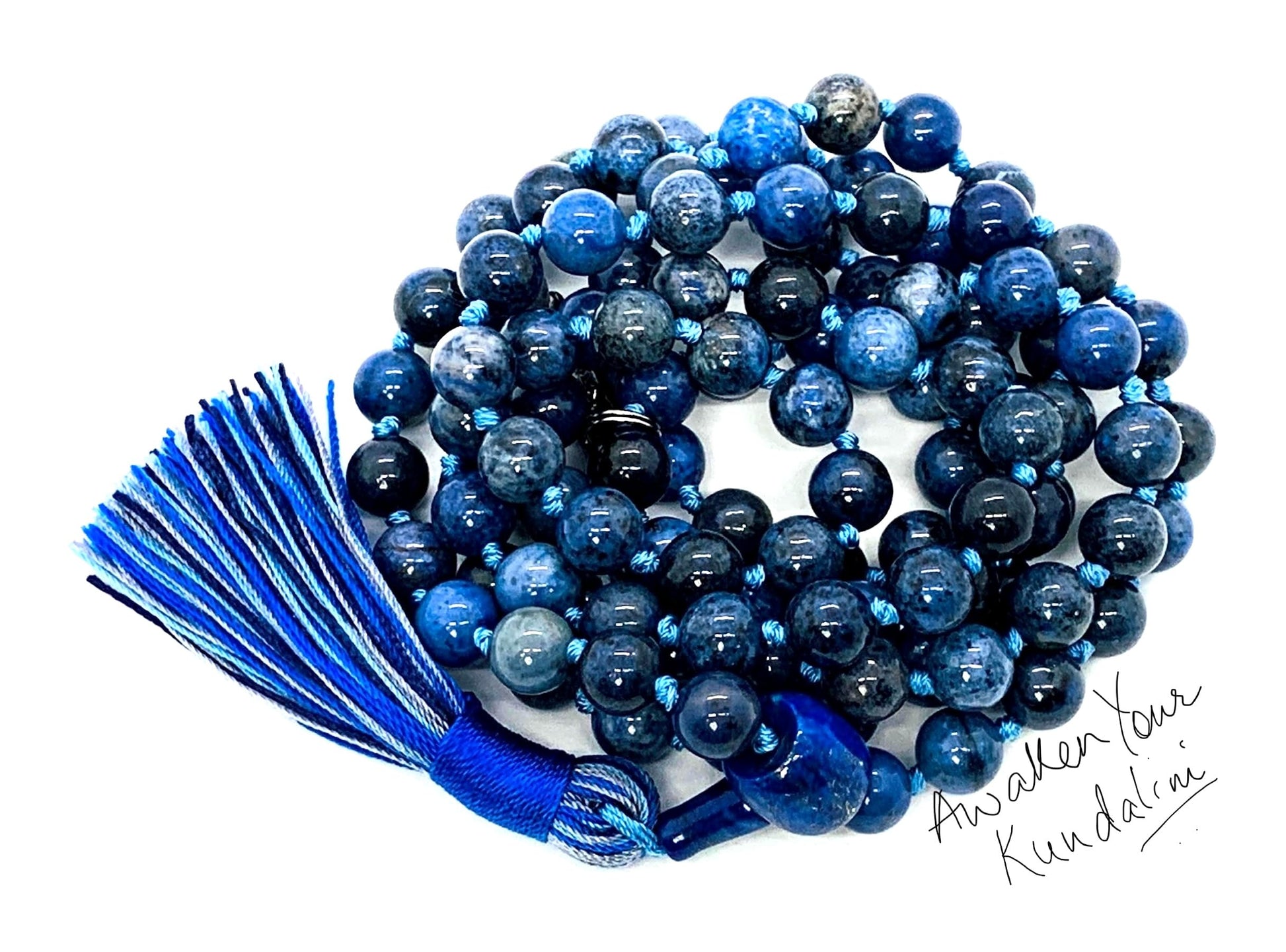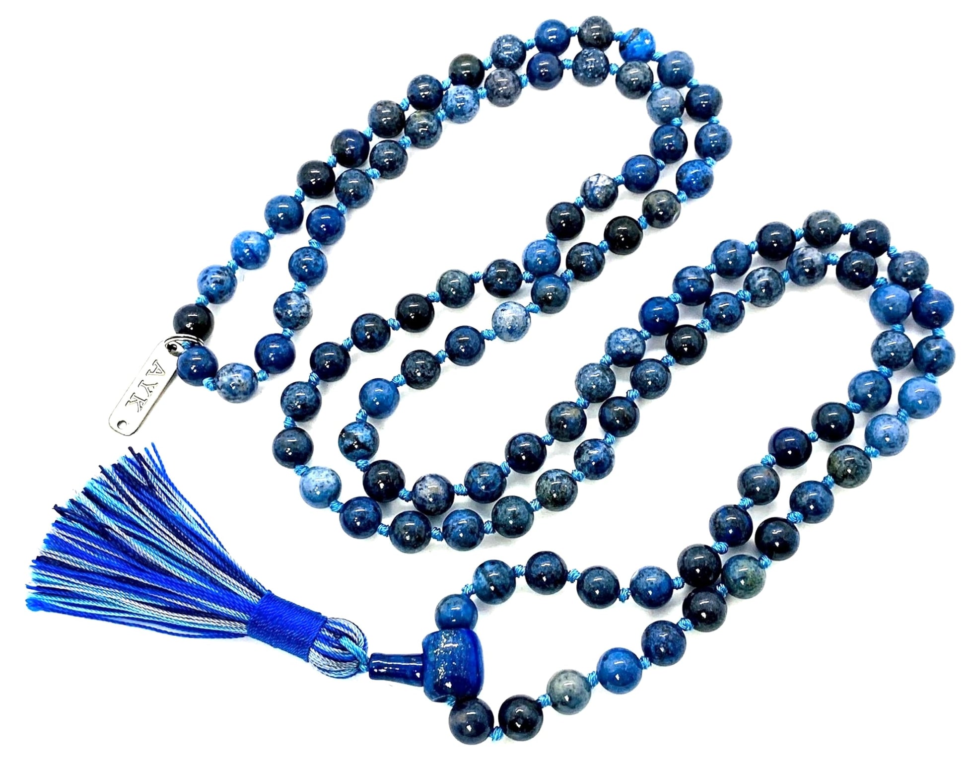 Hand Knotted Dumortierite Mala Necklace – 8mm | 108 Beads | Third Eye & Throat Chakras | September Birthstone Energy | Stone of Mental Clarity & Patience | Ethically Sourced