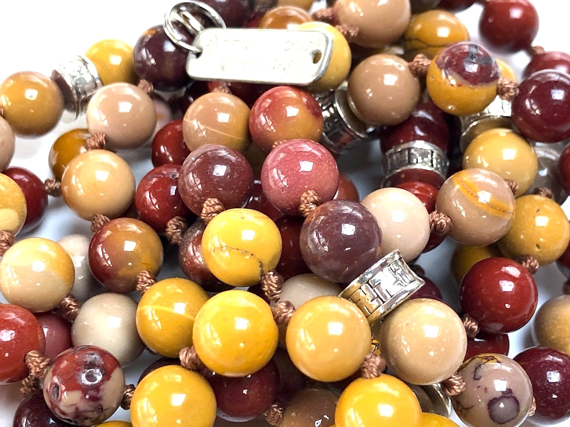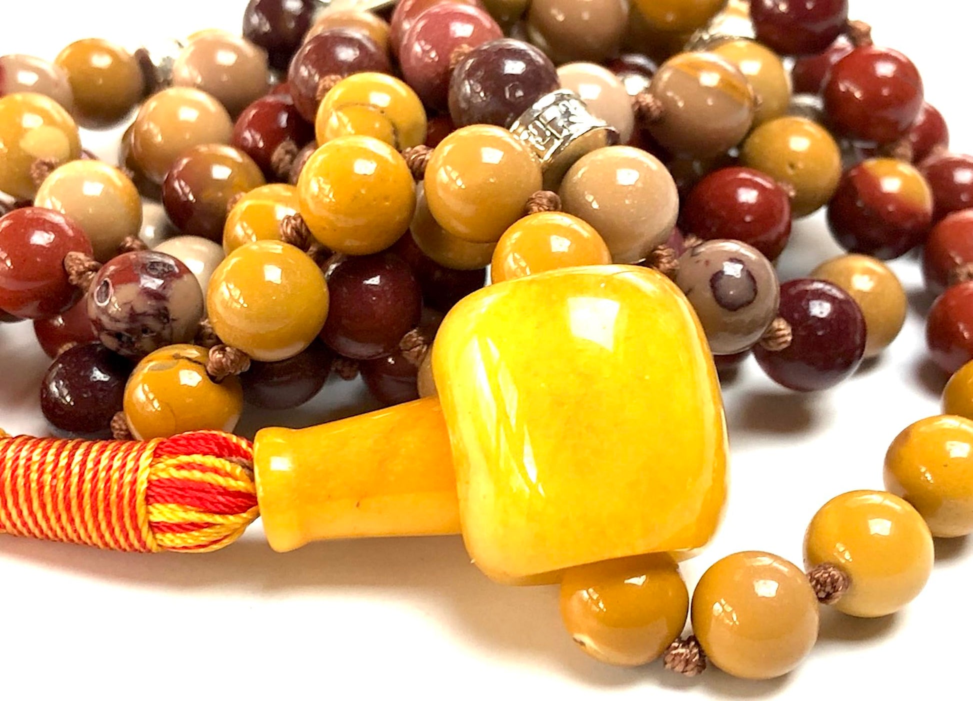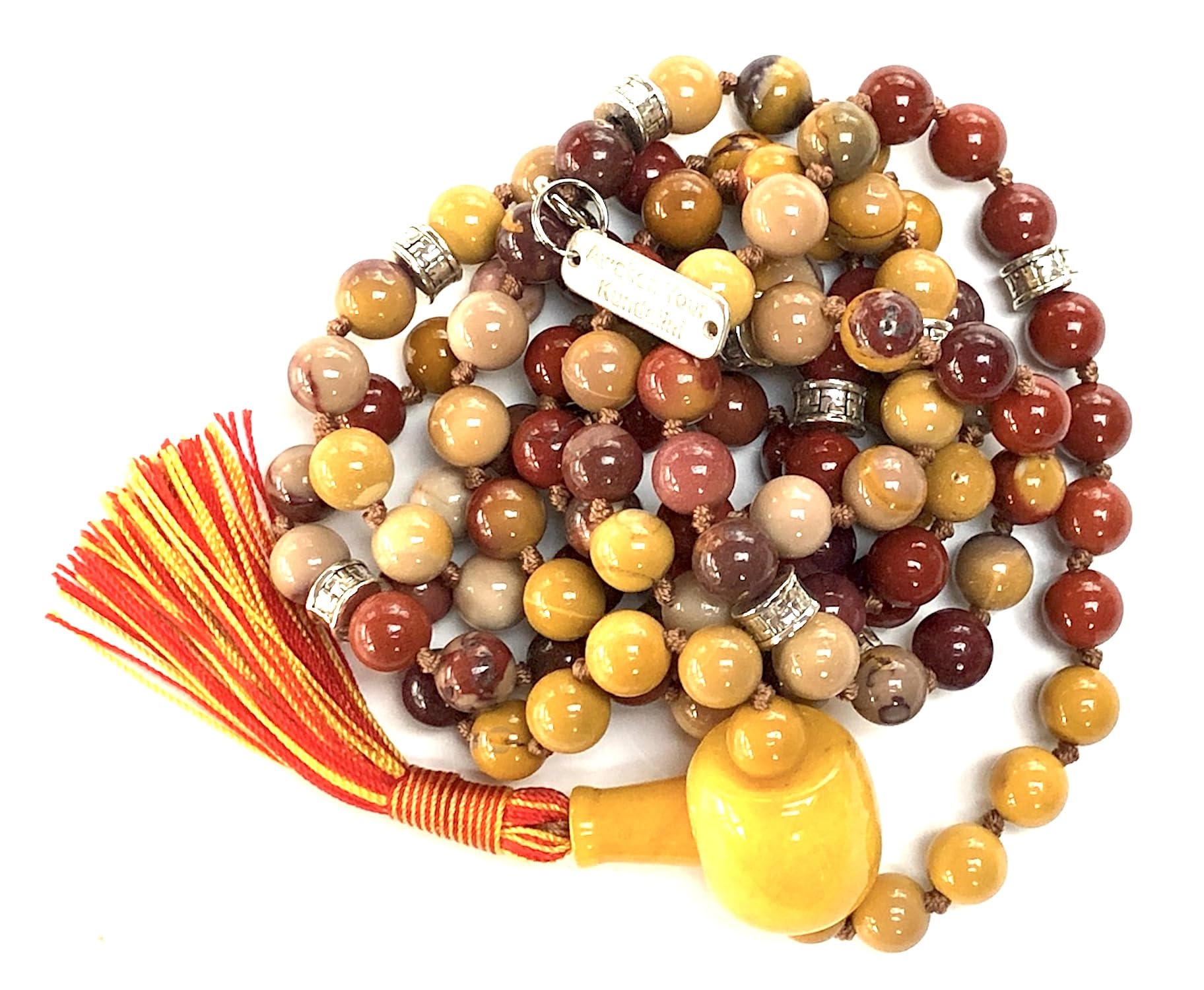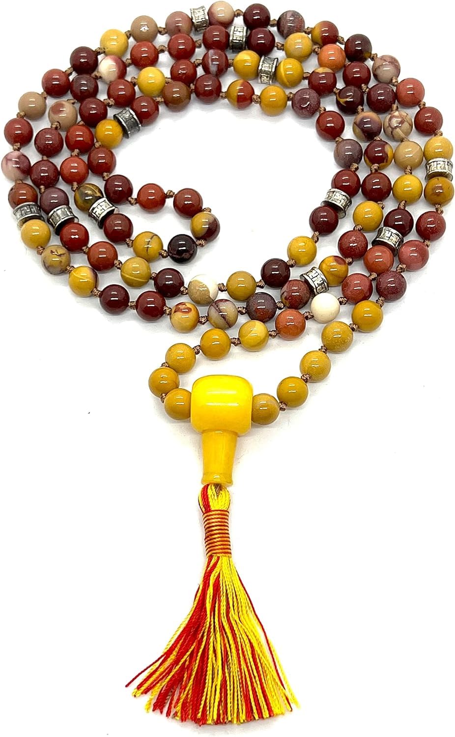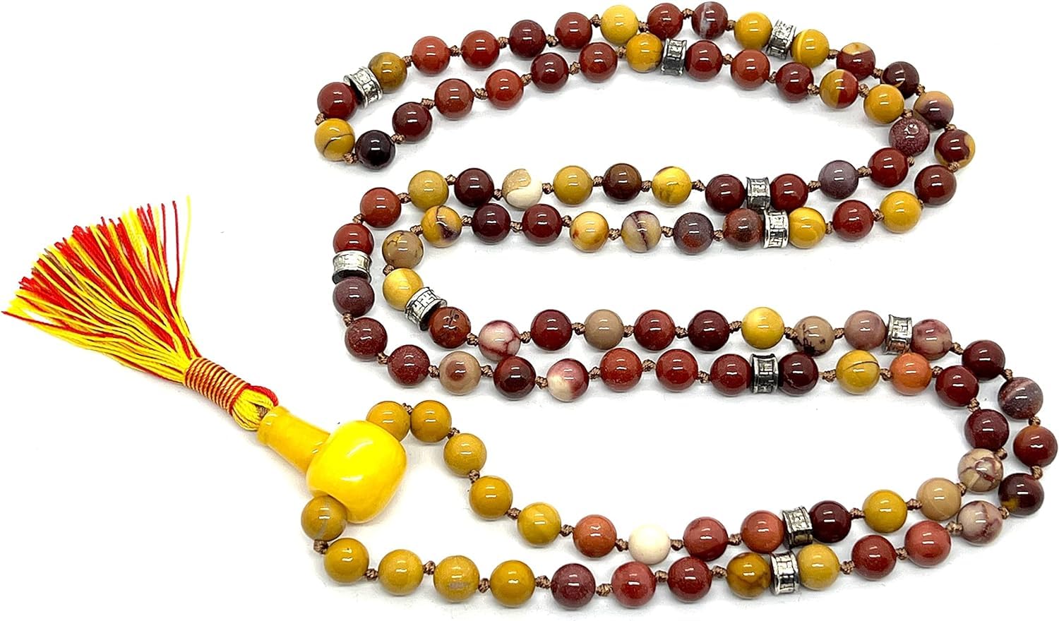 - Discover Grounding Energy with our Hand Knotted Mookaite Mala Necklace. This exquisite necklace features 108 hand-knotted 8mm Mookaite beads, accented by stylish zinc alloy spacers, designed to provide stability, strength, and connection to the Earth. Ideal for meditation, prayer, or as a beautiful accessory, this mala necklace seamlessly blends elegance with spirituality. Authentic Gemstones: Beads Size 8mm; Mala Length: Approx 44-46 Inches.