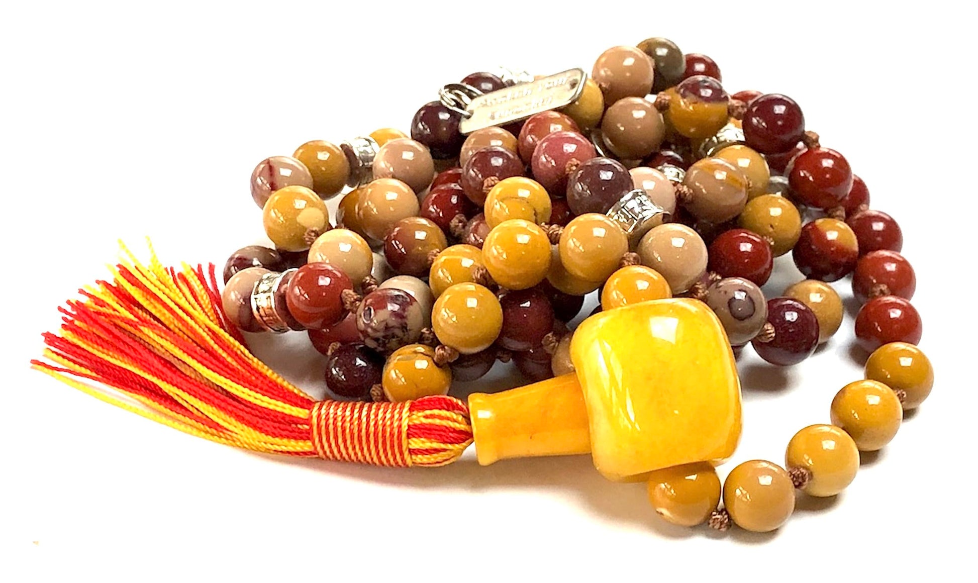- Key Features: Hand Knotted for durability and flexibility 108 8mm Mookaite beads: Each bead is unique and carefully selected Zinc Alloy Spacers for added elegance and durability Root Chakra healing to support grounding and stability Strengthening properties to promote resilience and connection Versatile design for meditation, prayer, or everyday elegance