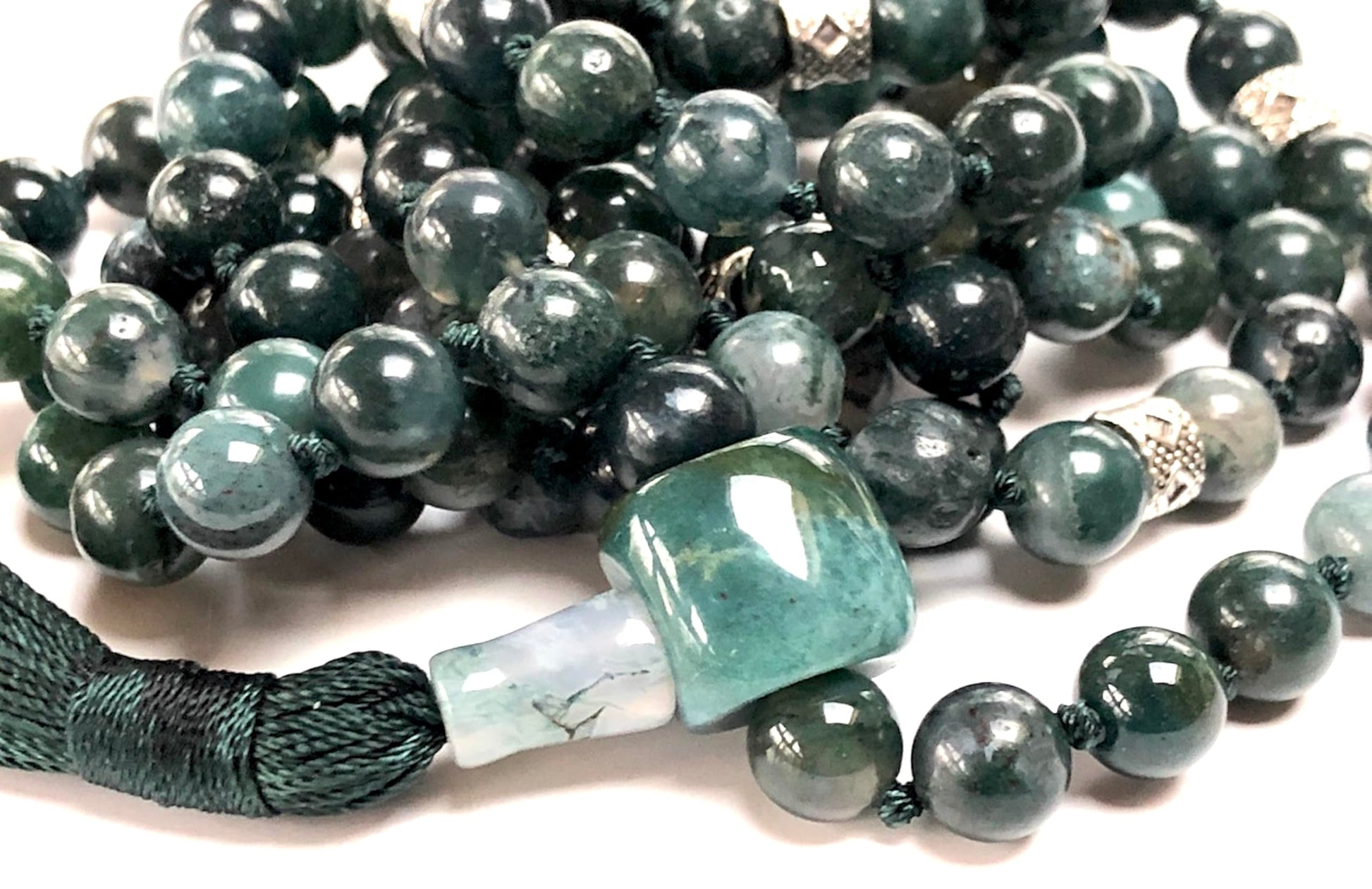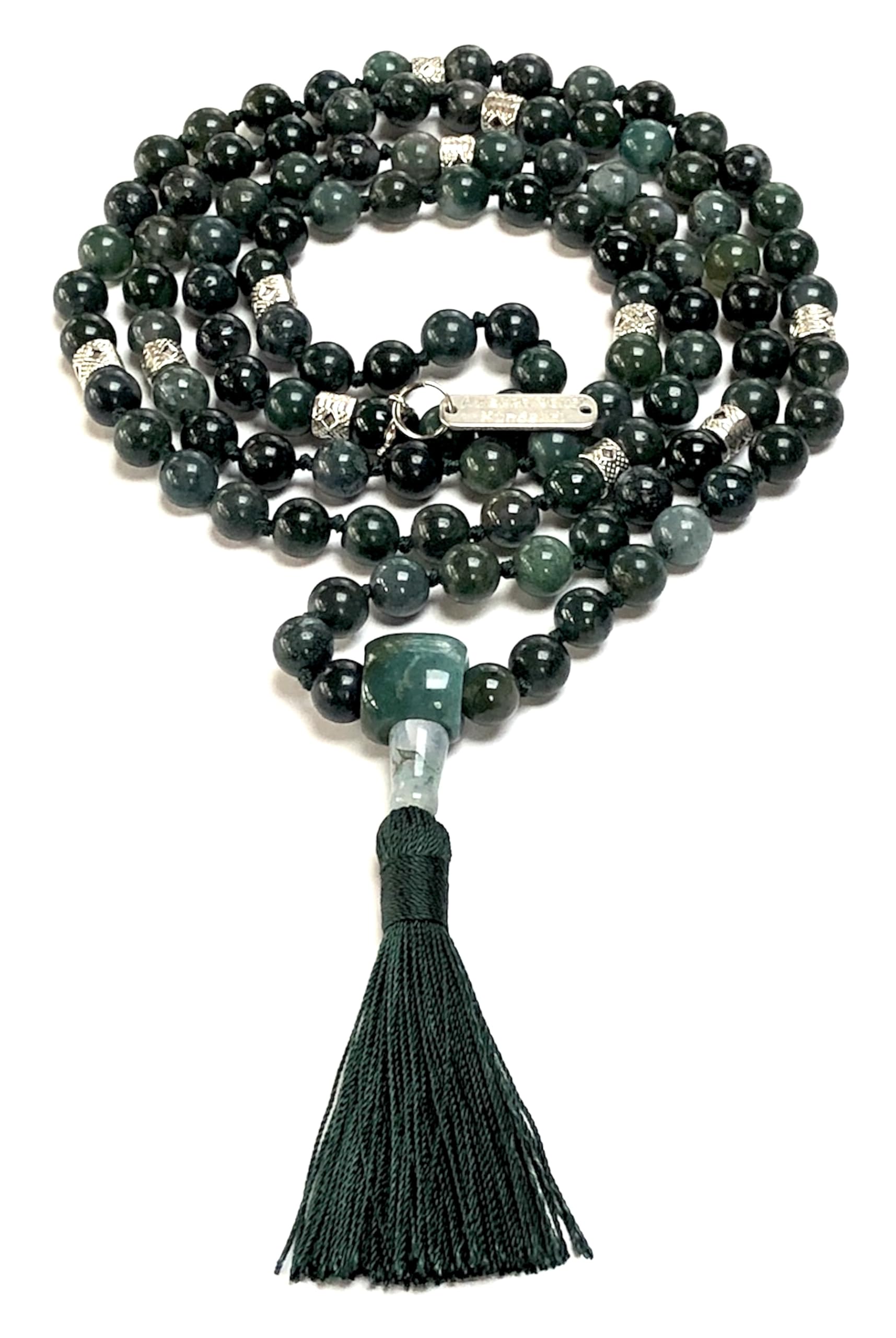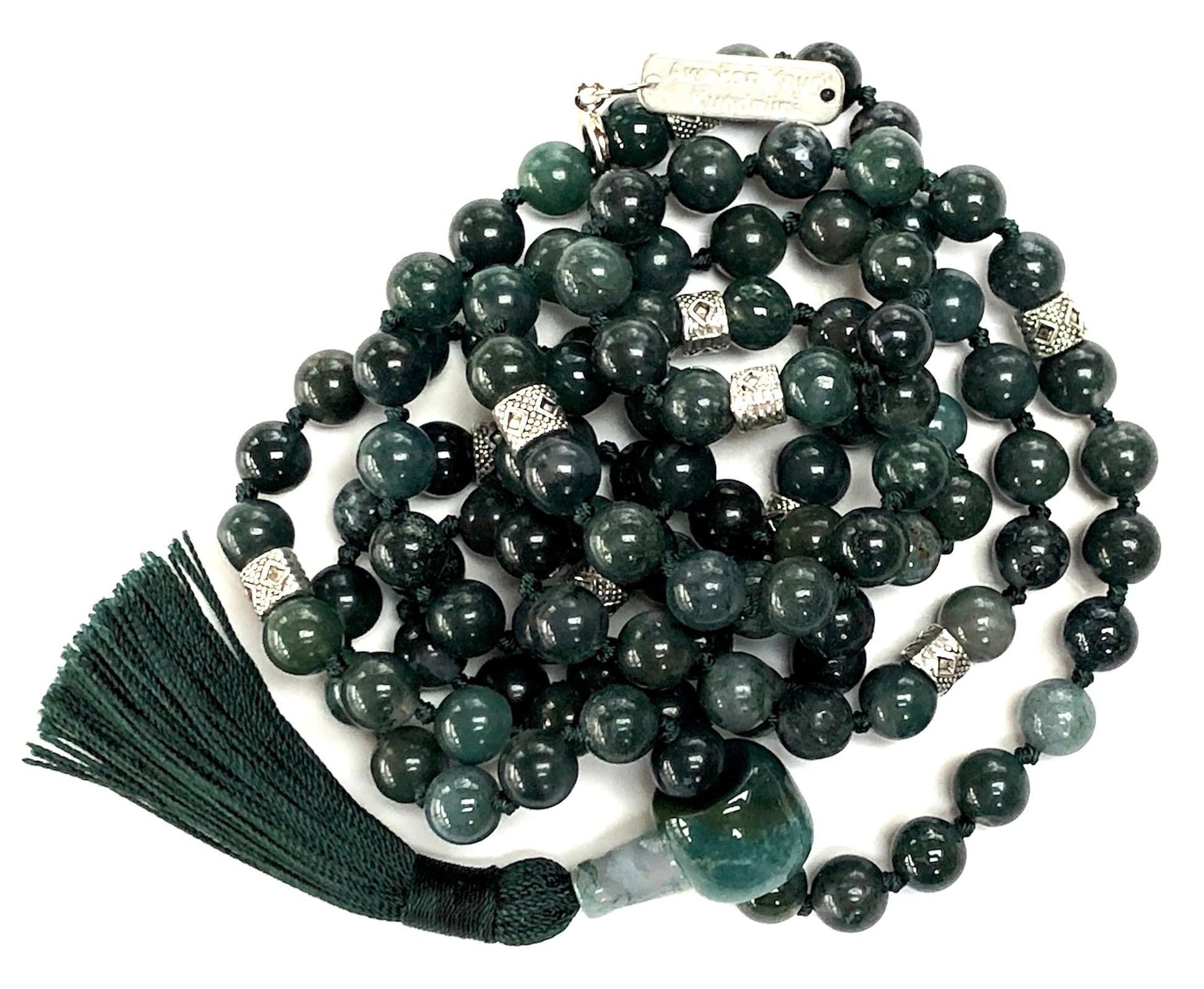 - Embrace Inner Peace & Cultivate Self-Love with Authentic Practice Experience the calming energy of moss agate with this beautiful, hand-knotted 108-bead mala necklace. Featuring genuine 8mm moss agate beads accented with sleek zinc alloy spacers, this piece offers a traditional and meaningful way to promote Heart Chakra balance and inner well-being.