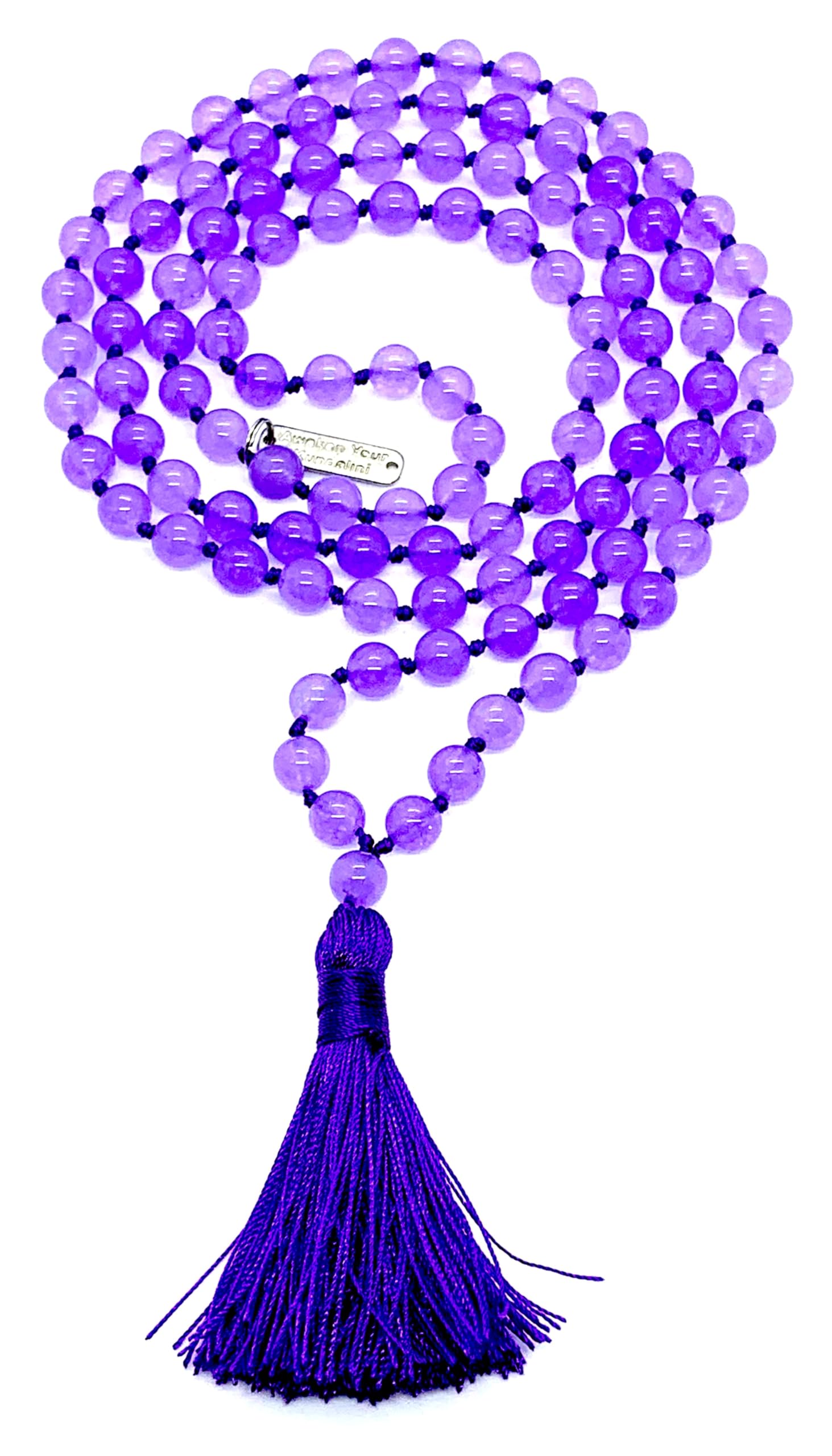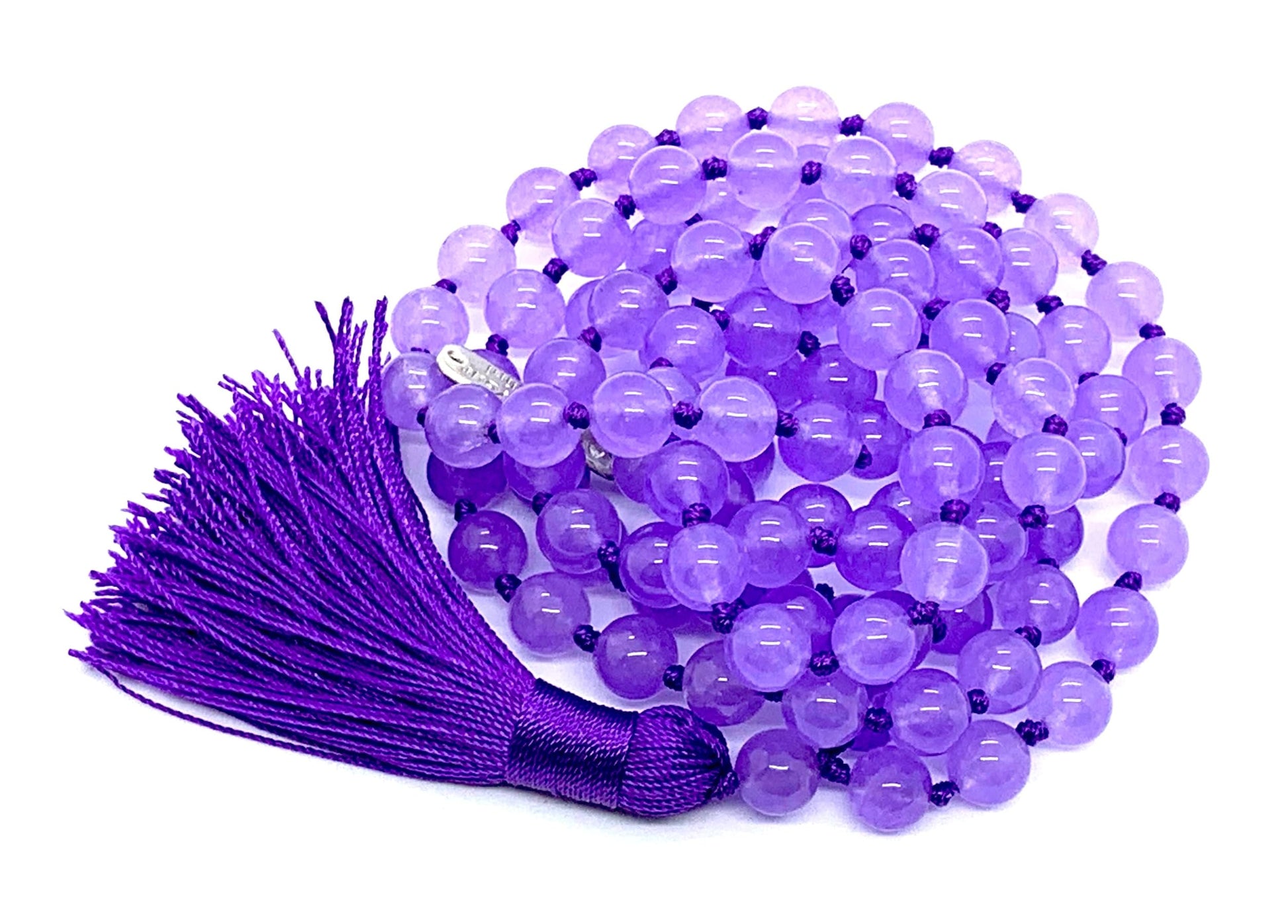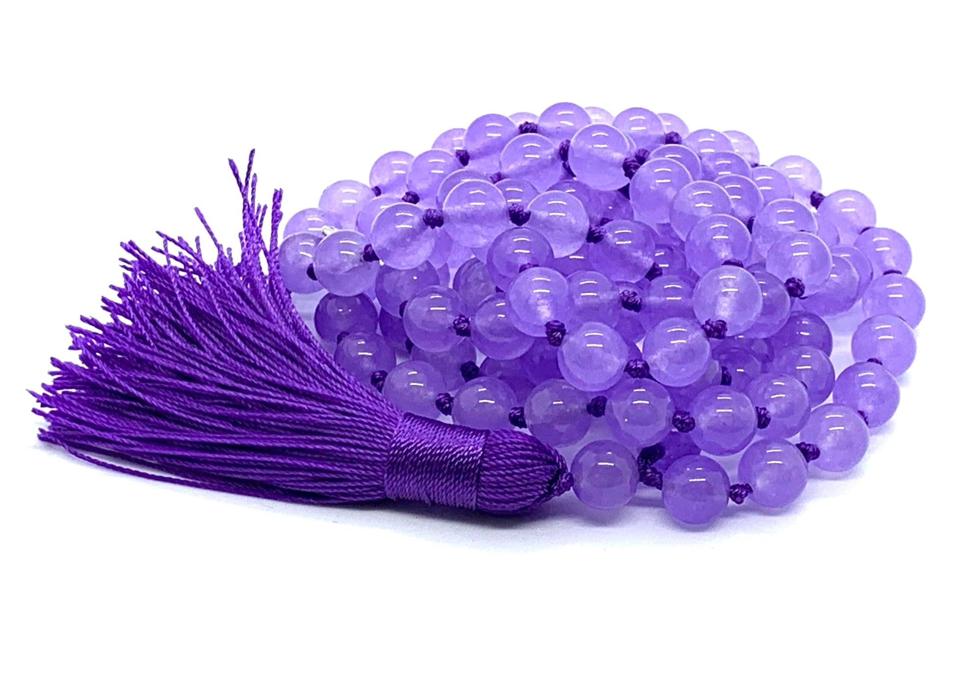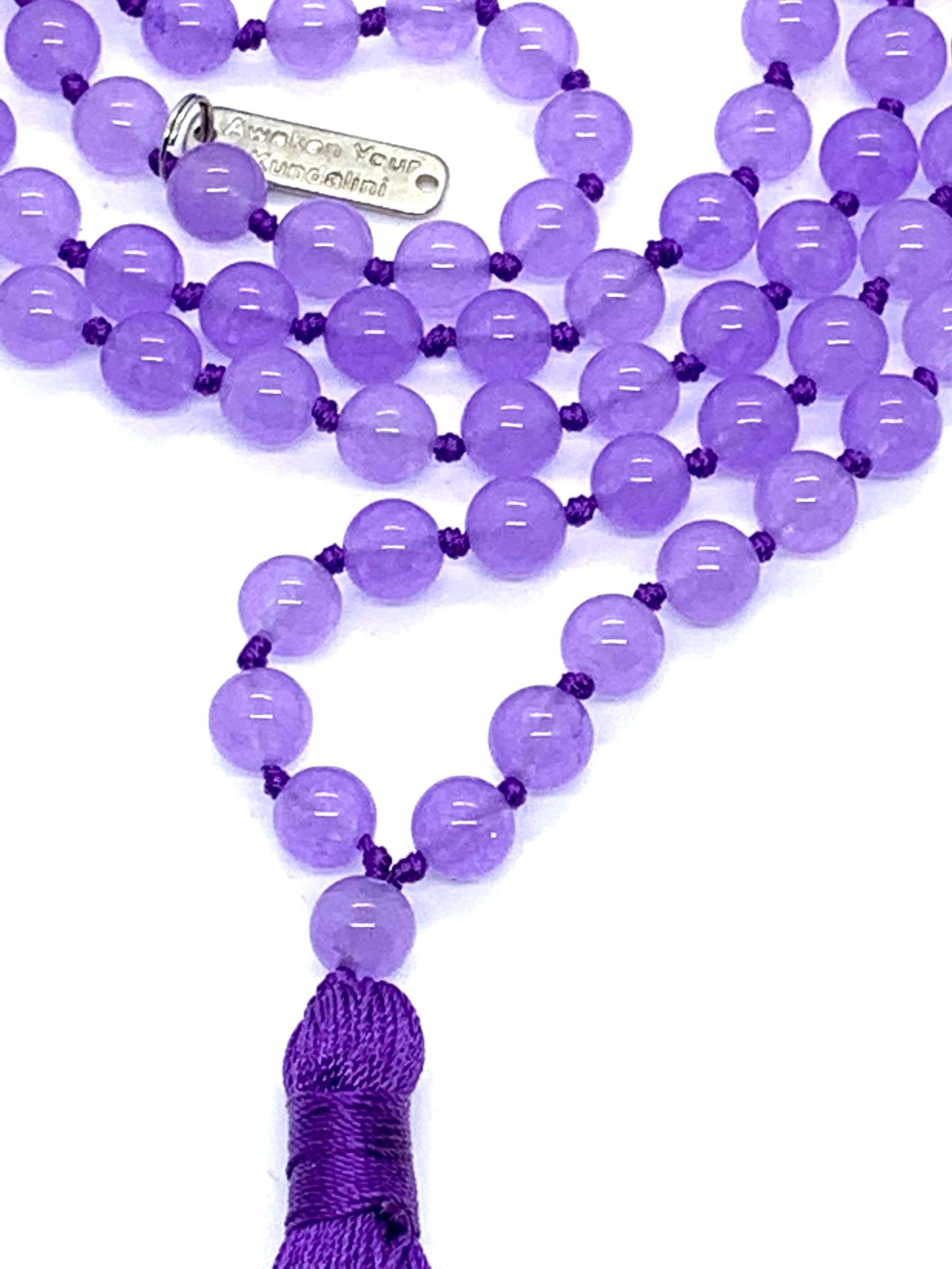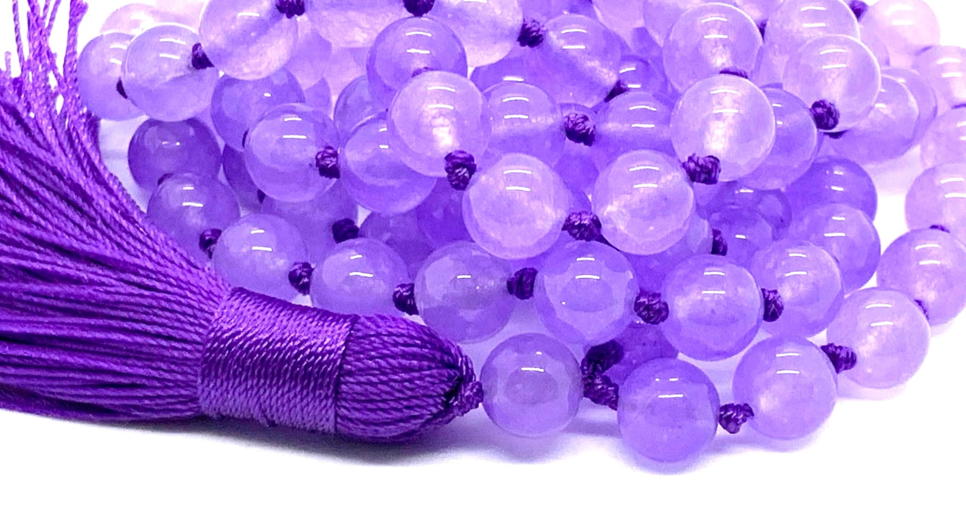 Hand Knotted Royal Harmony Mala Necklace – Natural Purple Jade Beads | 8mm 108 Prayer Beads | Third Eye & Crown Chakras | February Birthstone Energy