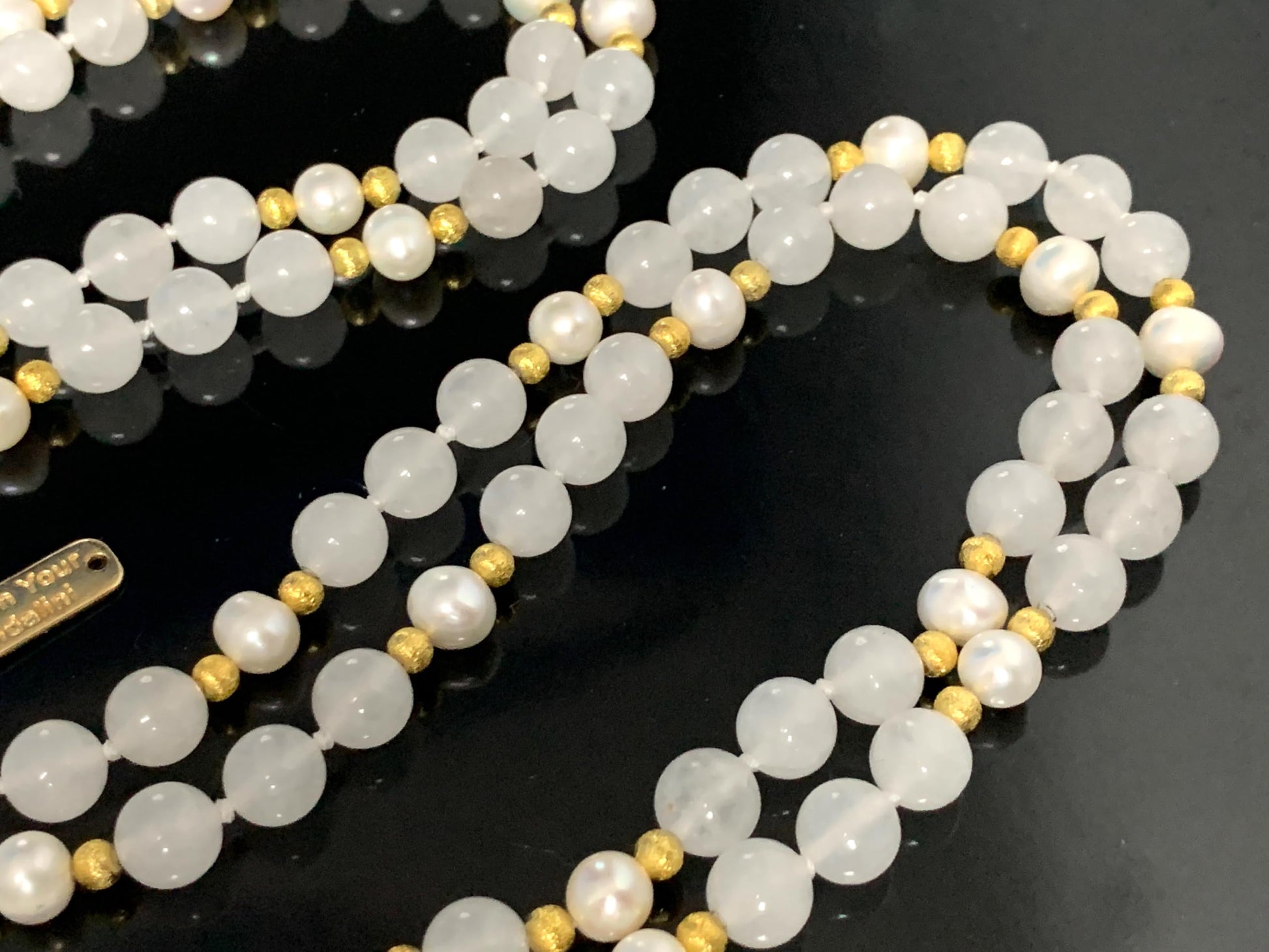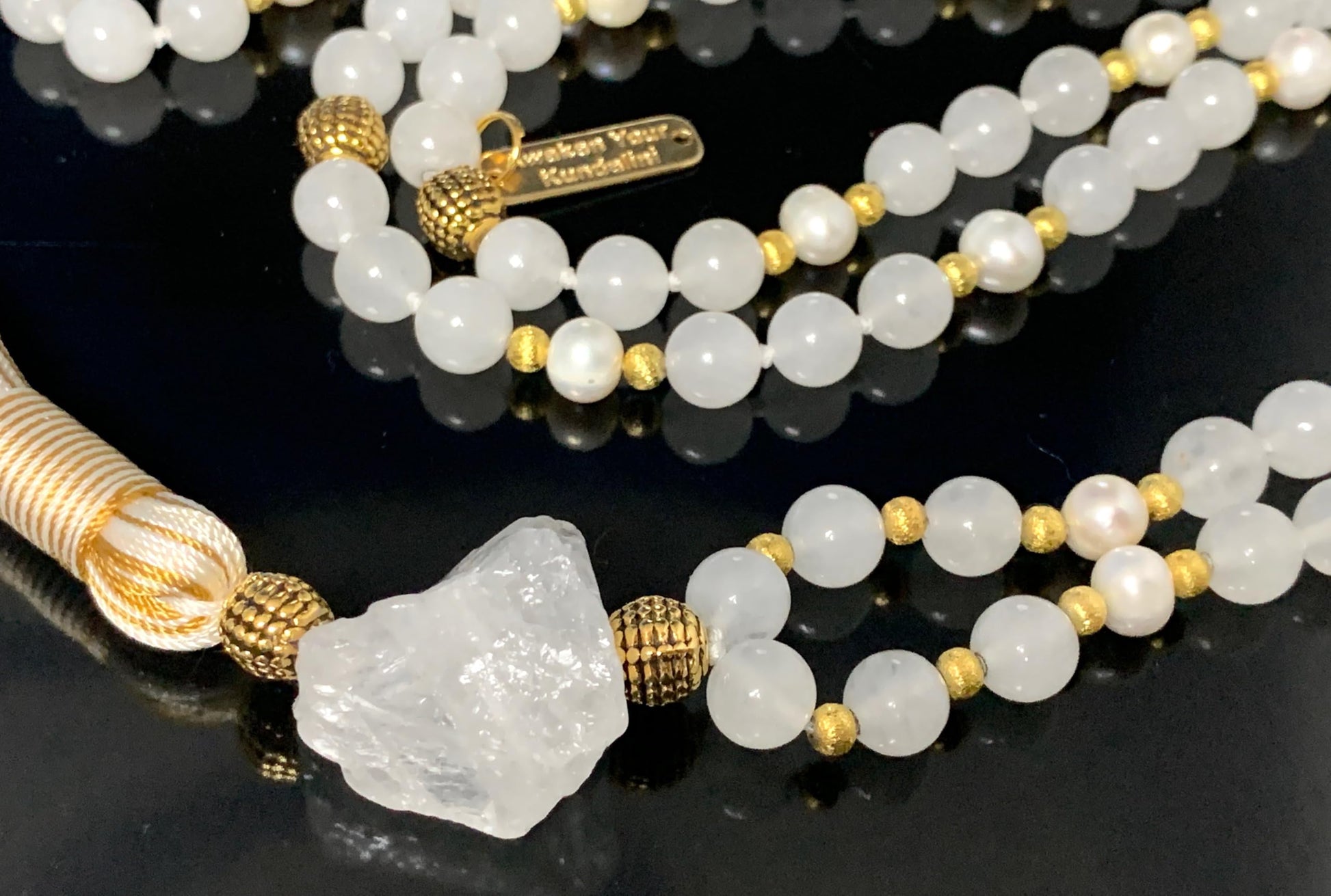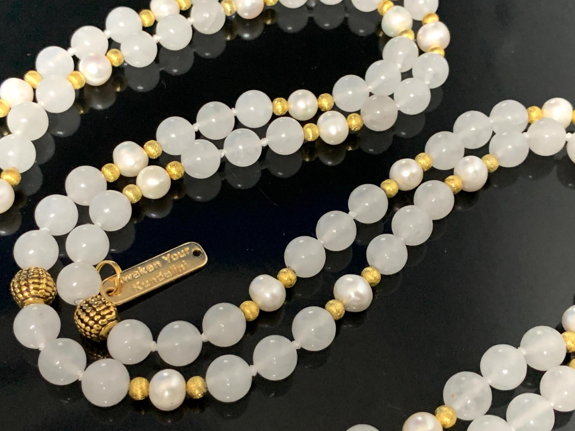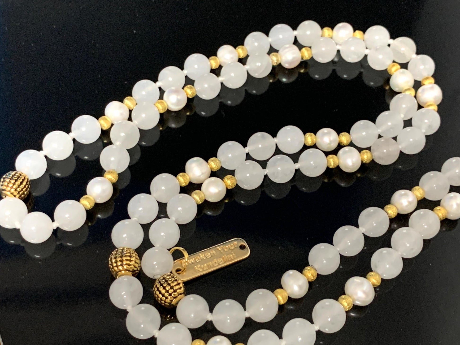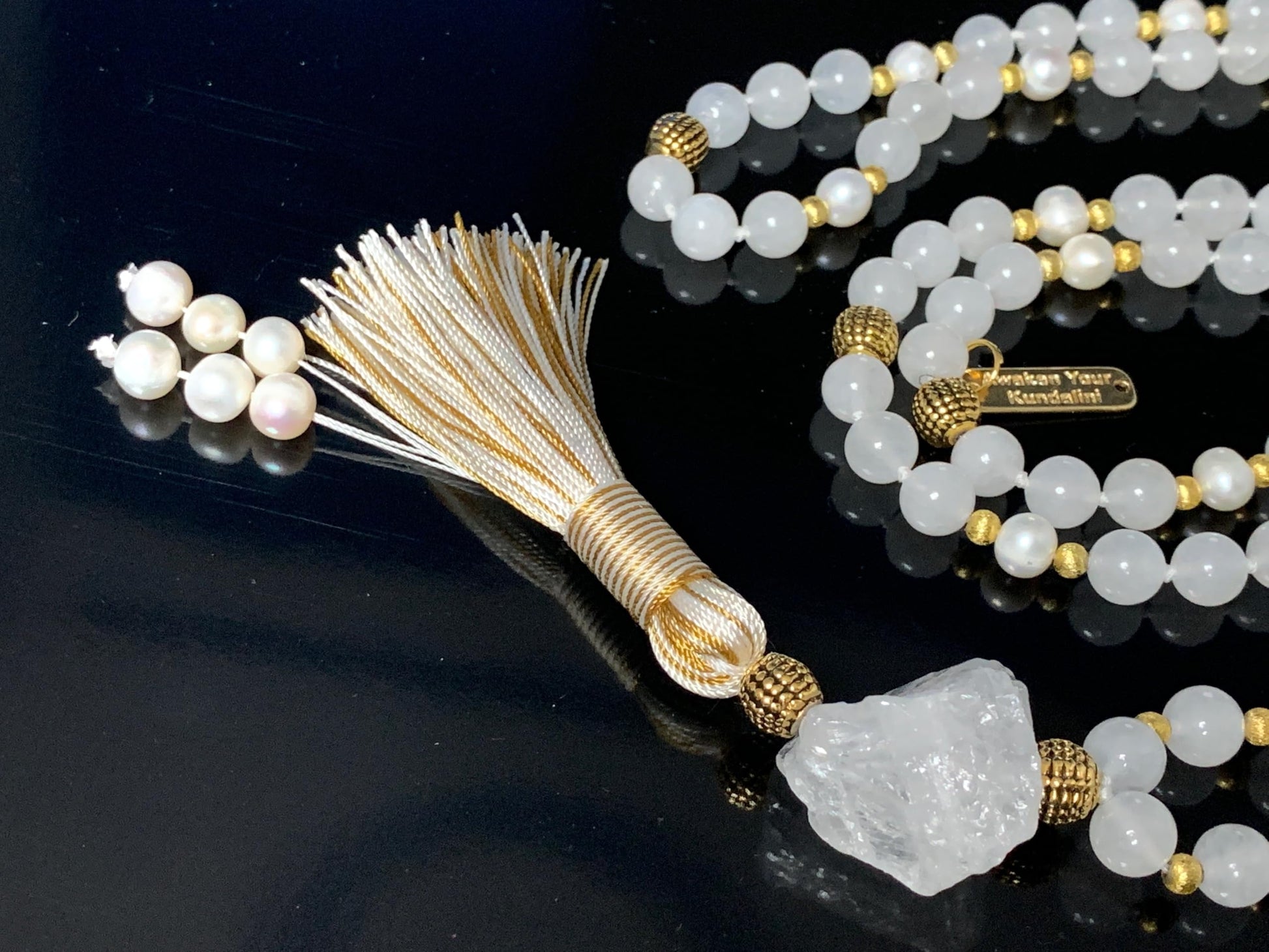 - This hand knotted 8mm Selenite and Pearl Beads Mala Necklace is a stunning piece of craftsmanship, combining the purity of Selenite with the classic elegance of Pearl. The 108 hand-knotted beads offer a traditional design, enhanced by a single Hematite bead, symbolizing balance and grounding. Perfect for meditation, this mala necklace also serves as a stylish accessory that aligns with your spiritual journey.