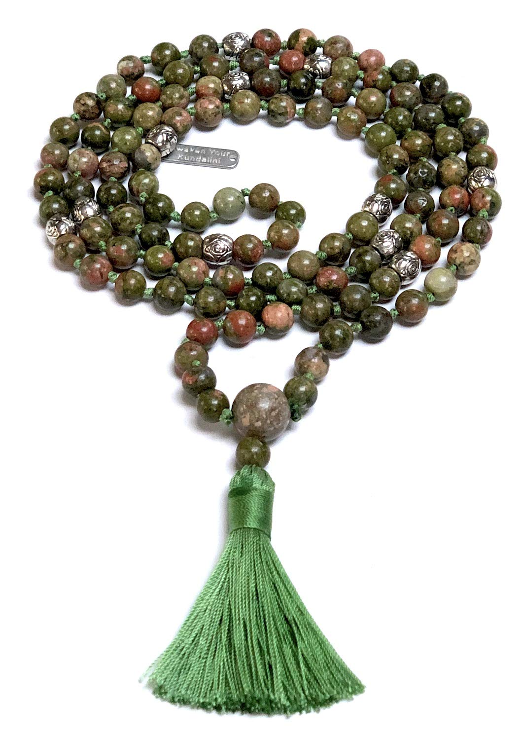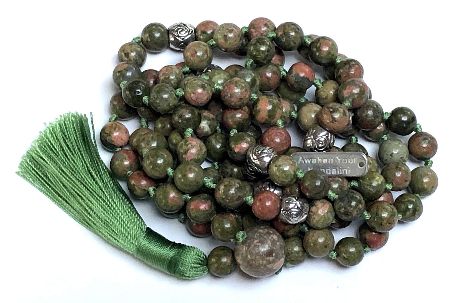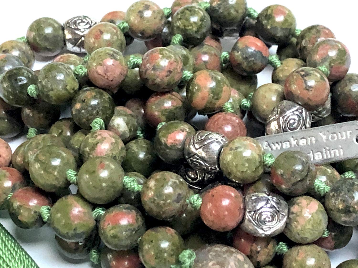 - Embrace Balance and Healing with our Hand Knotted Unakite Mala Necklace. This stunning piece is meticulously crafted with 108 8mm unakite beads and elegant zinc alloy spacers, designed to enhance your spiritual practices and bring a touch of natural beauty to your everyday wear. Hand Knotted in USA.