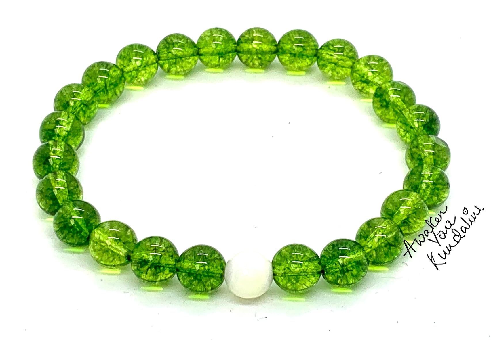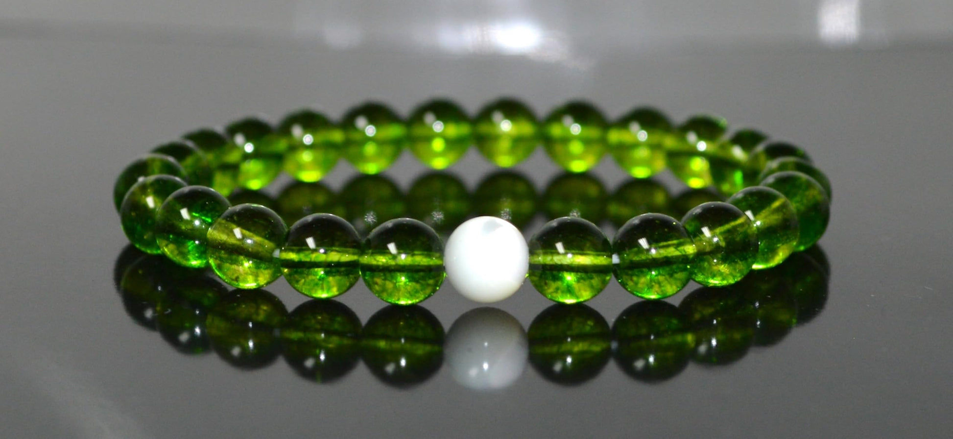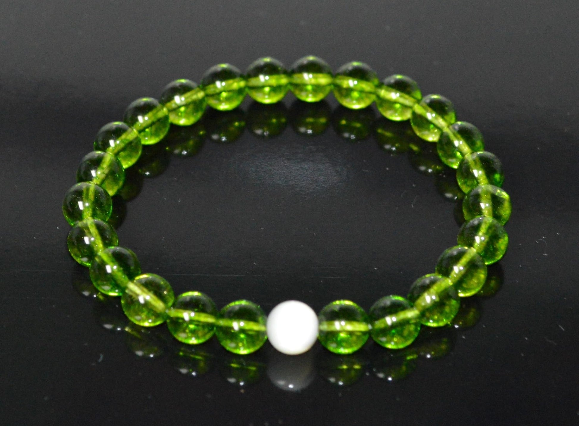 - Elevate your style with this beautifully handcrafted 8mm AAA Peridot & Mother of Pearl stretch bracelet. This unique piece combines the vibrant green of Peridot, the birthstone for August, with the soft iridescence of Mother of Pearl, creating a harmonious blend of colors & energies. The bracelet is adorned with copper spacers, adding a touch of warmth & elegance. This bracelet is a meaningful accessory for those born under Leo and Virgo, symbolizing renewal and emotional balance.