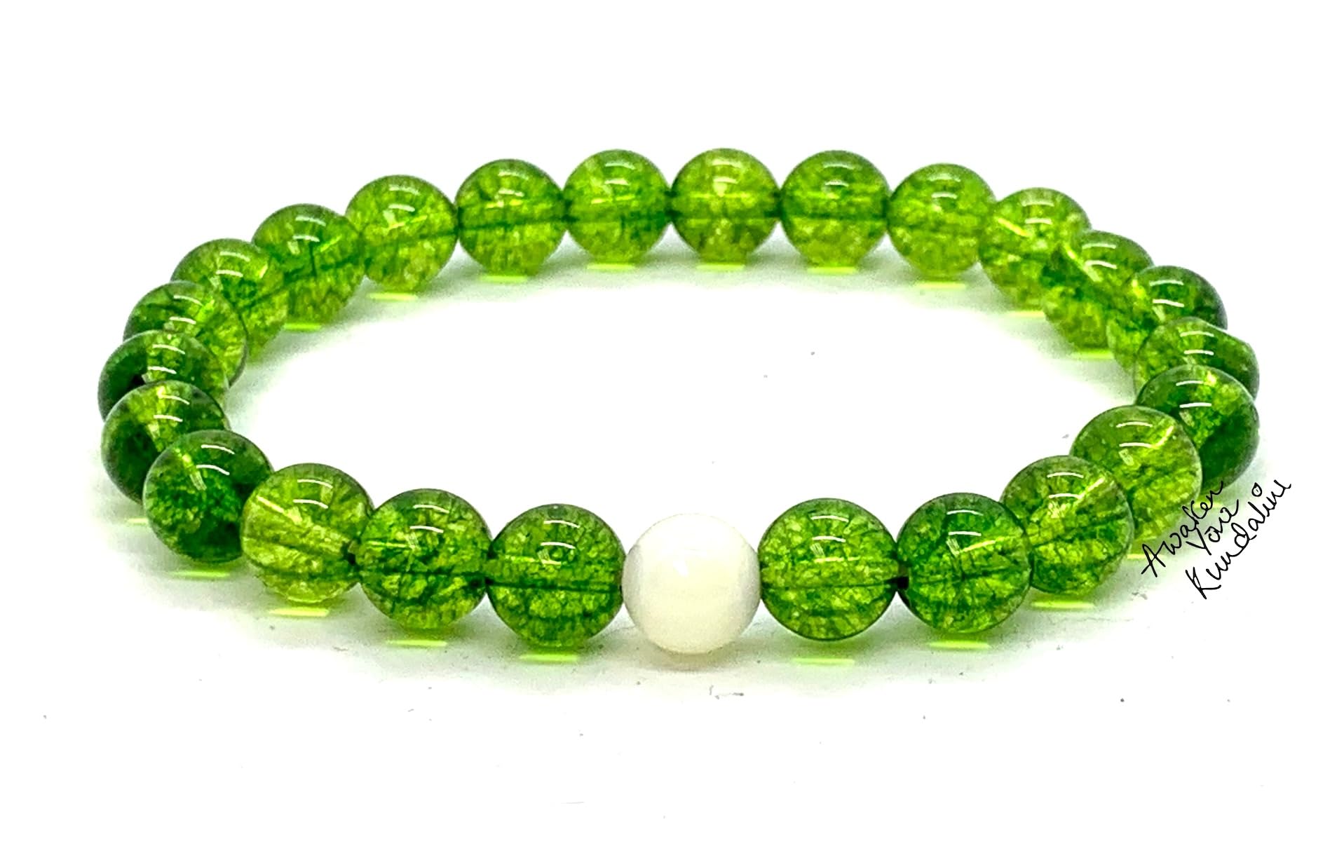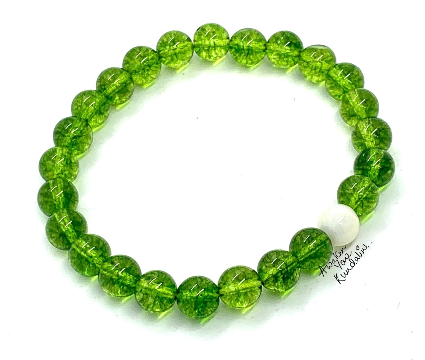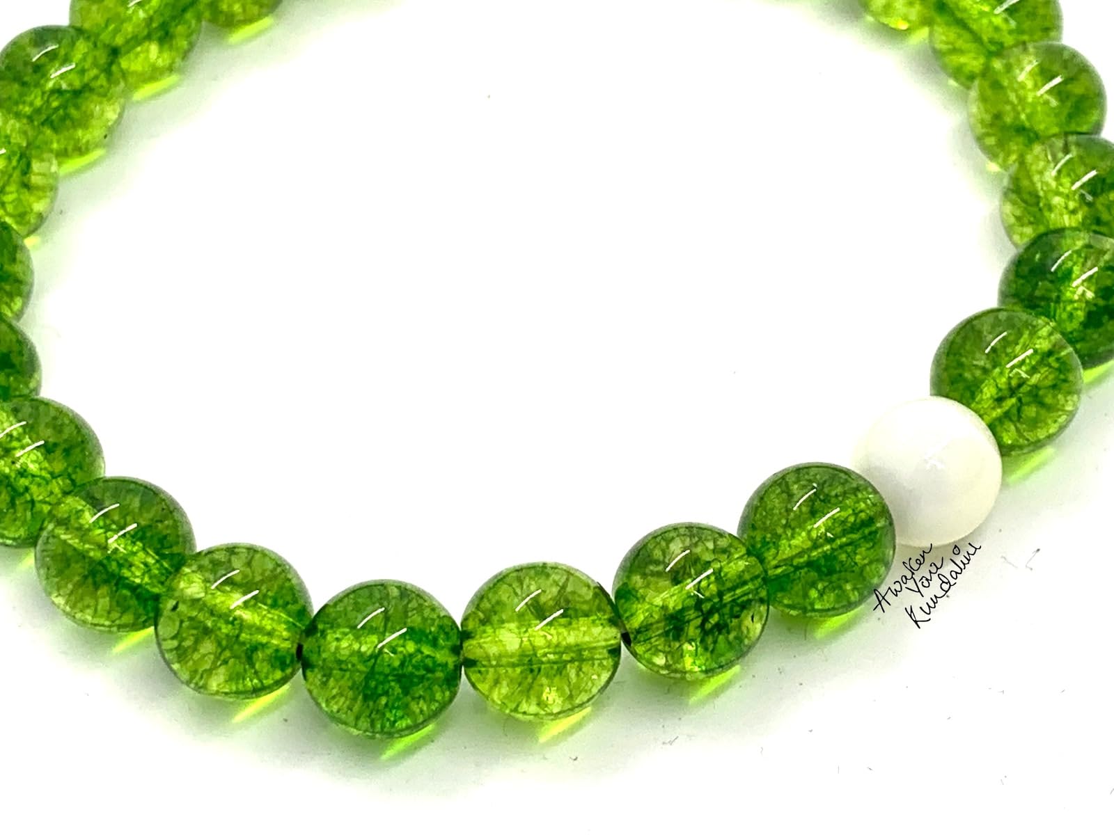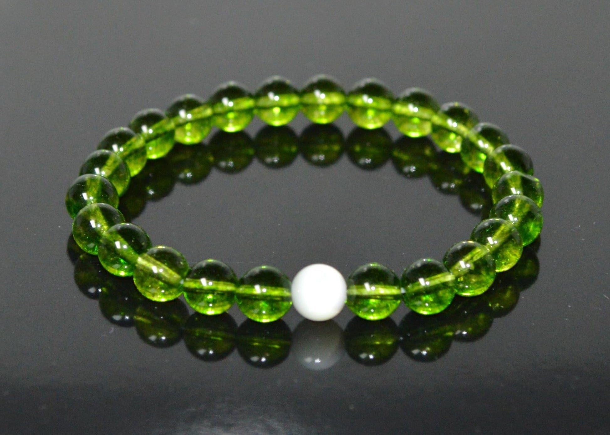 - Elevate your style with this beautifully handcrafted 8mm AAA Peridot & Mother of Pearl stretch bracelet. This unique piece combines the vibrant green of Peridot, the birthstone for August, with the soft iridescence of Mother of Pearl, creating a harmonious blend of colors & energies. The bracelet is adorned with copper spacers, adding a touch of warmth & elegance. This bracelet is a meaningful accessory for those born under Leo and Virgo, symbolizing renewal and emotional balance.