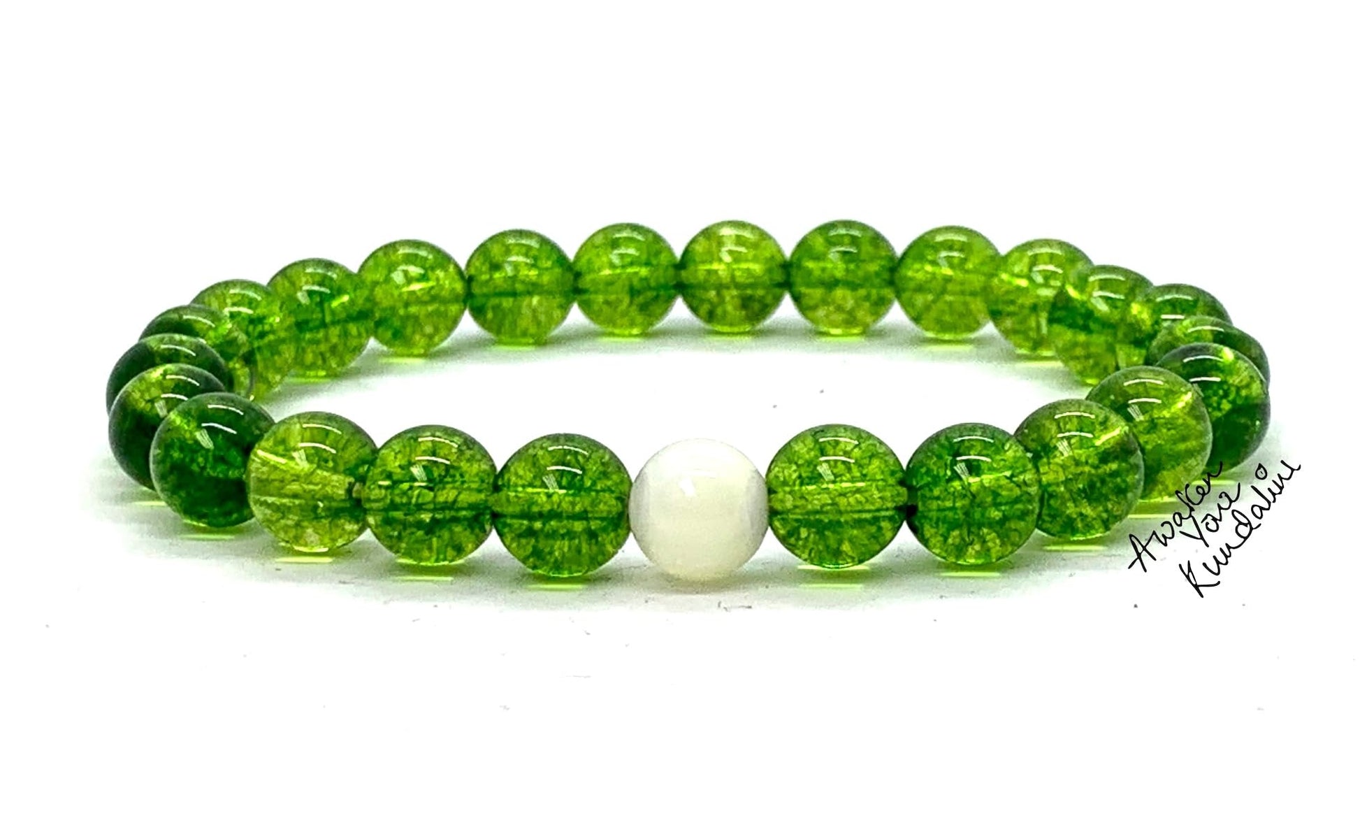 - Elevate your style with this beautifully handcrafted 8mm AAA Peridot & Mother of Pearl stretch bracelet. This unique piece combines the vibrant green of Peridot, the birthstone for August, with the soft iridescence of Mother of Pearl, creating a harmonious blend of colors & energies. The bracelet is adorned with copper spacers, adding a touch of warmth & elegance. This bracelet is a meaningful accessory for those born under Leo and Virgo, symbolizing renewal and emotional balance.