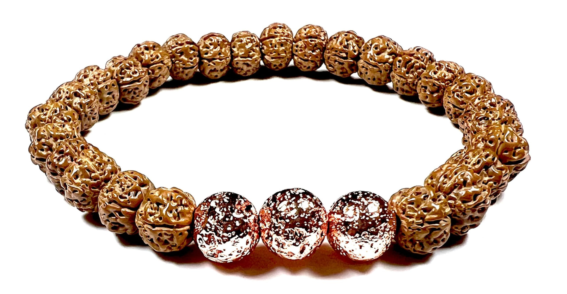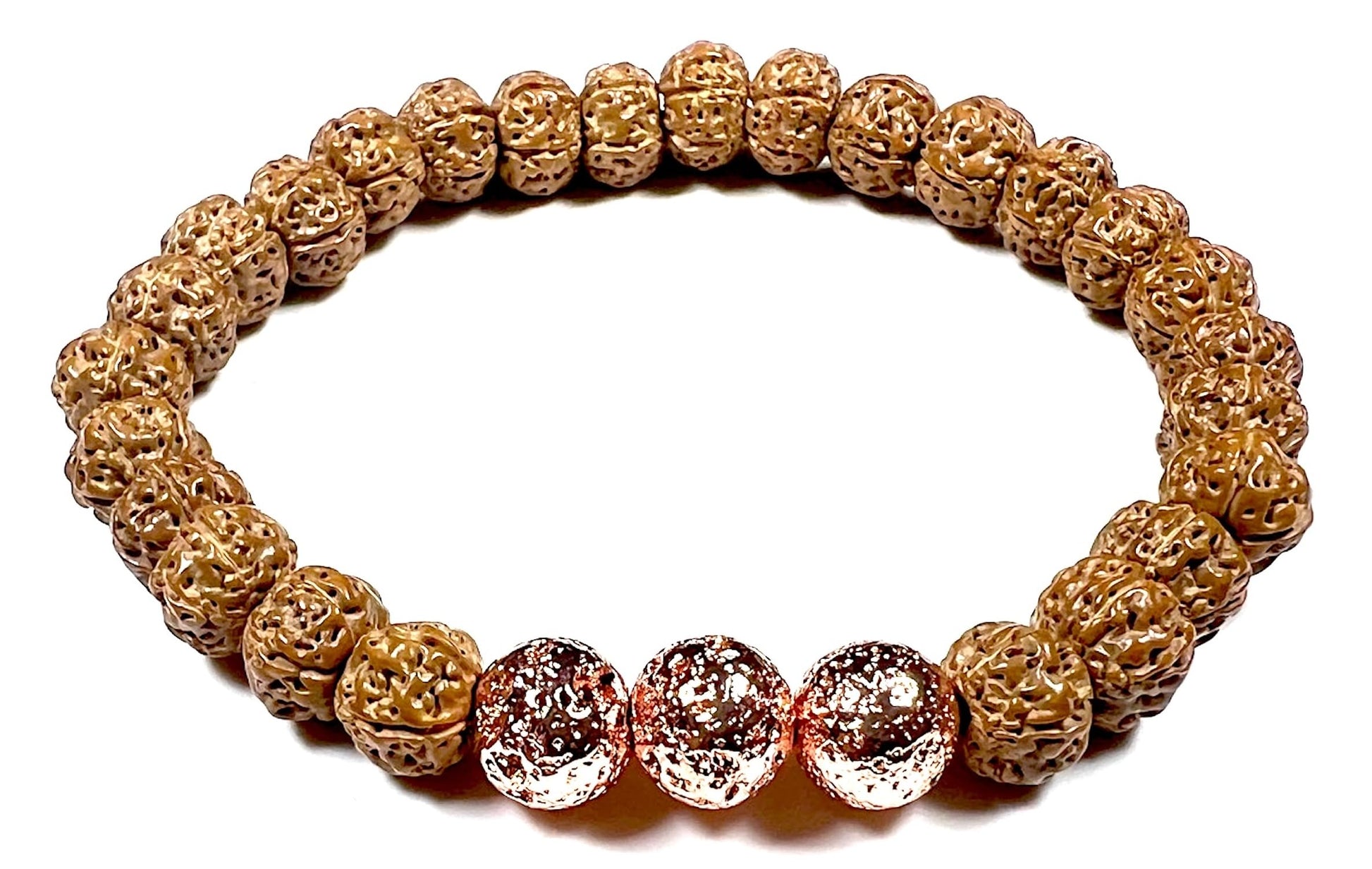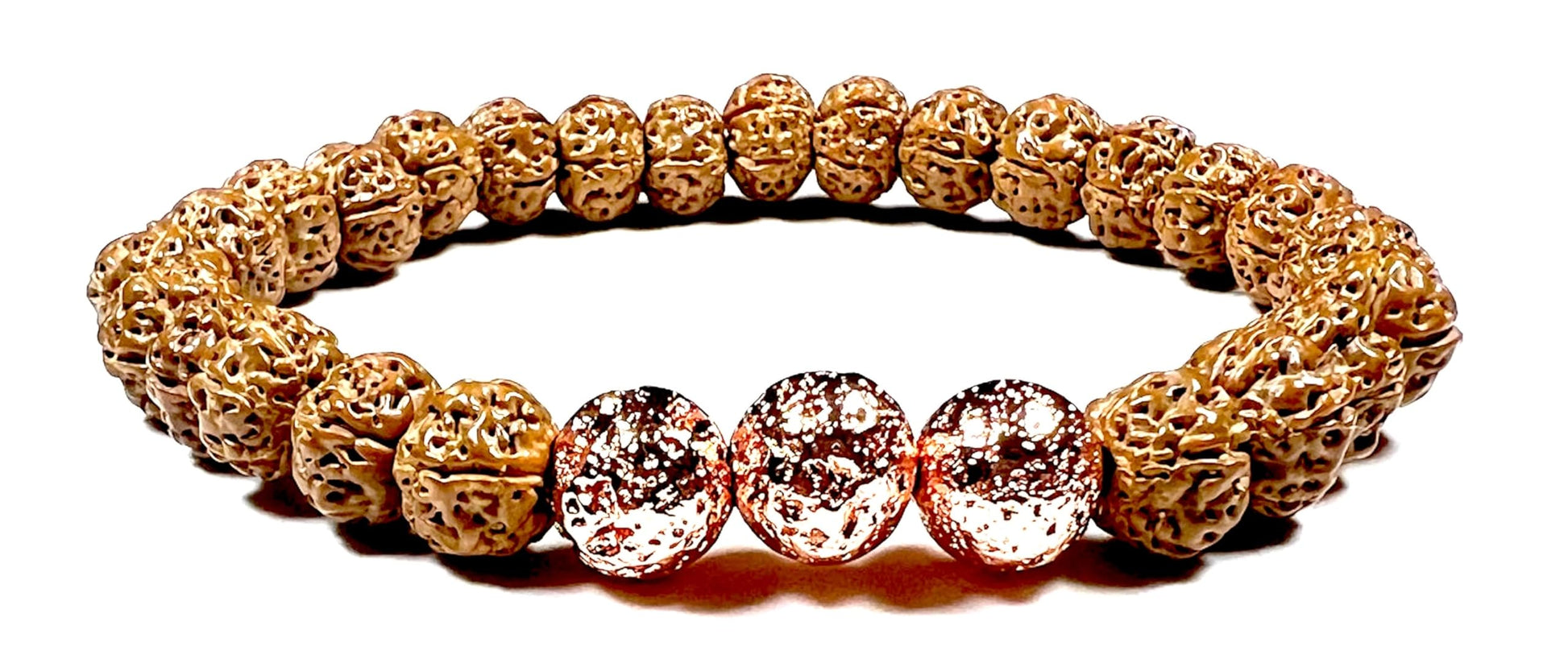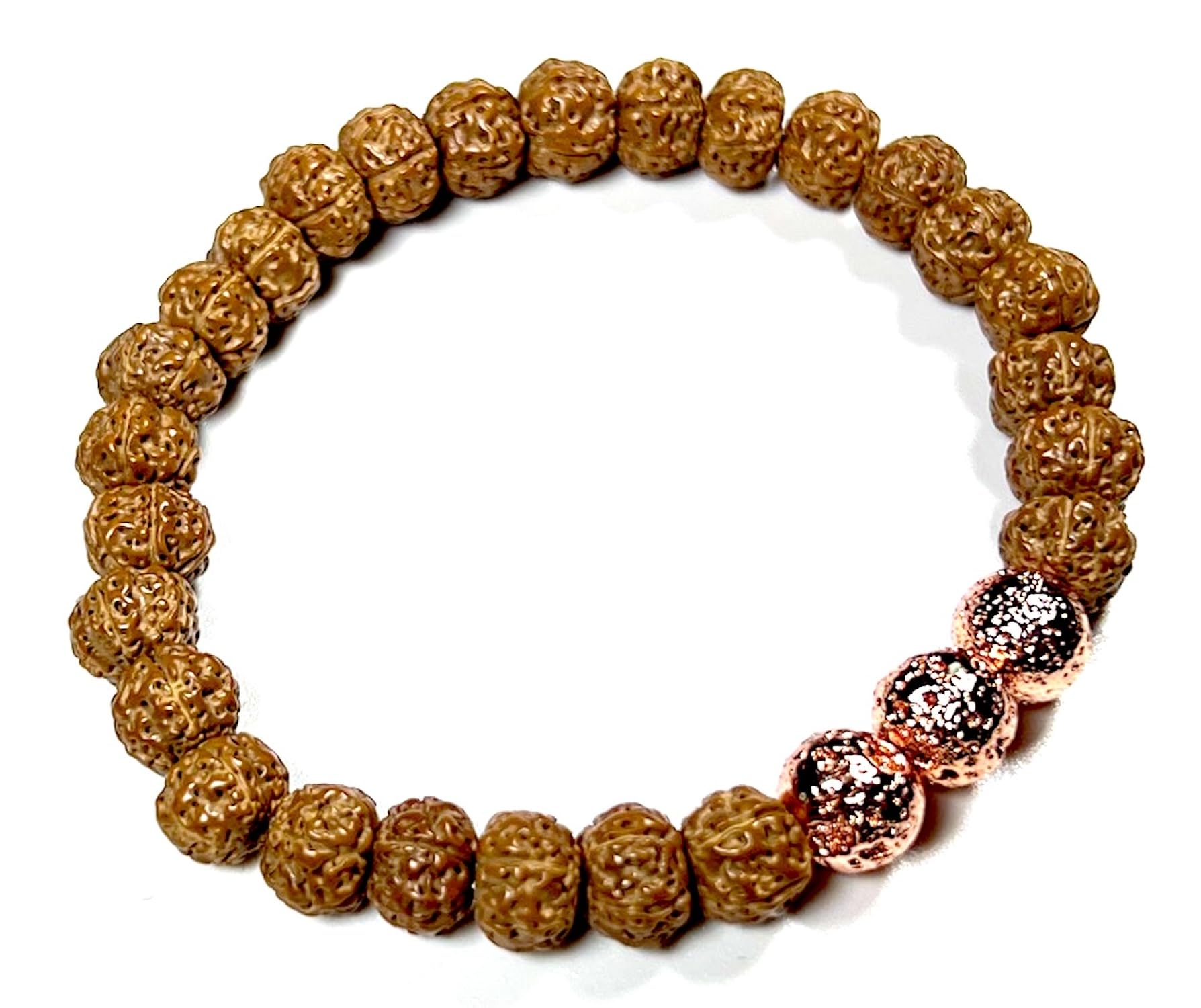 - Embrace Grounding Energy & Cultivate Spiritual Connection Embrace your spiritual journey and cultivate inner peace with this beautiful, handmade stretch bracelet. Featuring genuine 8mm 5 Mukhi Chikna Pathri Rudraksha beads and paired with stunning electroplated rose gold lava beads, this bracelet offers a unique blend of spiritual significance, modern style, and powerful energy for the Root Chakra.