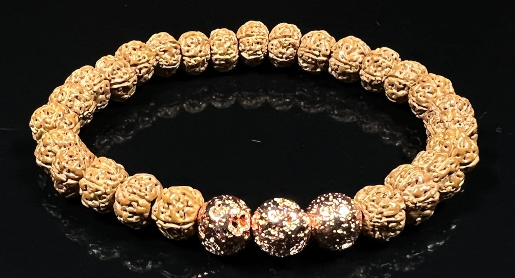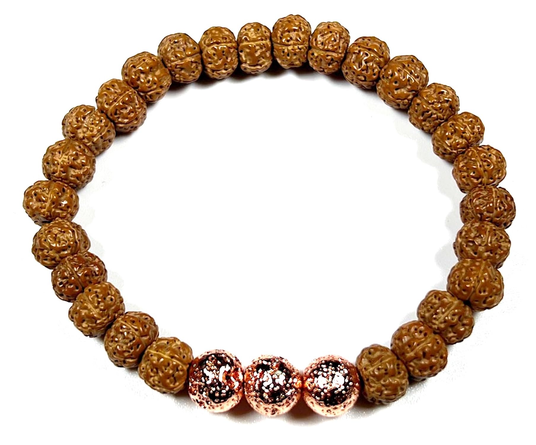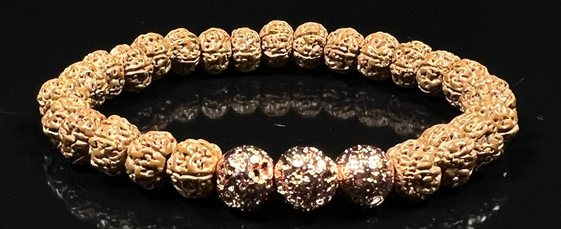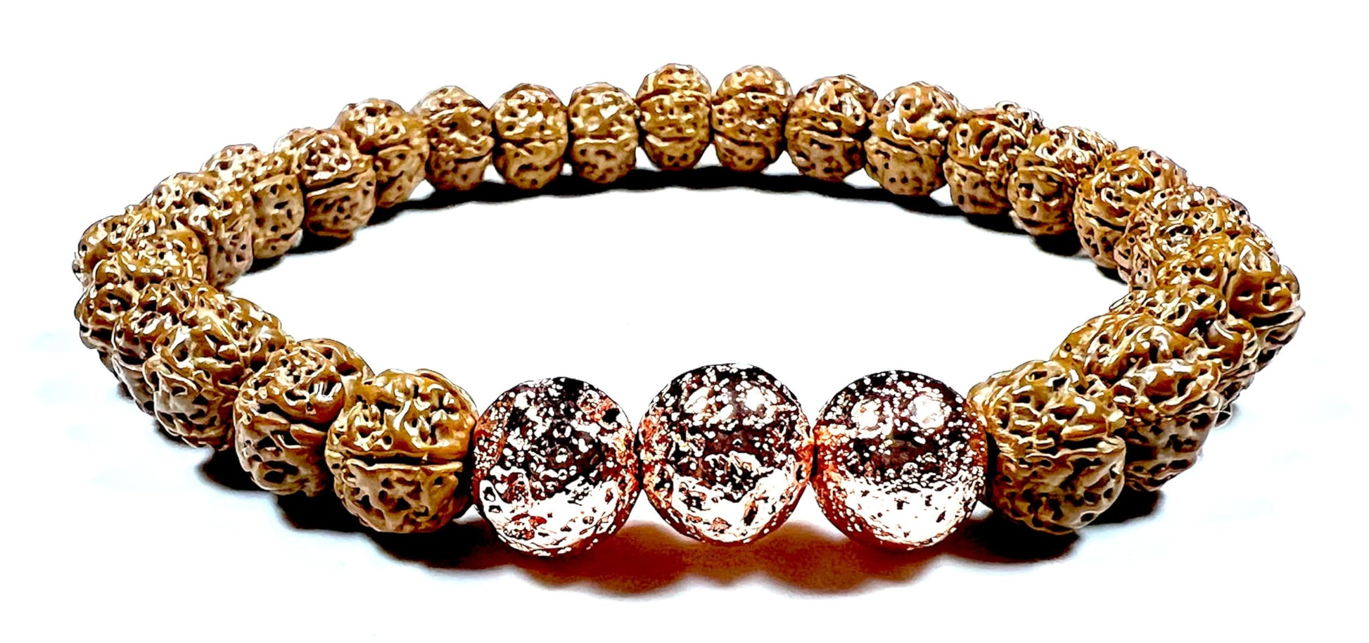 - Embrace Grounding Energy & Cultivate Spiritual Connection Embrace your spiritual journey and cultivate inner peace with this beautiful, handmade stretch bracelet. Featuring genuine 8mm 5 Mukhi Chikna Pathri Rudraksha beads and paired with stunning electroplated rose gold lava beads, this bracelet offers a unique blend of spiritual significance, modern style, and powerful energy for the Root Chakra.