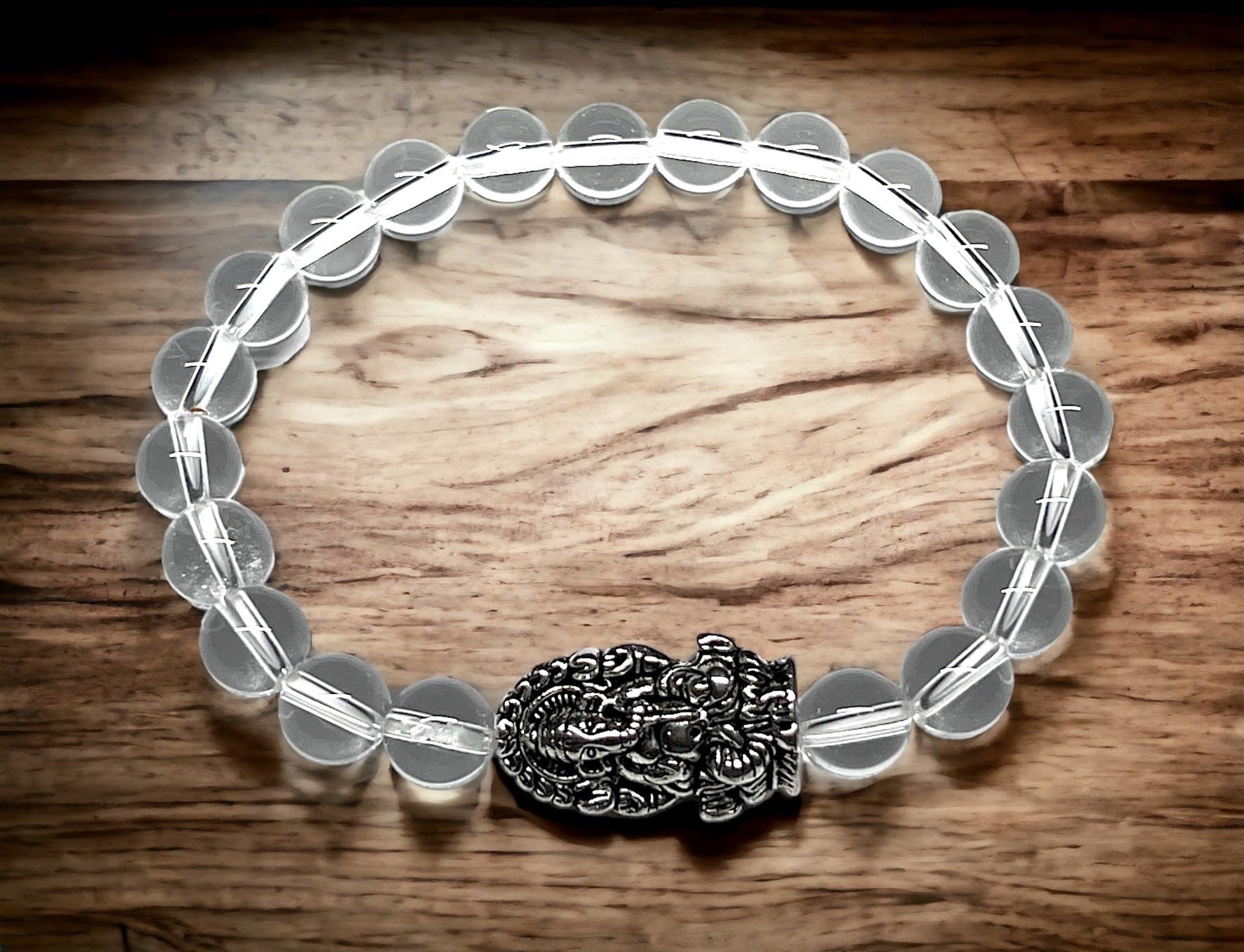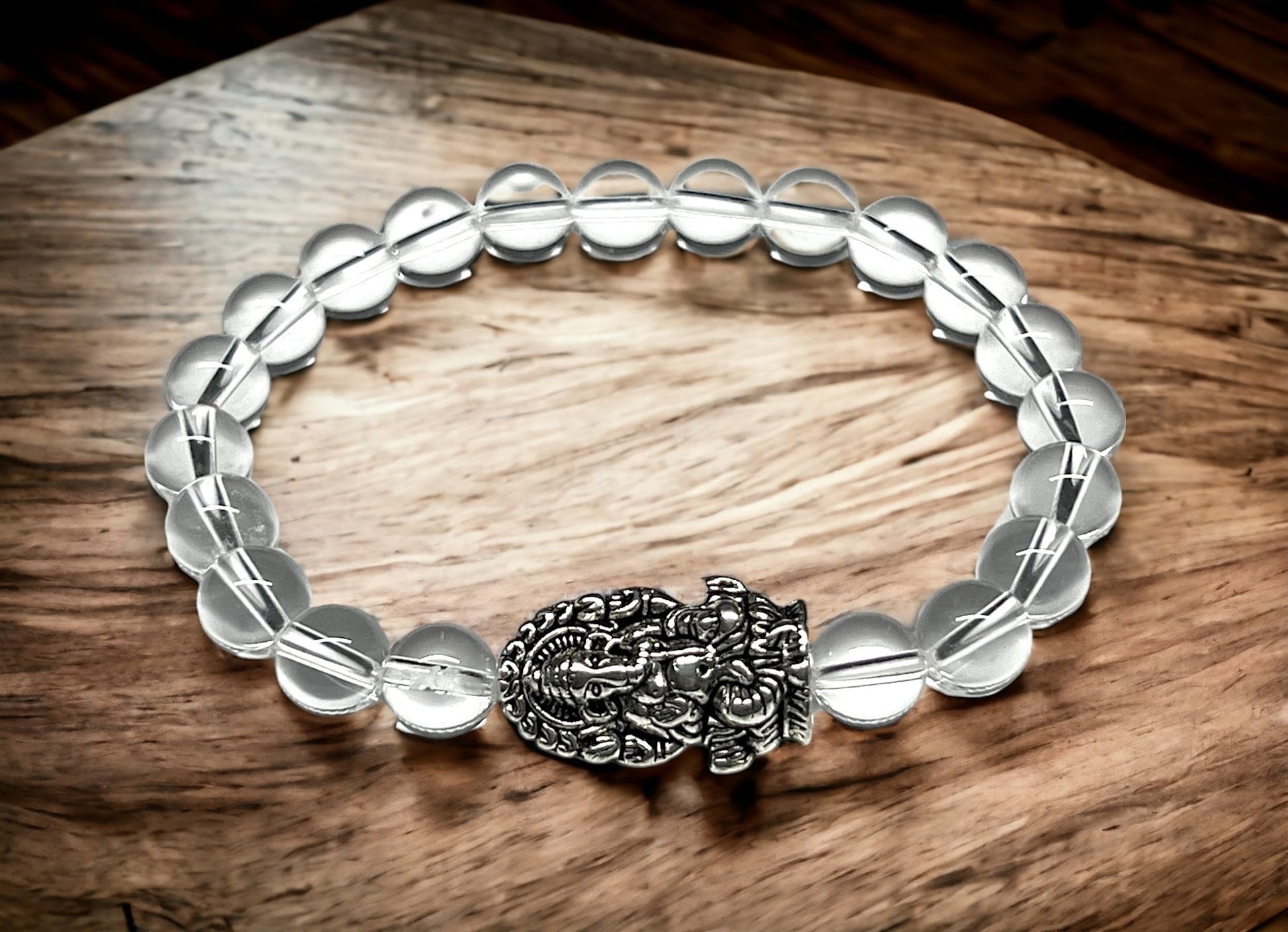 Handmade 8mm Clear Crystal Quartz Stretch Bracelet w/God Ganesha Ganesh Accent | Birthstone for April | Crown Chakra
