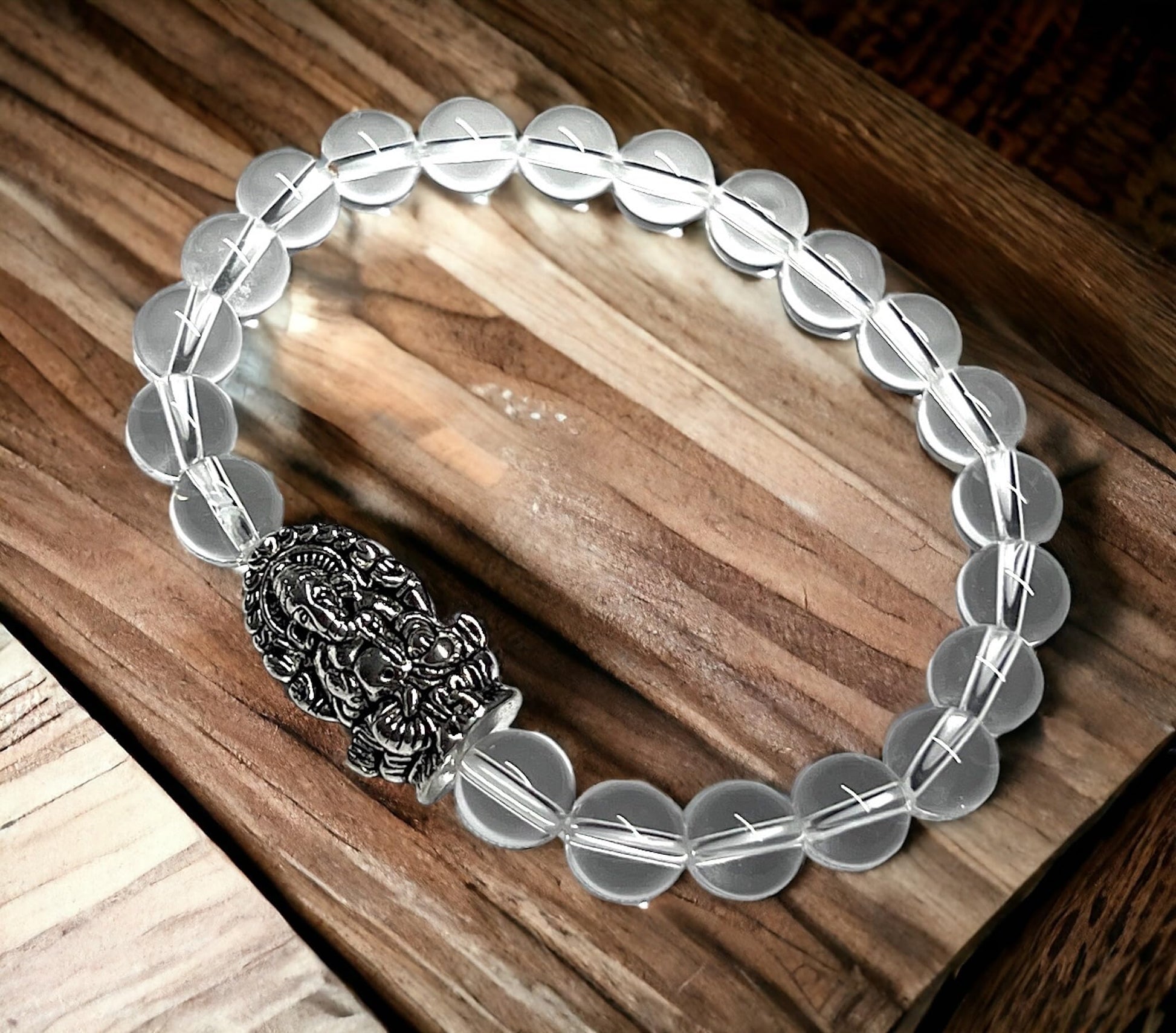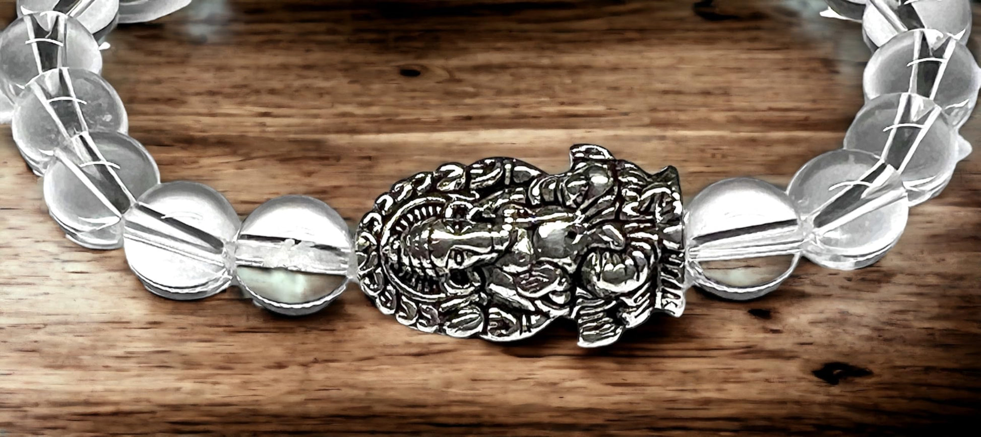 - Properties & Benefits: Clear Crystal Quartz is often referred to as the "Master Stone" due to its luminous clarity and high vibrational energy. Known for its pure and unblemished structure, this stone has been cherished across cultures for its ability to represent balance and harmony. The addition of a Ganesha charm enhances the bracelet’s significance, making it not just a beautiful accessory but also a symbol of wisdom, prosperity, and guidance. Perfect for meditation, daily wear, or as a thoughtful gift for loved ones.
