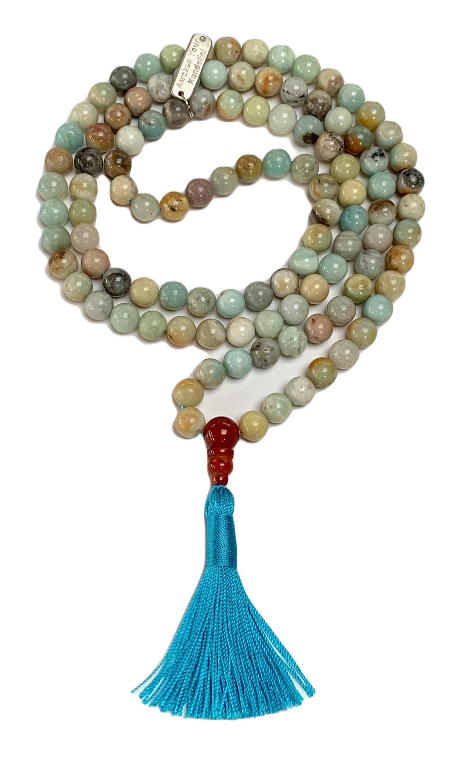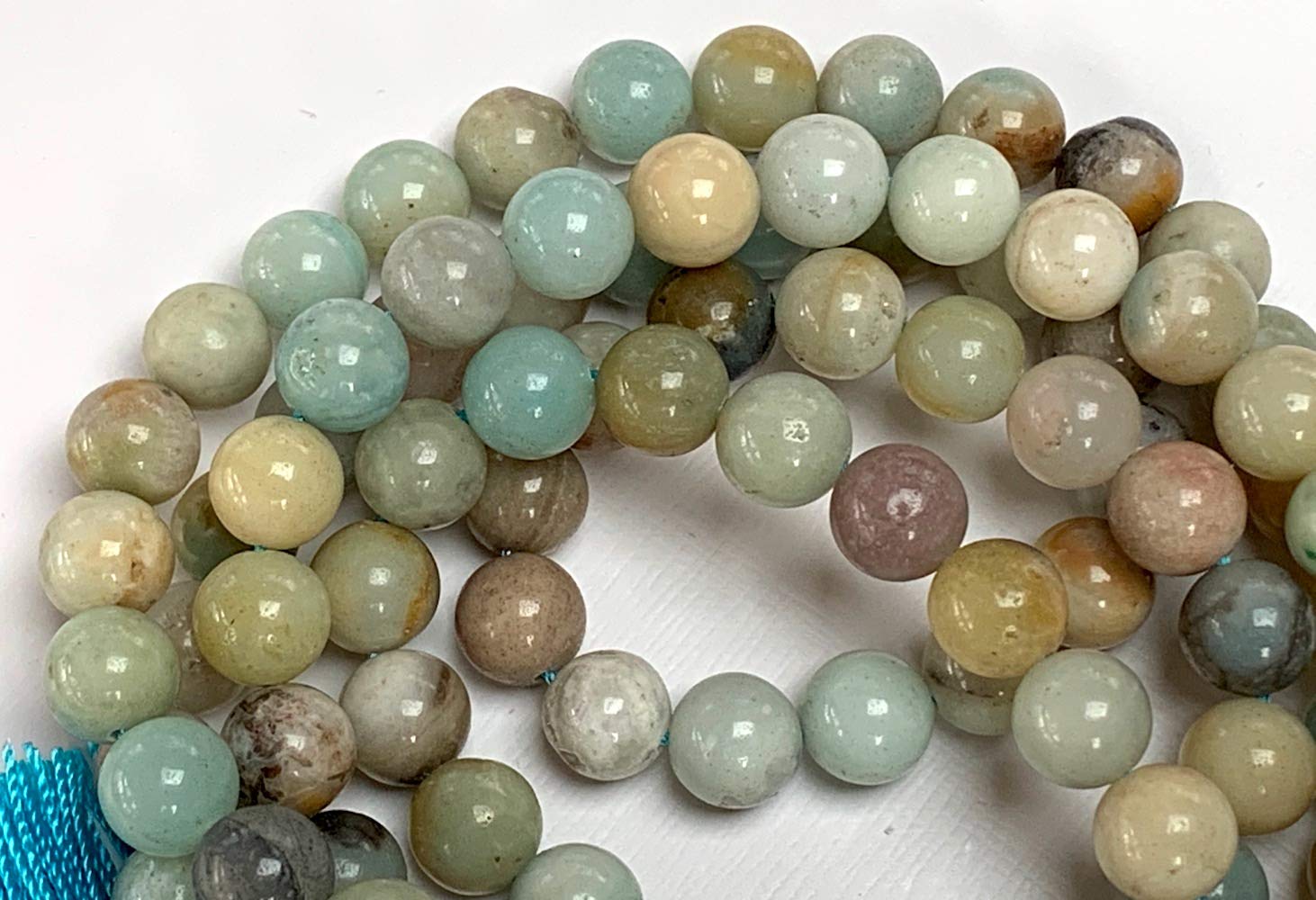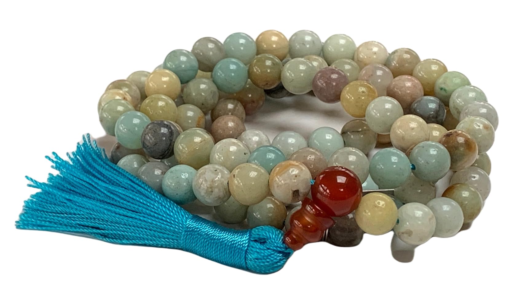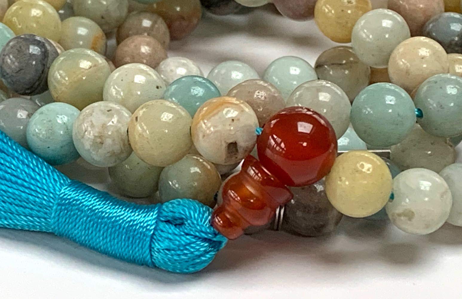 - Product Specifications: Material: Genuine Amazonite Gemstones, Carnelian Gemstones (8mm beads), Guru Bead, Durable Cord. Number of Beads: 108 beads + 1 guru bead.