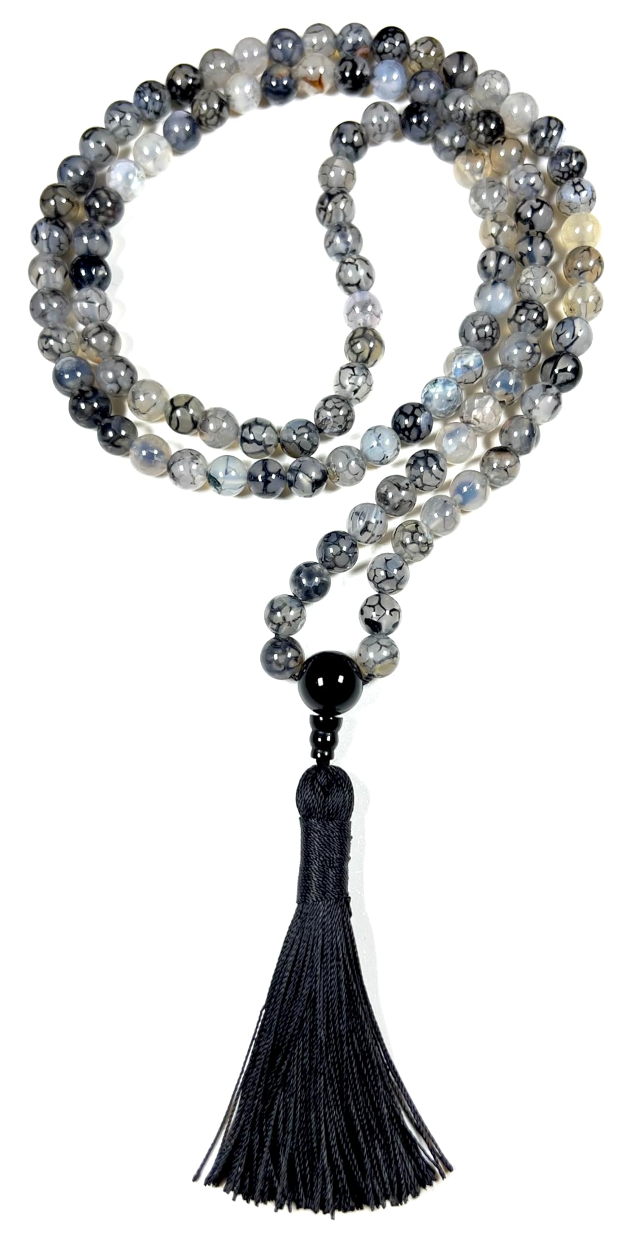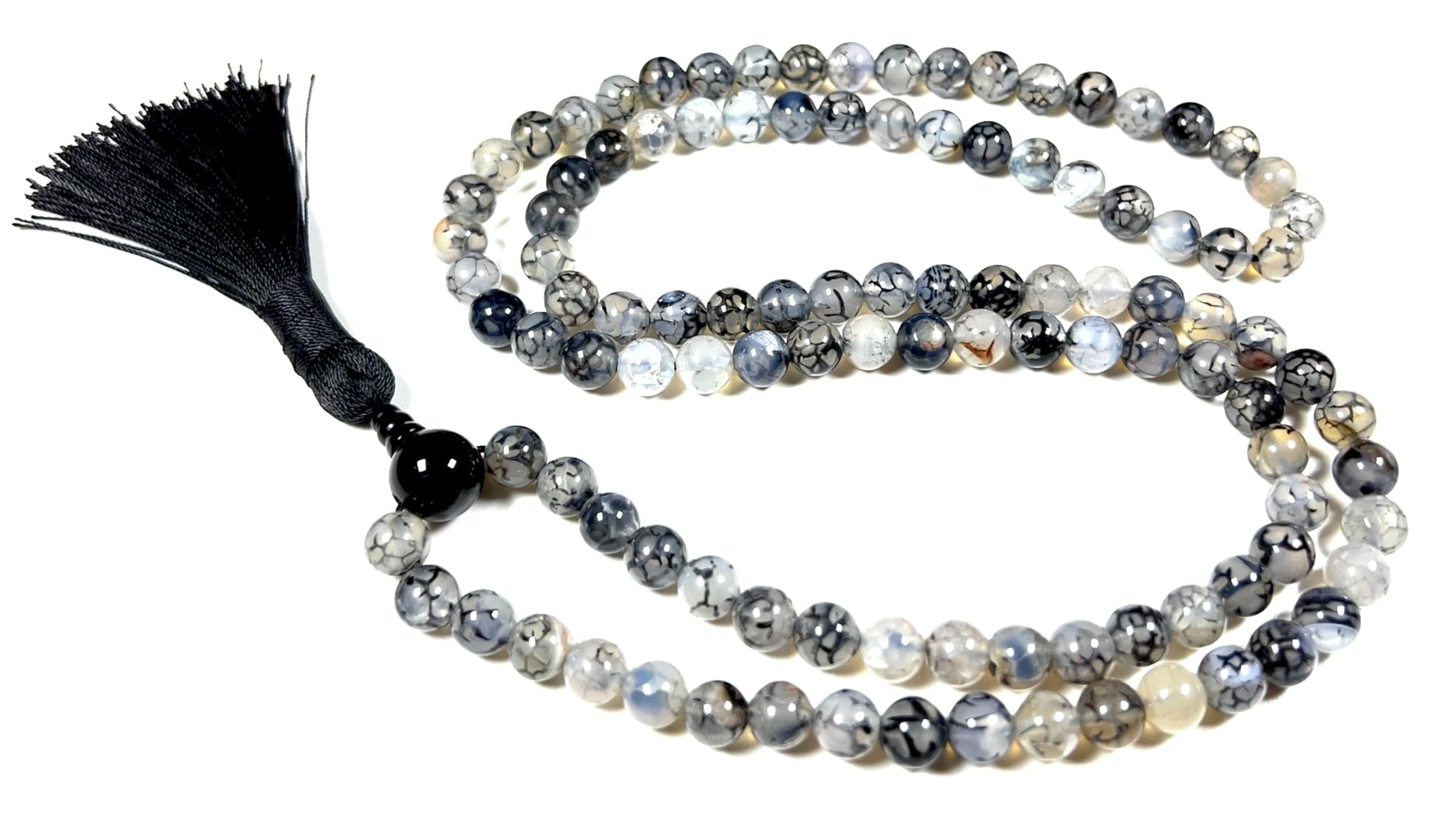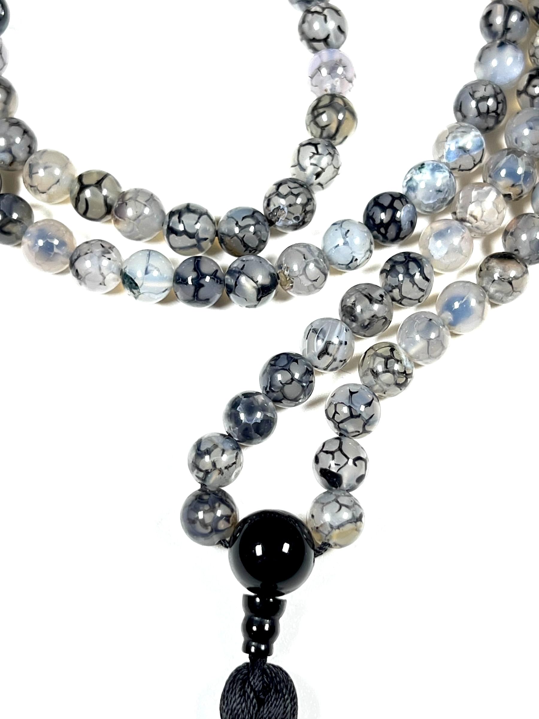 - Properties & Benefits: Genuine Black Dragon Vein Agate Beads – Distinctive veined patterns in deep black and smoky gray tones, symbolizing strength and resilience. Traditional 108-Bead Mala – Ideal for mantra meditation, prayer, or mindful breathing exercises. Hand-Knotted Craftsmanship – Ensures smooth handling and a luxurious feel, enhancing durability. Versatile Wear – Can be styled as a meditation mala or worn as a meaningful spiritual necklace.