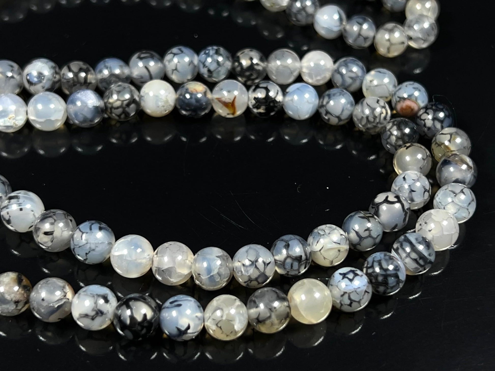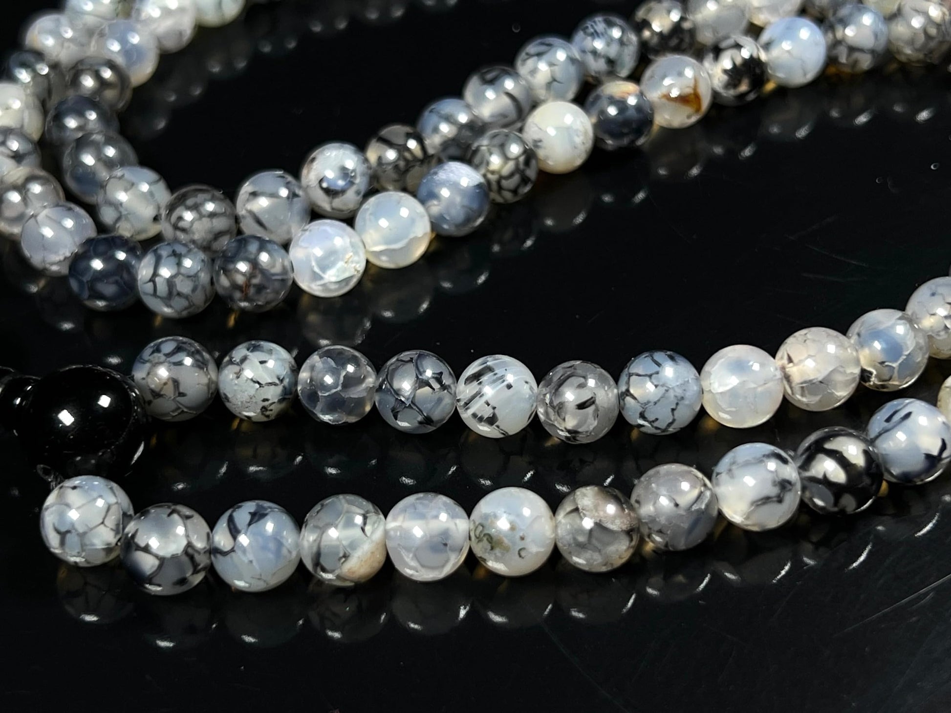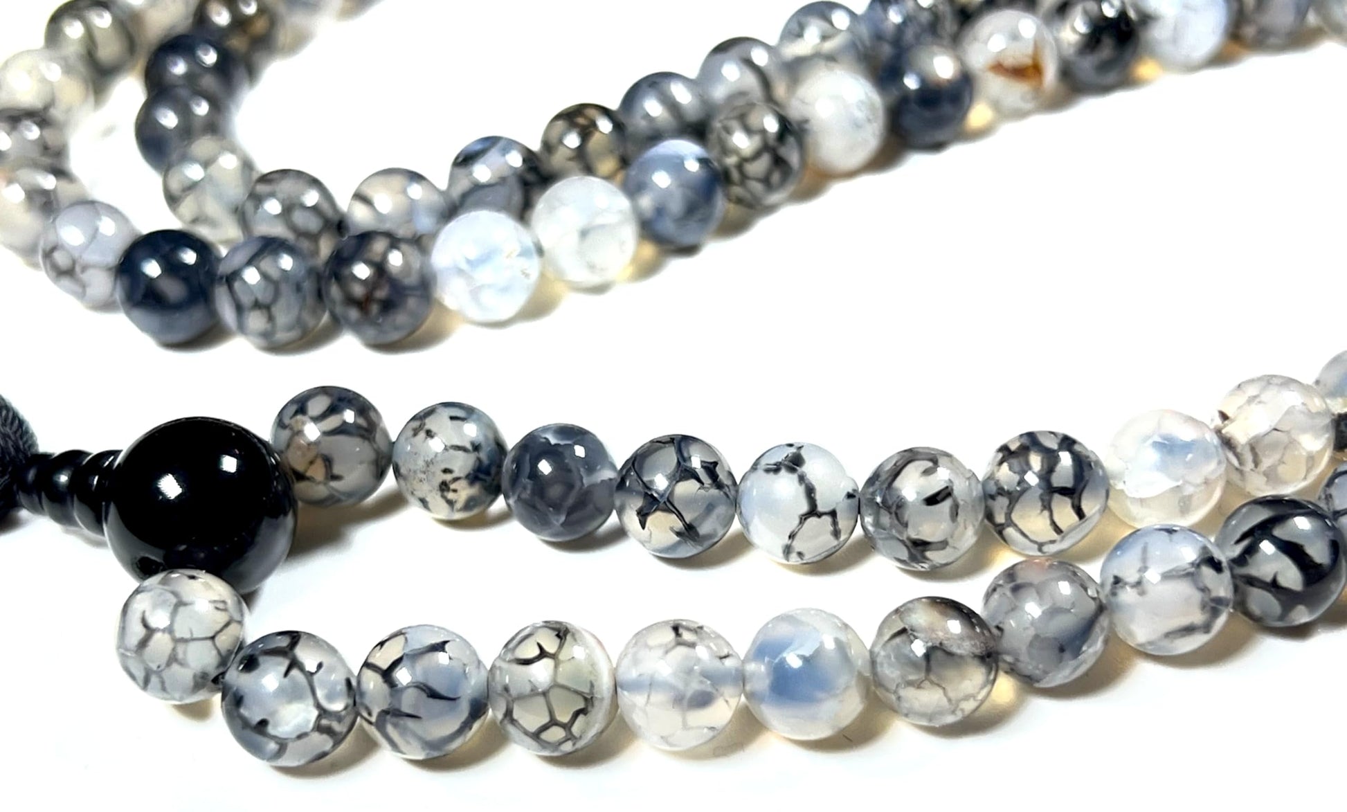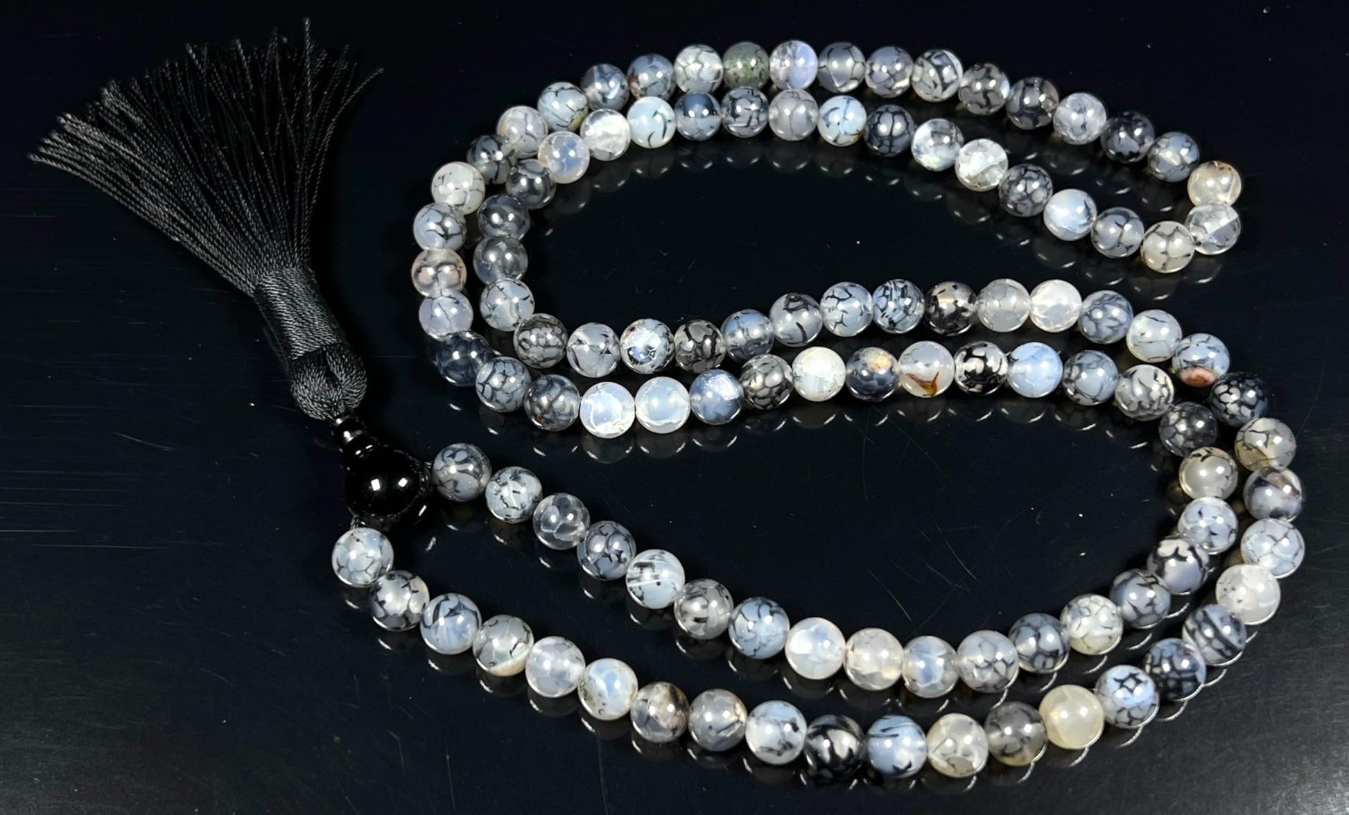 - Properties & Benefits: Genuine Black Dragon Vein Agate Beads – Distinctive veined patterns in deep black and smoky gray tones, symbolizing strength and resilience. Traditional 108-Bead Mala – Ideal for mantra meditation, prayer, or mindful breathing exercises. Hand-Knotted Craftsmanship – Ensures smooth handling and a luxurious feel, enhancing durability. Versatile Wear – Can be styled as a meditation mala or worn as a meaningful spiritual necklace.