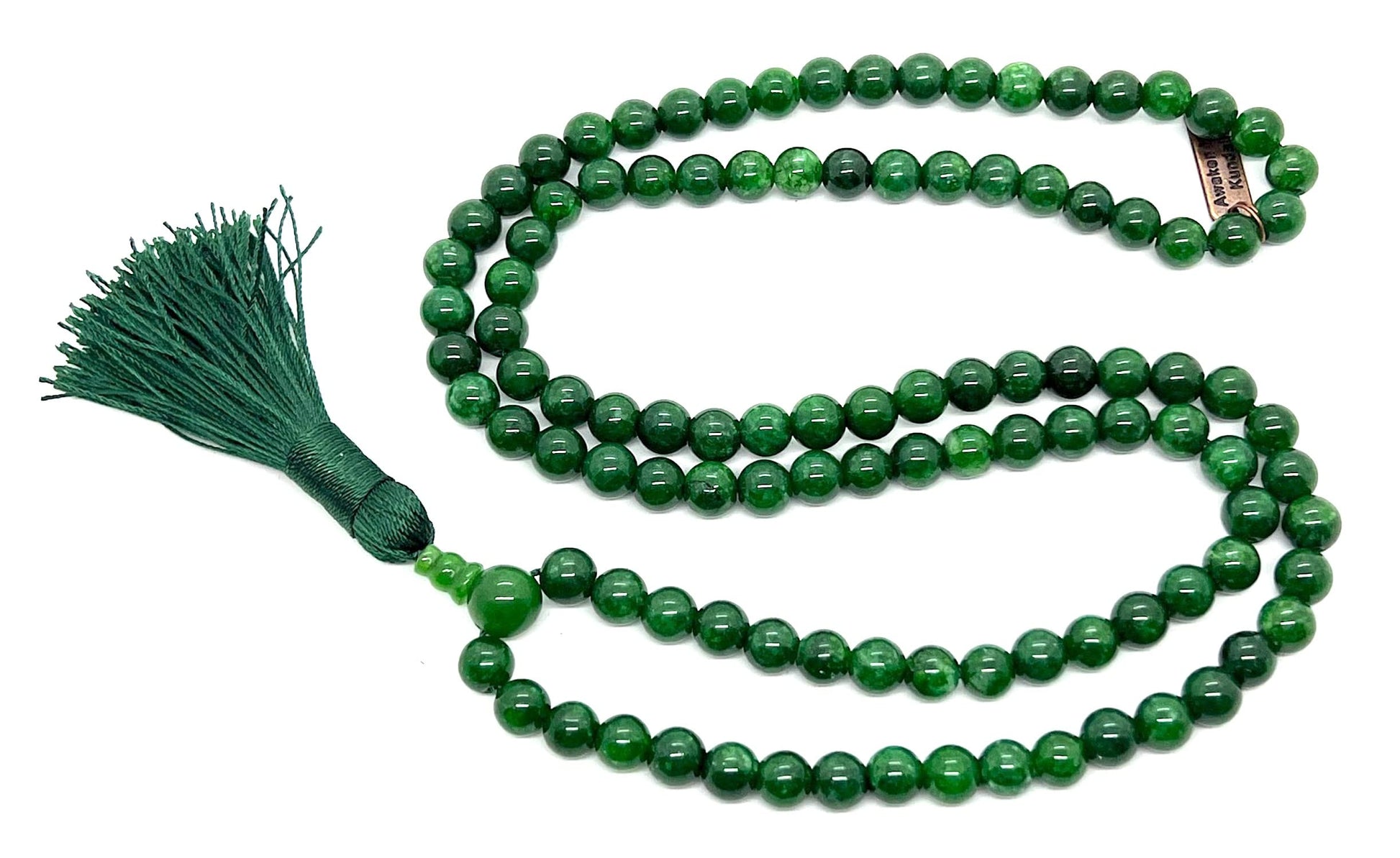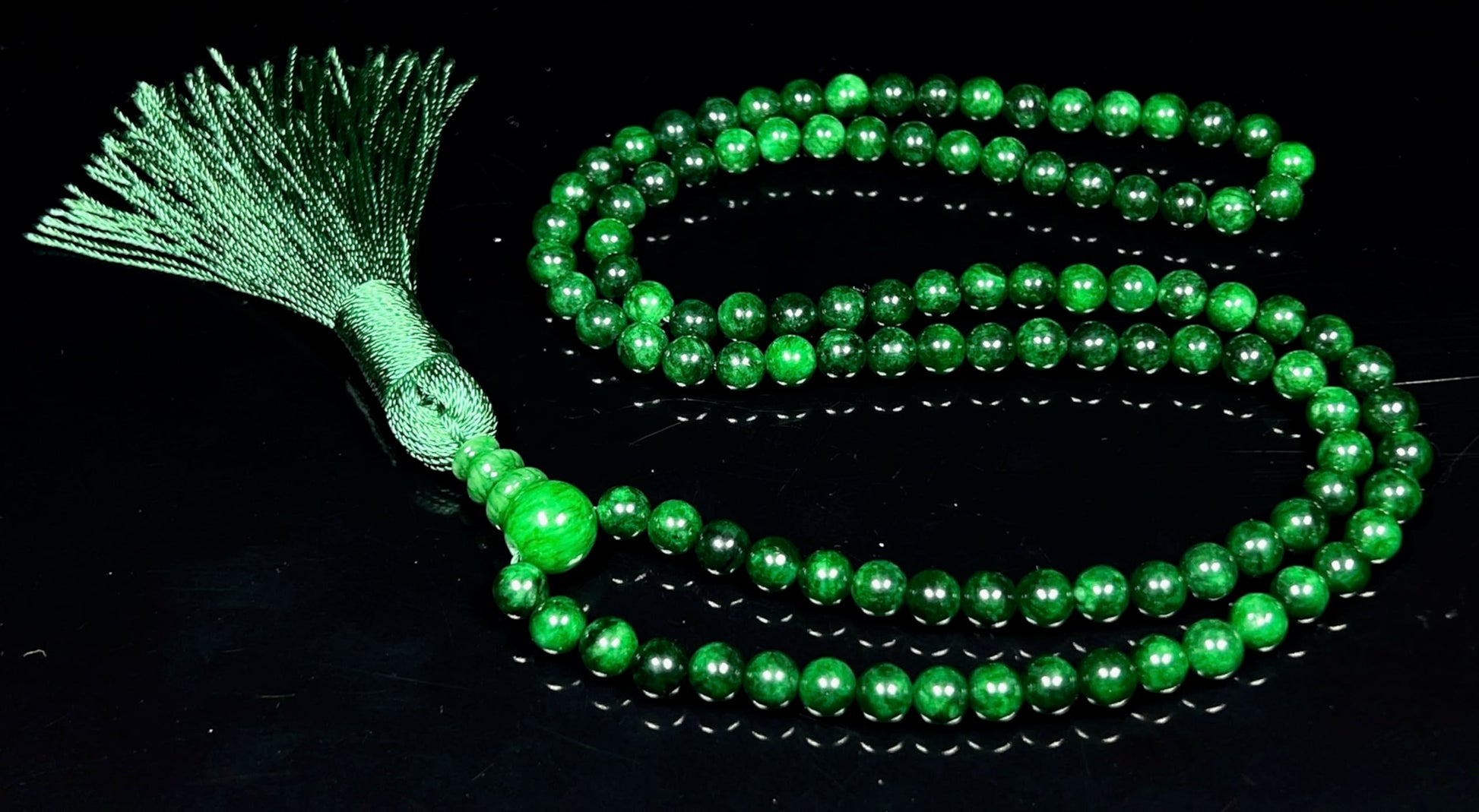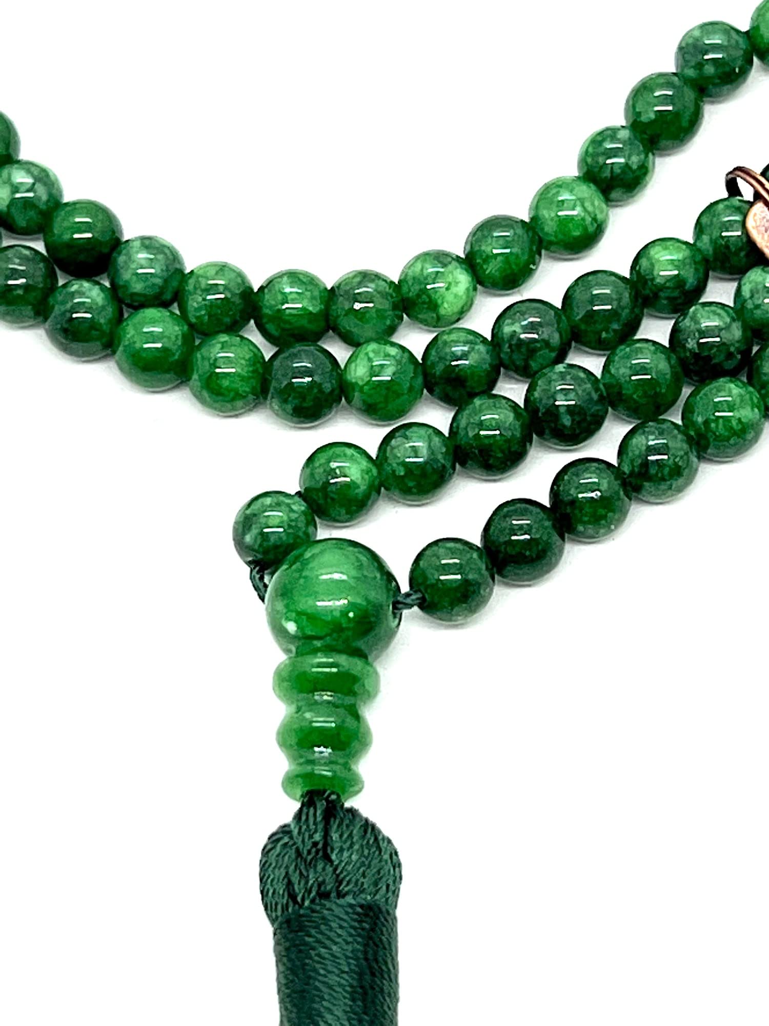 - Elevate your spiritual practice and style with our Handmade Green Jade Mala Beads Necklace, meticulously crafted with 108 beads for meditation, intention-setting, and mindful adornment. Sourced ethically and fashioned with care, each bead carries the serene energy of natural Green Jade, a stone revered for its harmonizing, balancing, and abundance-attracting properties.