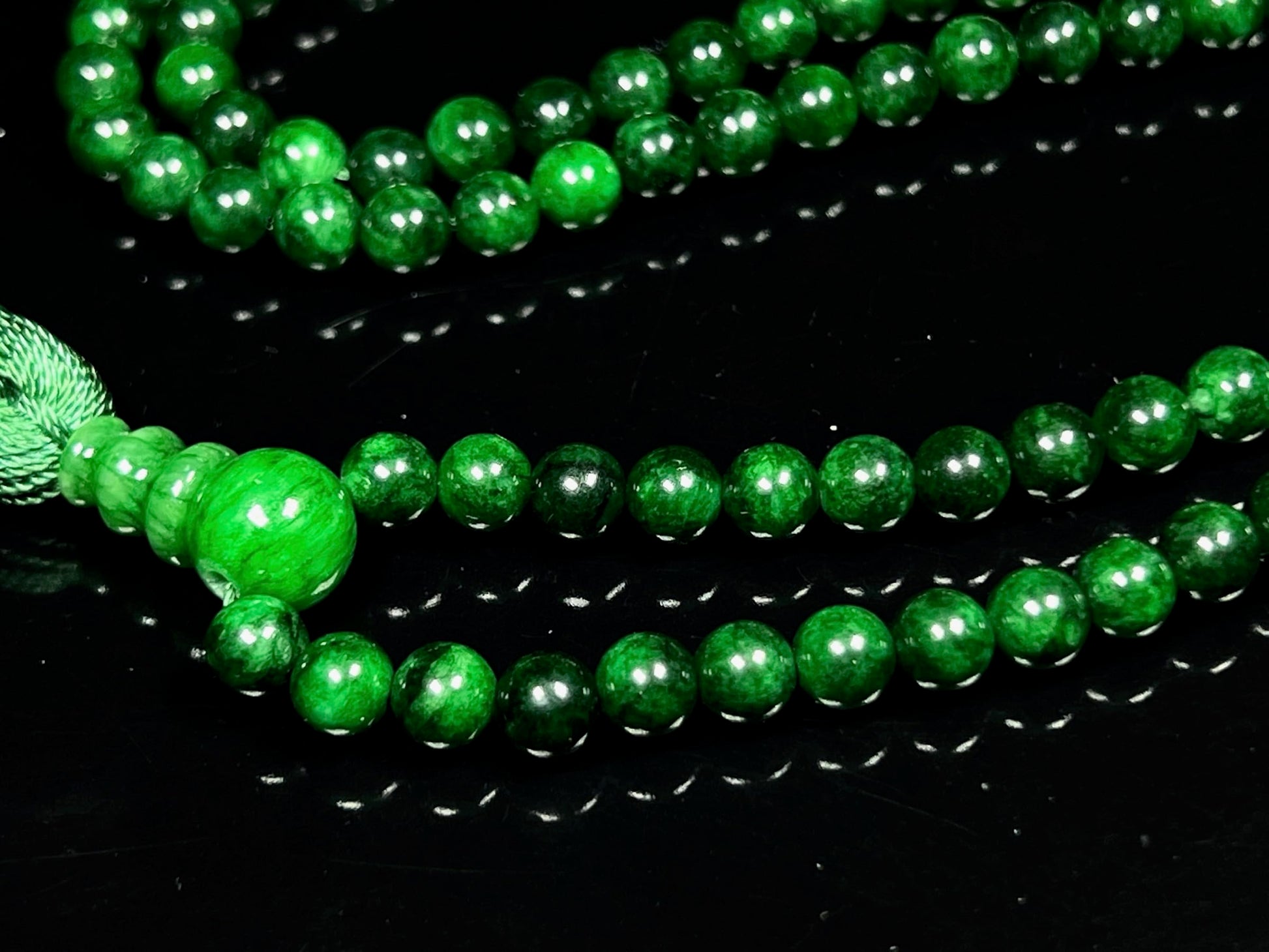 - ✨ Why Choose Our Green Jade Mala? ✔ Natural & Ethically Sourced – Each bead is hand-selected for purity and authenticity. ✔ Handmade – Durable and secure, with a traditional guru bead and tassel for a sacred finish. ✔ Balances the Heart Chakra – Green Jade resonates with love, compassion, and emotional harmony. ✔ May Birthstone – A meaningful gift for Taurus and Gemini season or anyone drawn to its tranquil energy. ✔ Available in 6mm & 8mm – Perfect for layering, wearing as a necklace, or using in meditation.