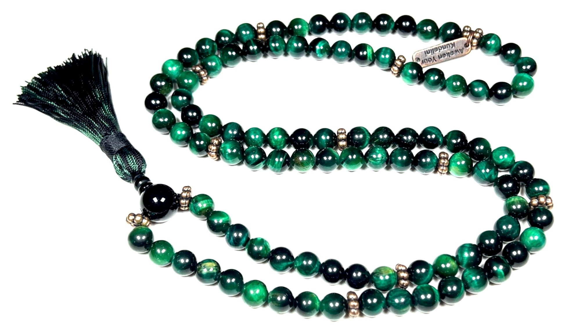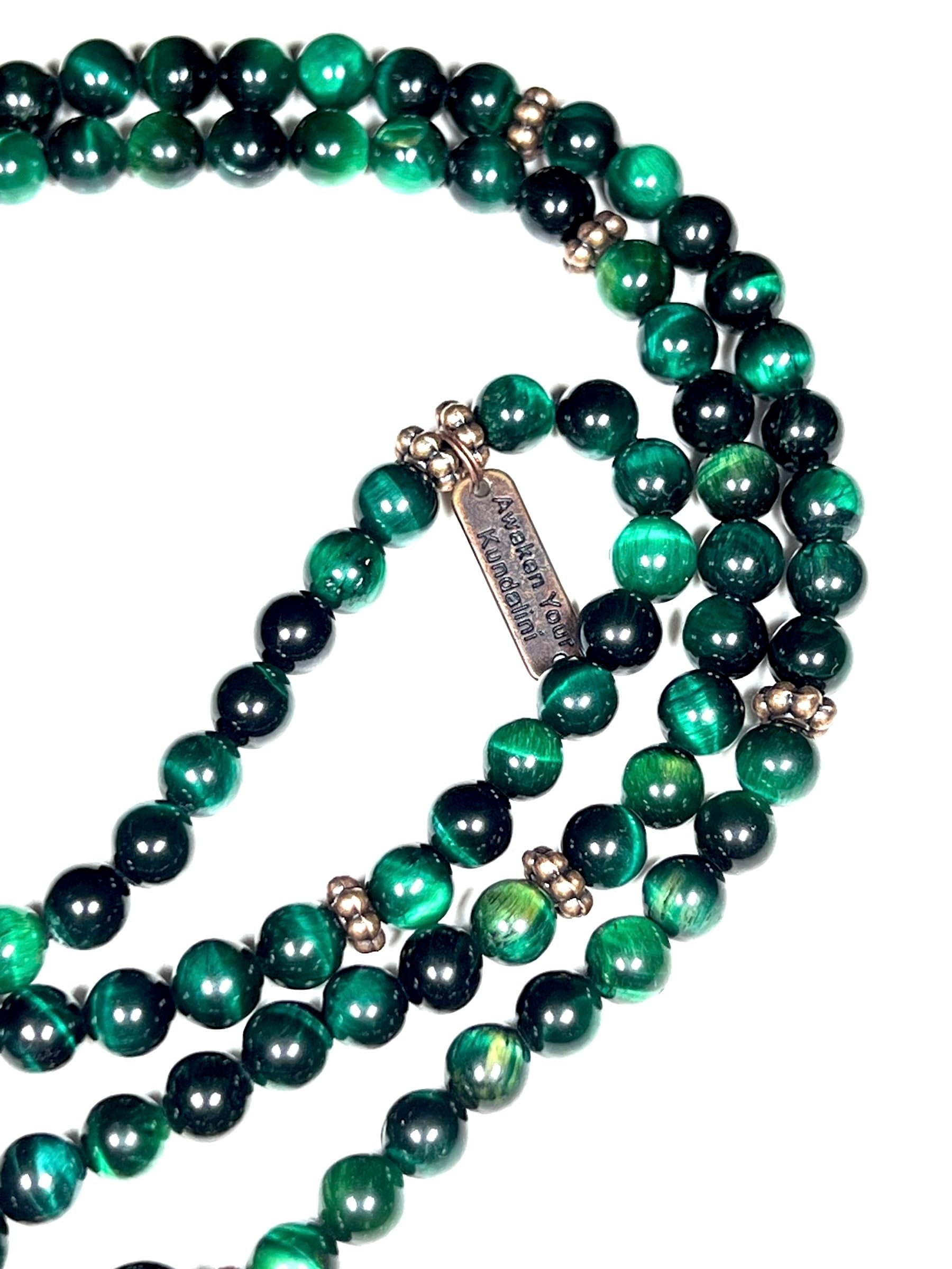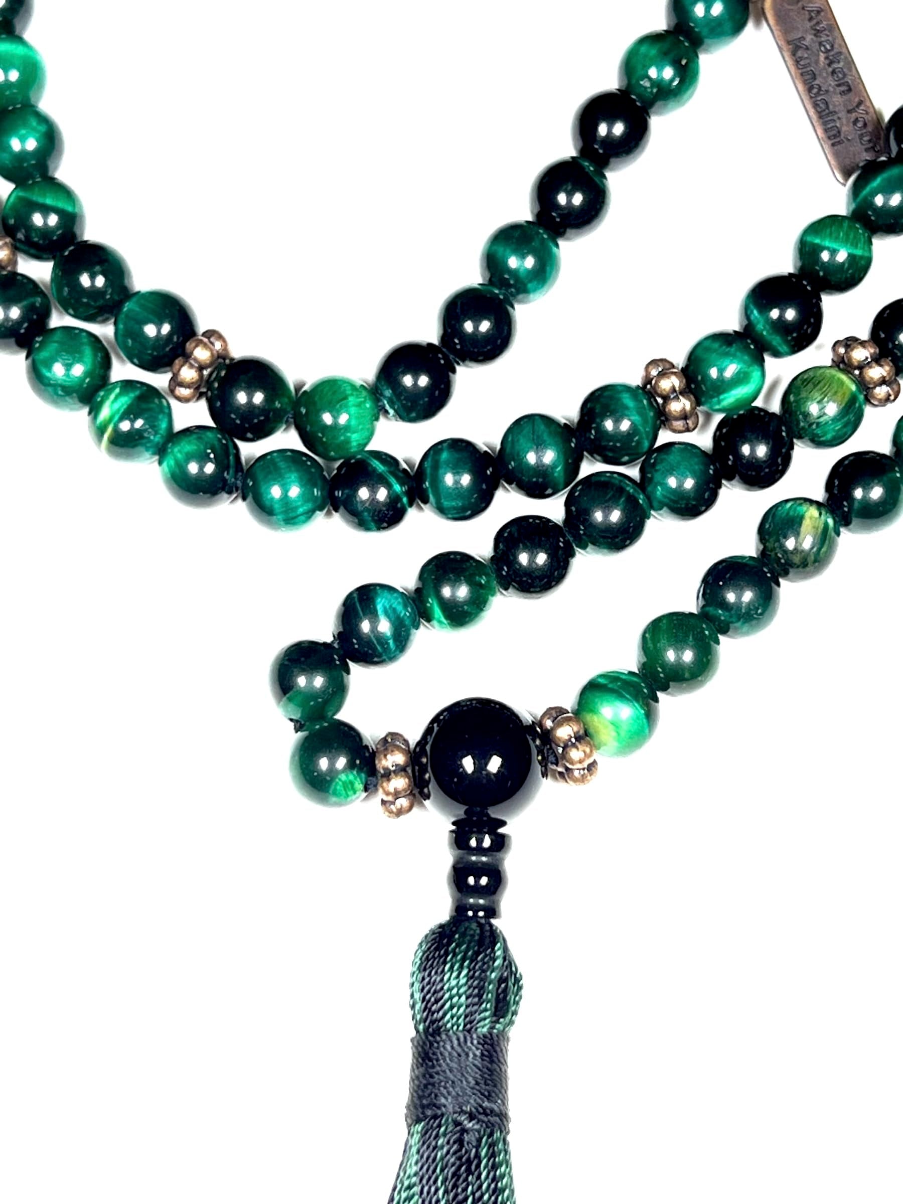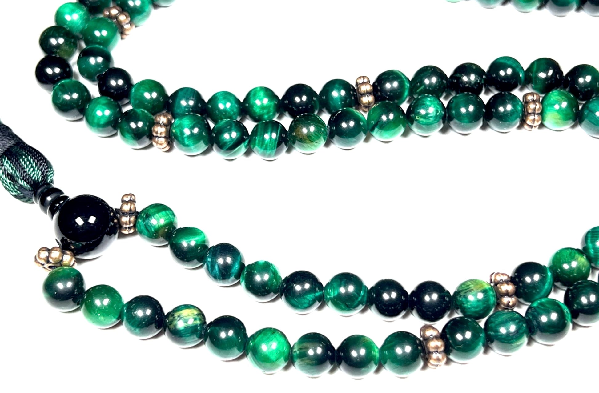 - Elevate your spiritual practice with our Handmade Green Tiger's Eye Mala Beads Necklace, a stunning piece designed for meditation, mindfulness, and personal adornment. Each 8mm Green Tiger's Eye bead is carefully selected for its natural beauty and energy, featuring an antique polish finish that enhances its earthy charm. Accented with copper spacers, this mala combines grounding energy with a touch of elegance. Featuring 108 beads, a sacred number in meditation practices, this mala is a perfect blend of spiritual significance and natural beauty. Whether you're meditating, chanting, or simply accessorizing, this mala will inspire you to stay grounded and connected to your inner self.