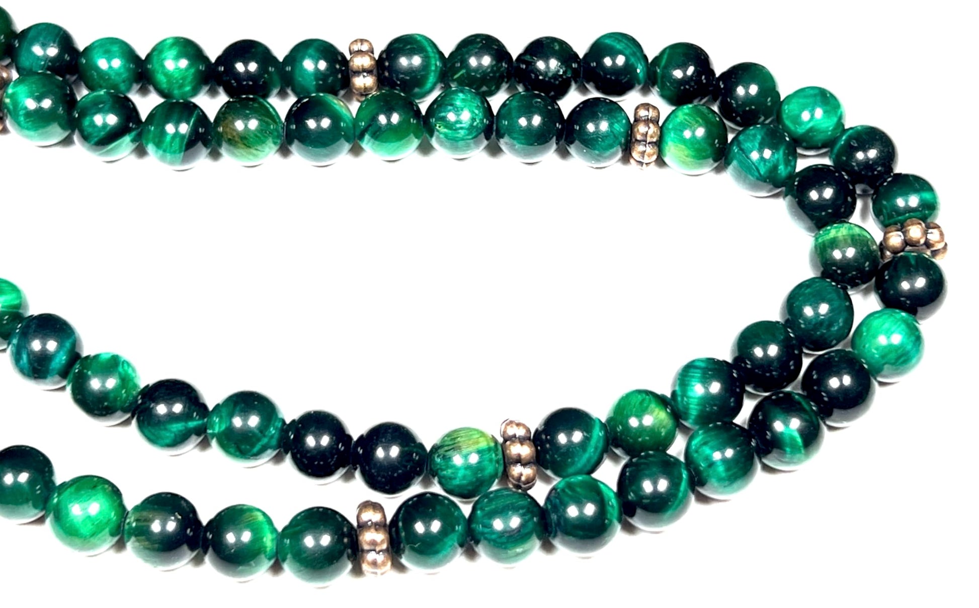 Handmade Green Tiger's Eye Mala Beads Necklace – 8mm 108 Beads - Copper Spacers – Heart Chakra & Taurus Birthstone