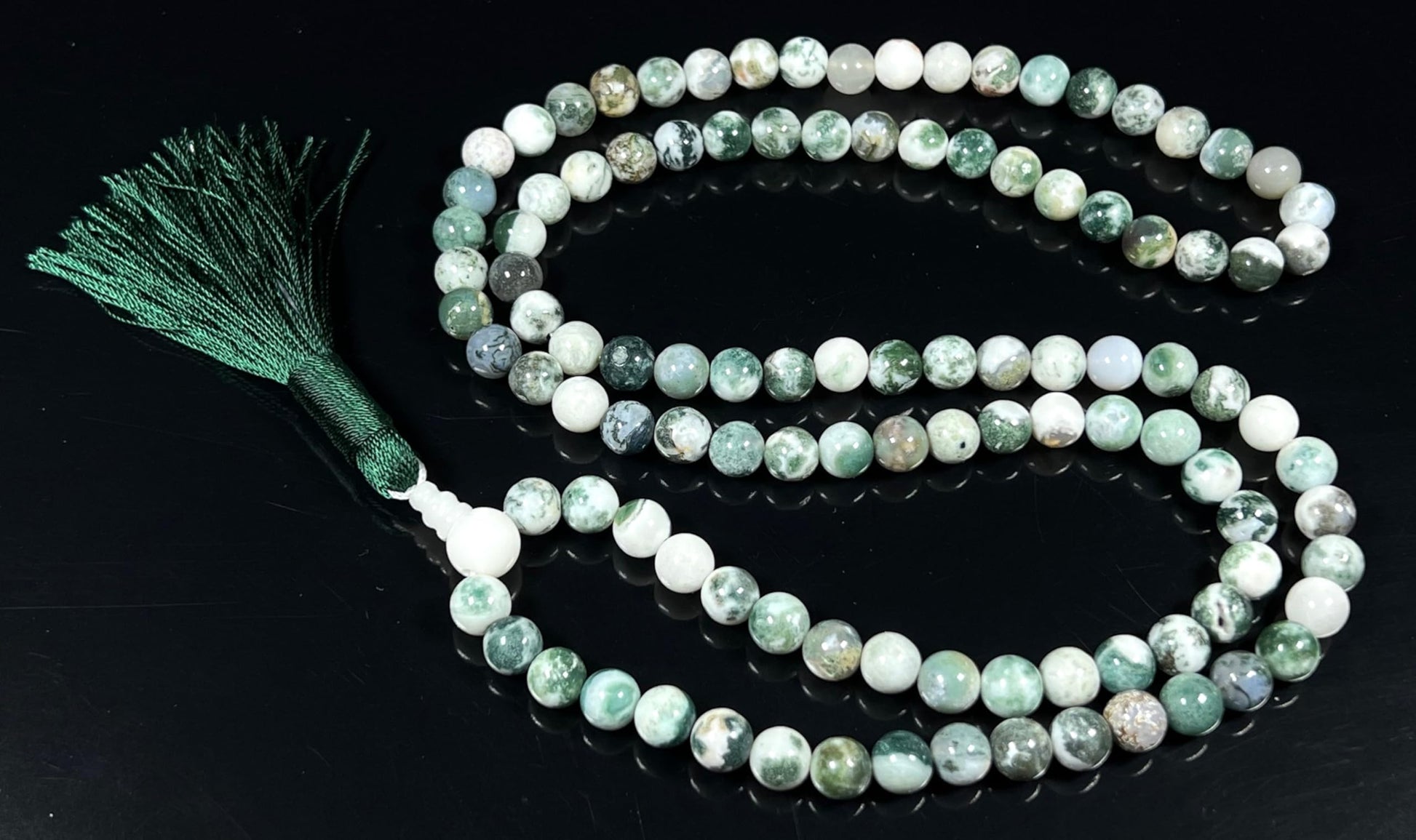 Handmade Green Tree Agate Mala Beads Necklace | 8mm 108 Beads | Hand-Knotted Spiritual Jewelry | Birthstone & Chakra Energy
