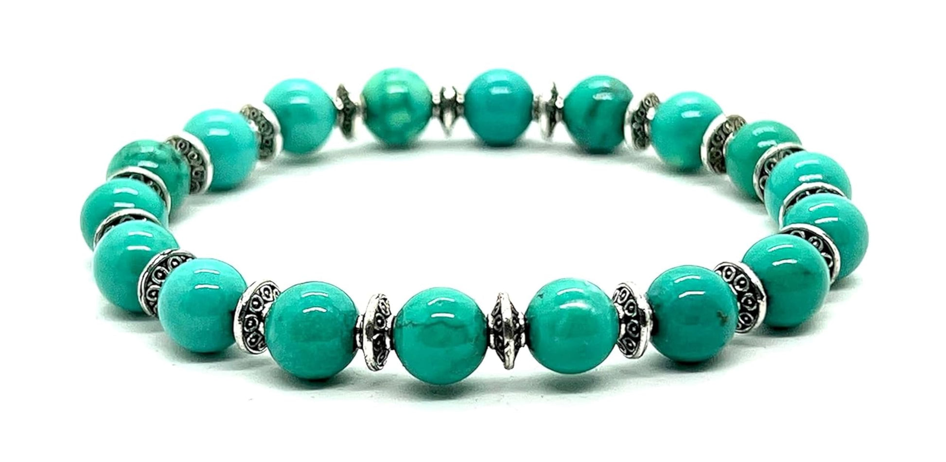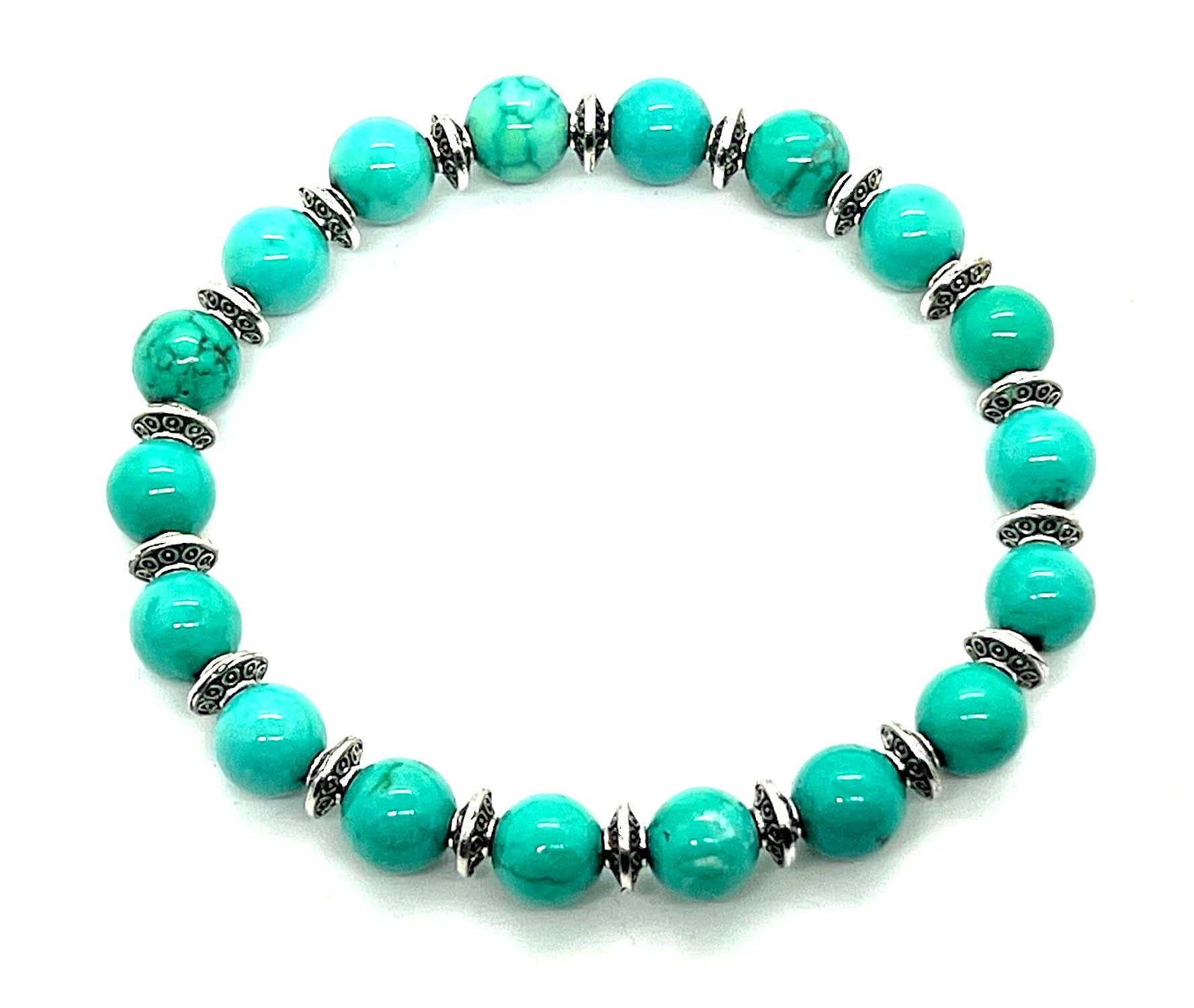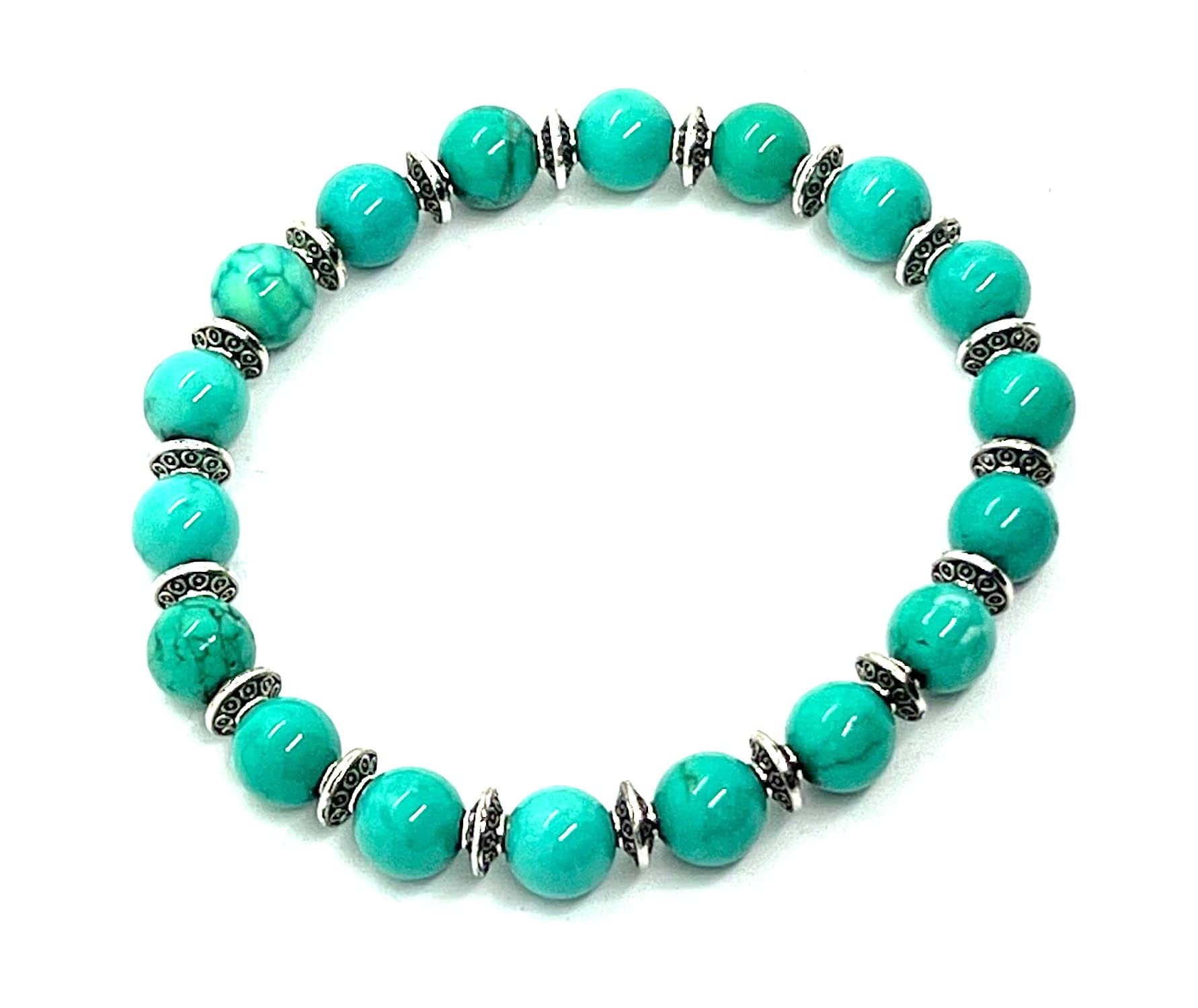 Handmade Turquoise Stretch Bracelet (8mm Beads, Silver Spacers) - Sagittarius Birthstone, Zodiac Sign, and Throat Chakra - Wrist Size Approx. 7 Inches