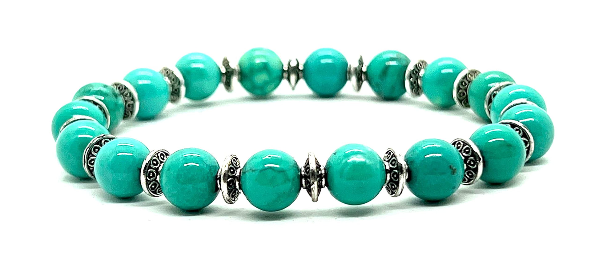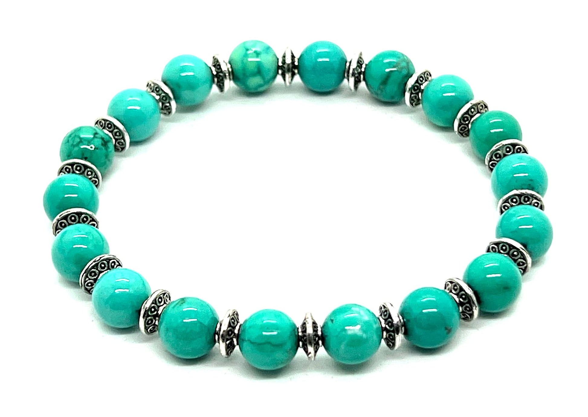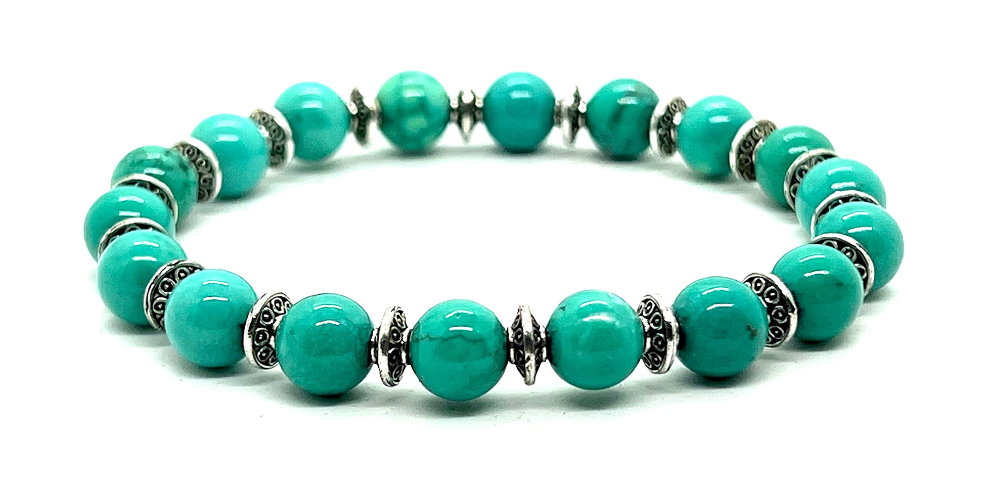 Handmade Turquoise Stretch Bracelet (8mm Beads, Silver Spacers) - Sagittarius Birthstone, Zodiac Sign, and Throat Chakra - Wrist Size Approx. 7 Inches