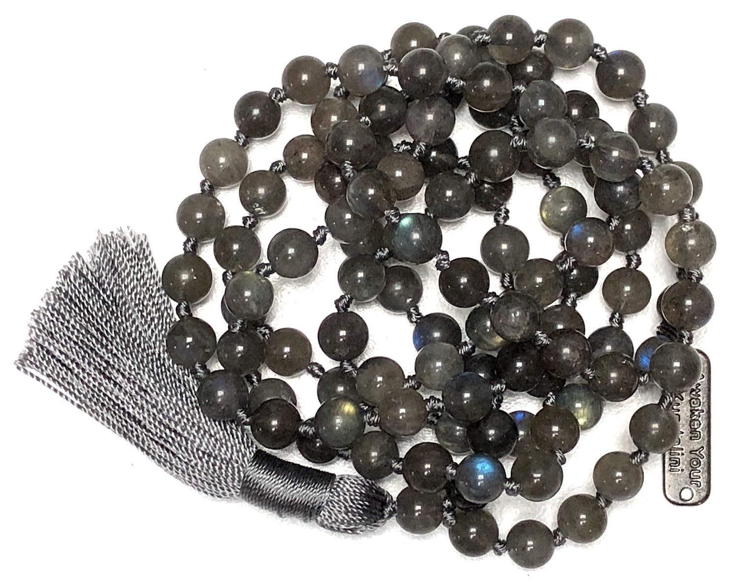 The Labradorite Mala Necklace from the VAAK & ALOKA Collections by Awaken Your Kundalini is a sacred strand of 108 natural Labradorite beads, carefully hand-knotted for strength, flow, and intention. This powerful mala carries the energy of healing, transformation, and self-expression, making it a perfect companion for meditation, mantra recitation, and spiritual practice.