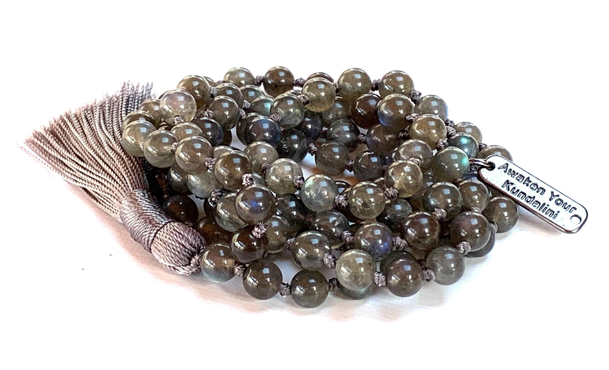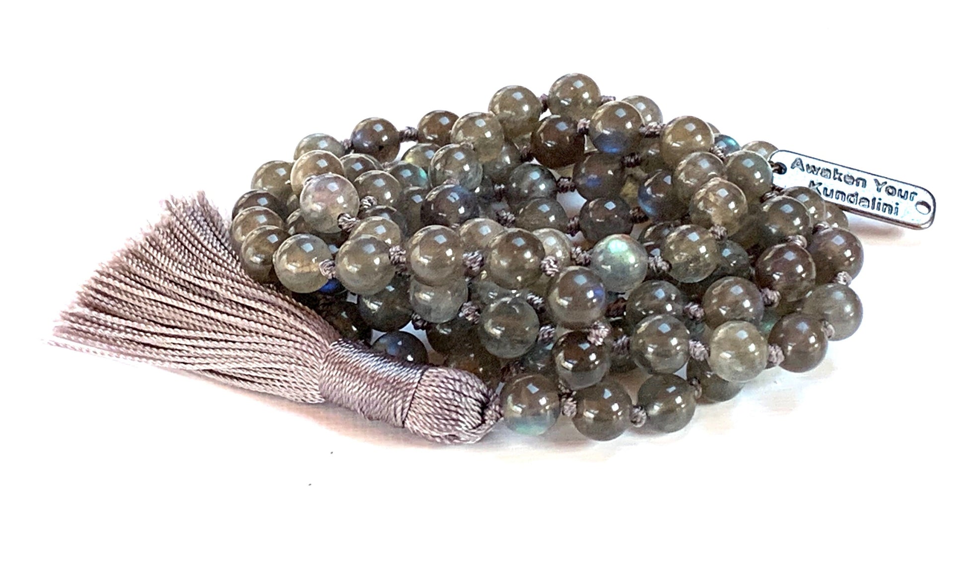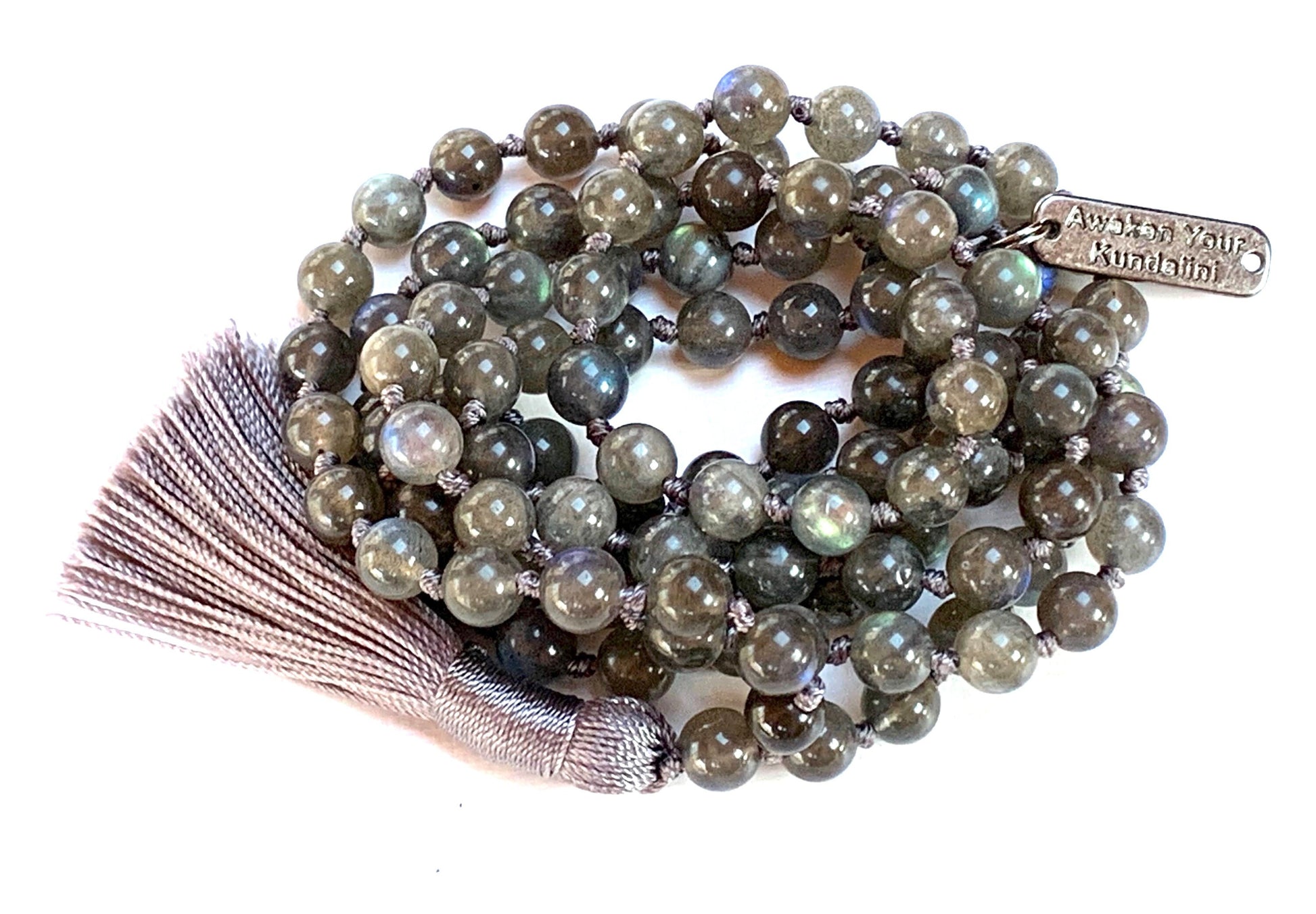The Labradorite Mala Necklace from the VAAK & ALOKA Collections by Awaken Your Kundalini is a sacred strand of 108 natural Labradorite beads, carefully hand-knotted for strength, flow, and intention. This powerful mala carries the energy of healing, transformation, and self-expression, making it a perfect companion for meditation, mantra recitation, and spiritual practice.