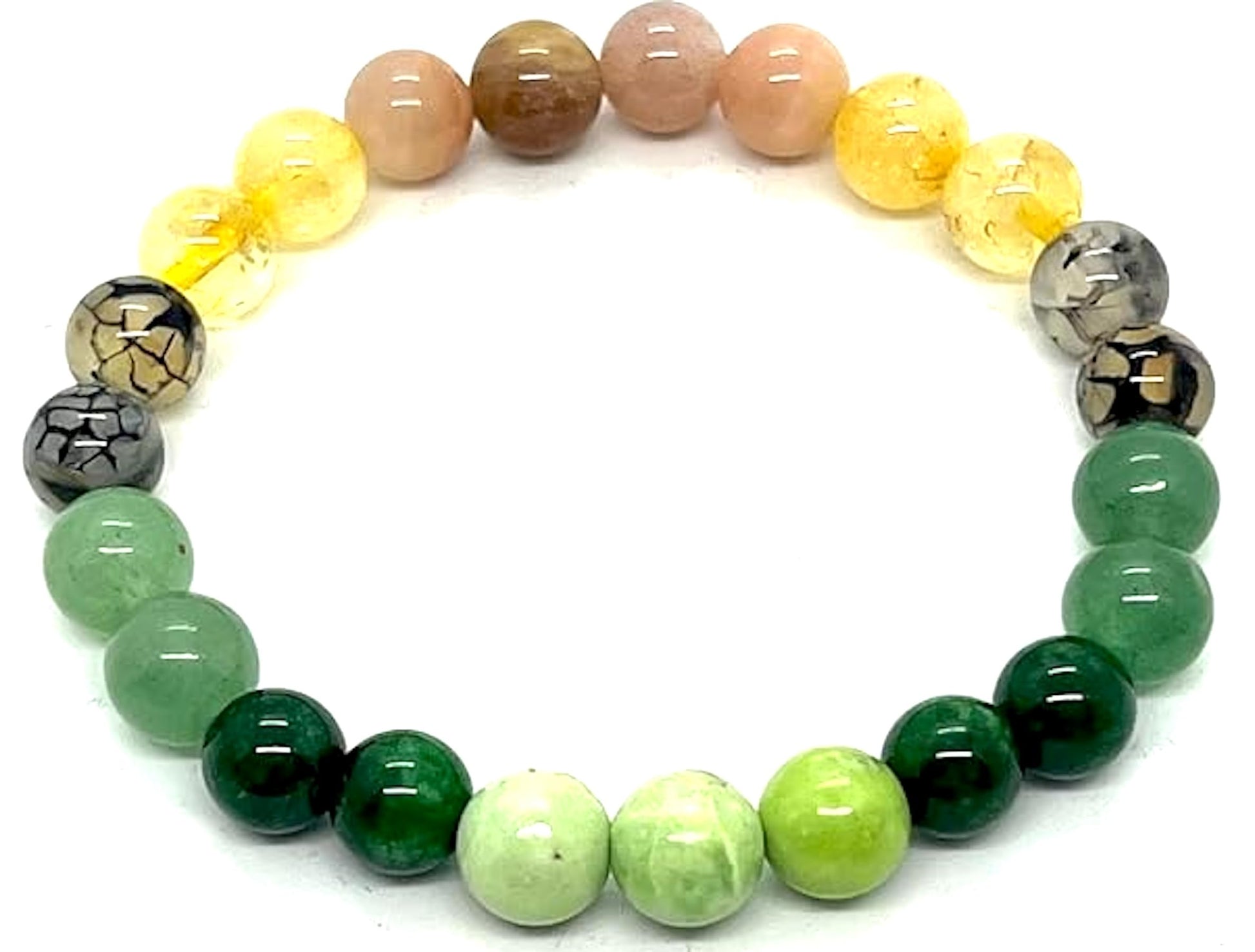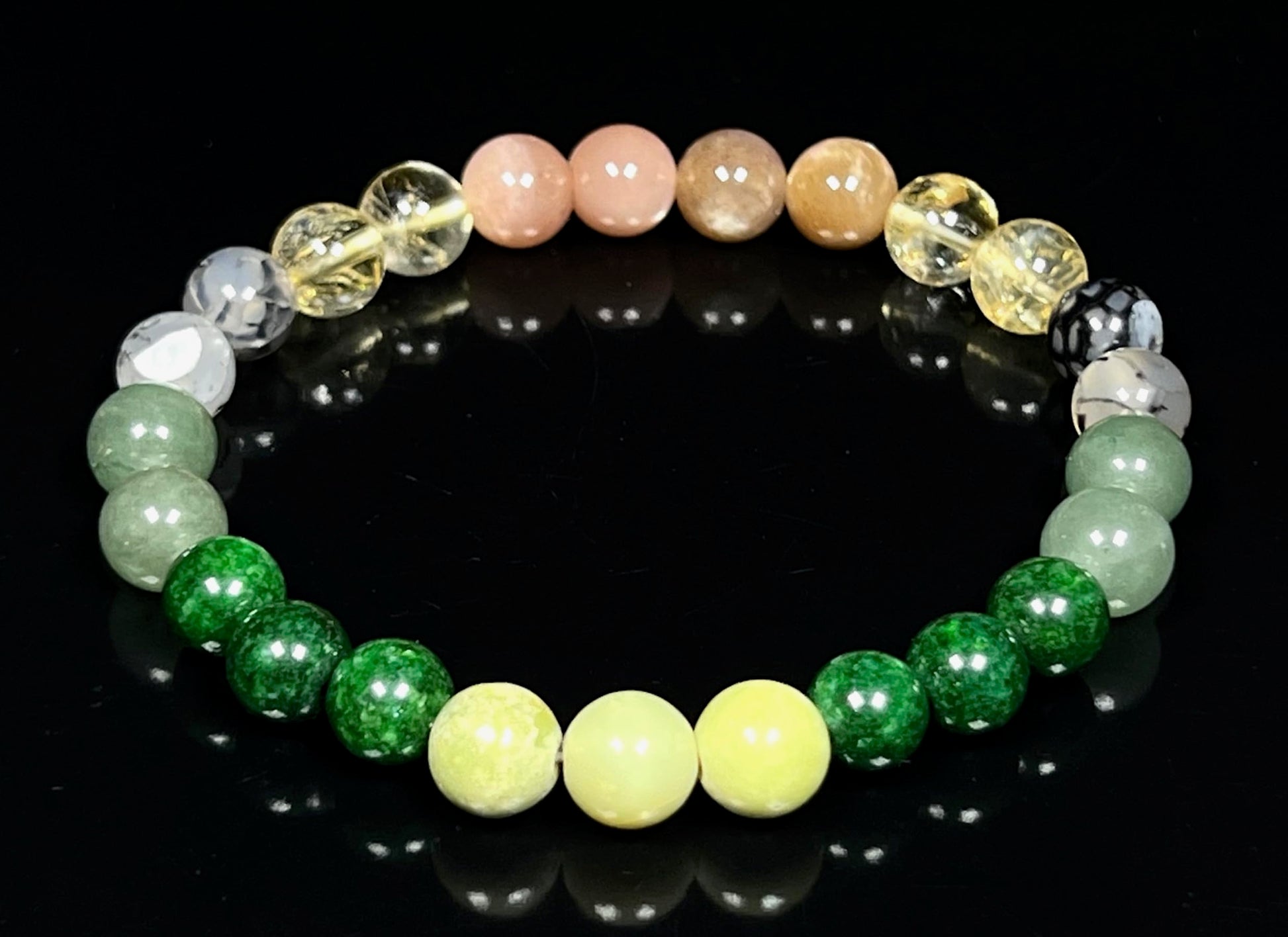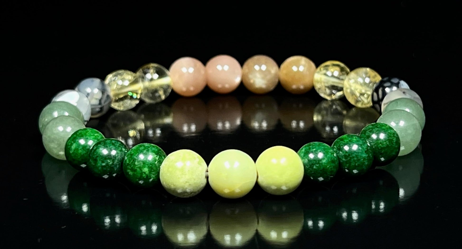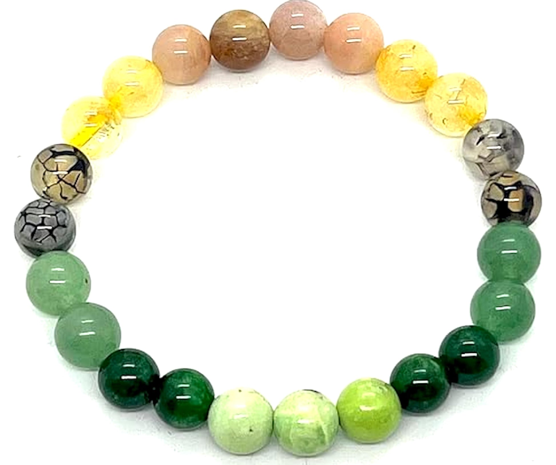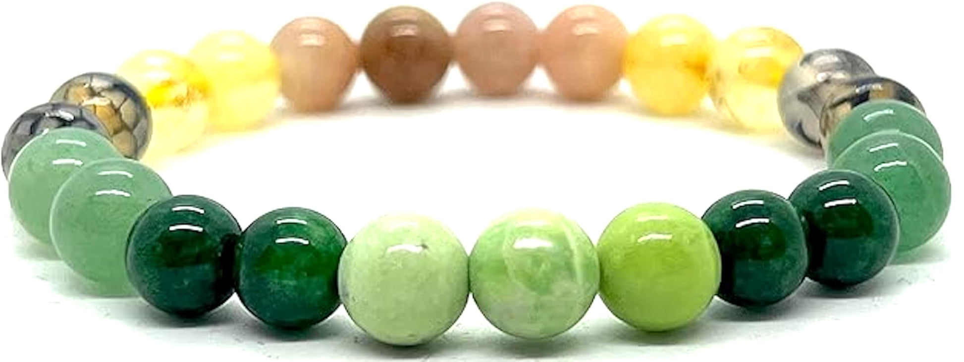 - Add some positive energy to your life with our beautiful "Energized Crystals of Luck" bracelet. This stunning Mala Beads bracelet is designed to bring good fortune and abundance to your life. Made from high-quality gemstones, including Citrine, Aventurine, Chrysoprase, Jade, Sunstone, Tourmilated Quartz, this bracelet will enhance your energy and help you attract wealth, luck, and success.