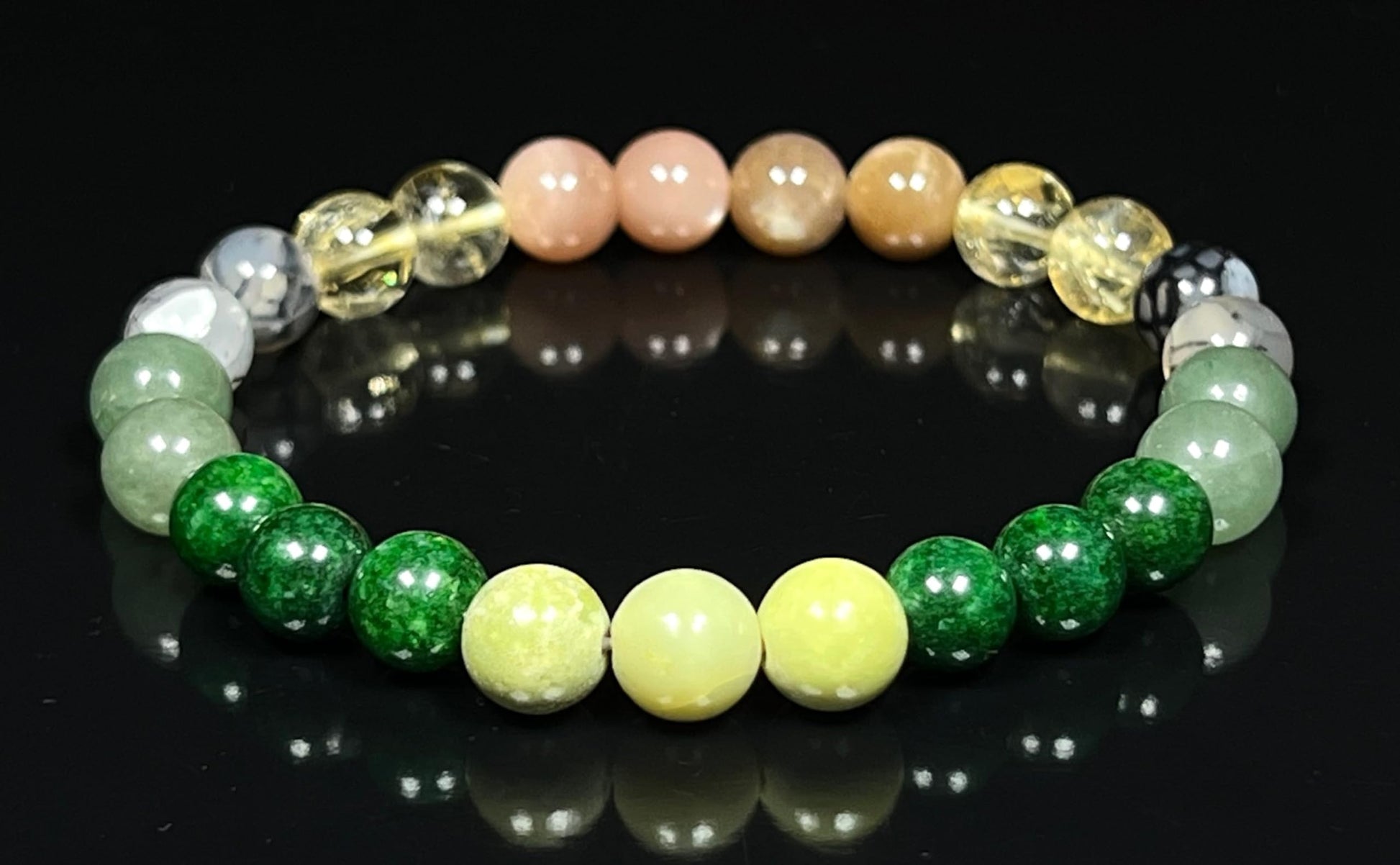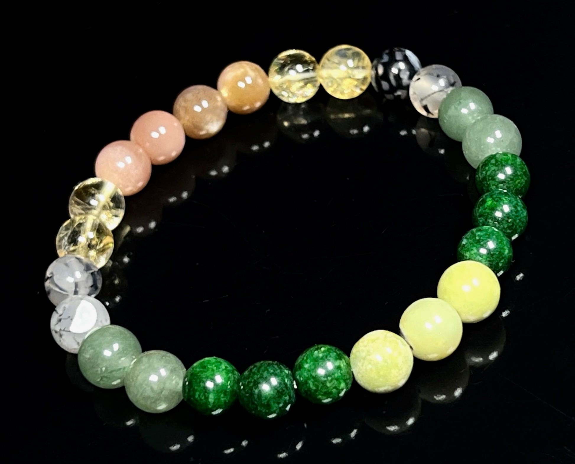 - Each crystal on this bracelet is carefully chosen and energized to amplify its power and effectiveness. Citrine is known as the stone of abundance and prosperity, Aventurine promotes wealth and success, Chrysoprase attracts good luck and prosperity, Jade is a symbol of good fortune, Sunstone helps increase motivation and confidence, and Tourmilated Quartz is a powerful amplifier that enhances the energy of other stones.