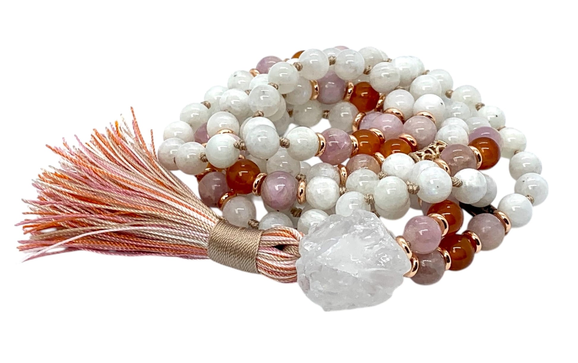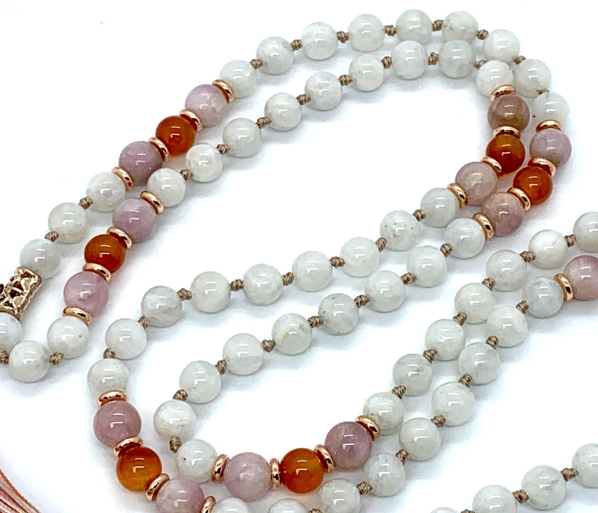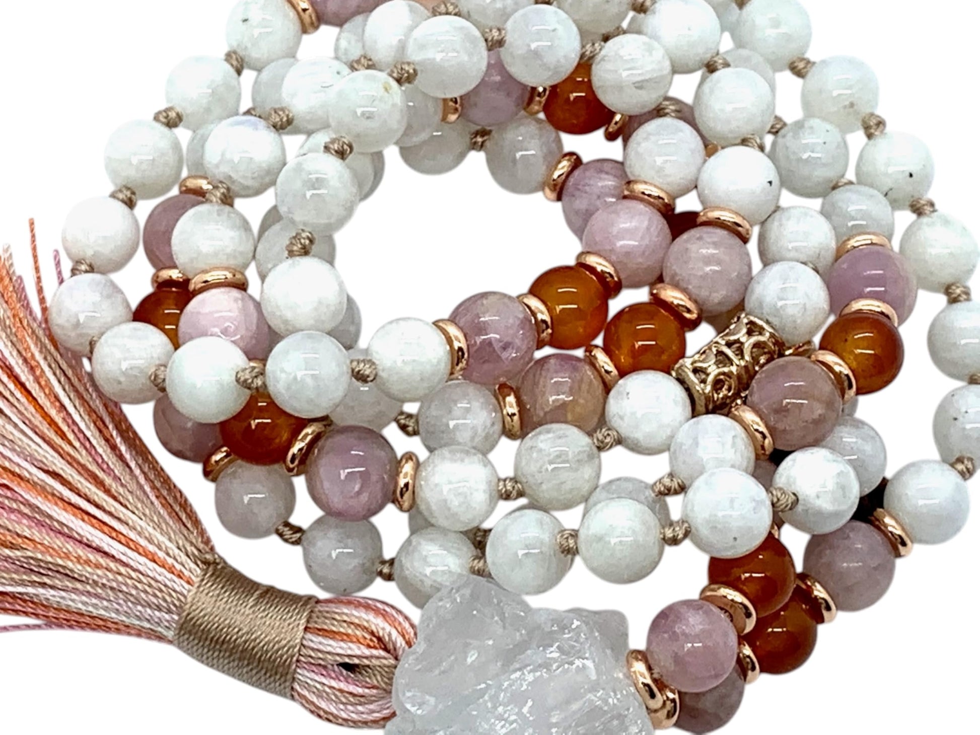 - #LunessaMala #MoonstoneMagic #KunziteLove #CarnelianCreativity #SacredFeminine #HandKnottedMala #108Beads #RoseGoldJewelry #ChakraHarmony #EthicalGemstones