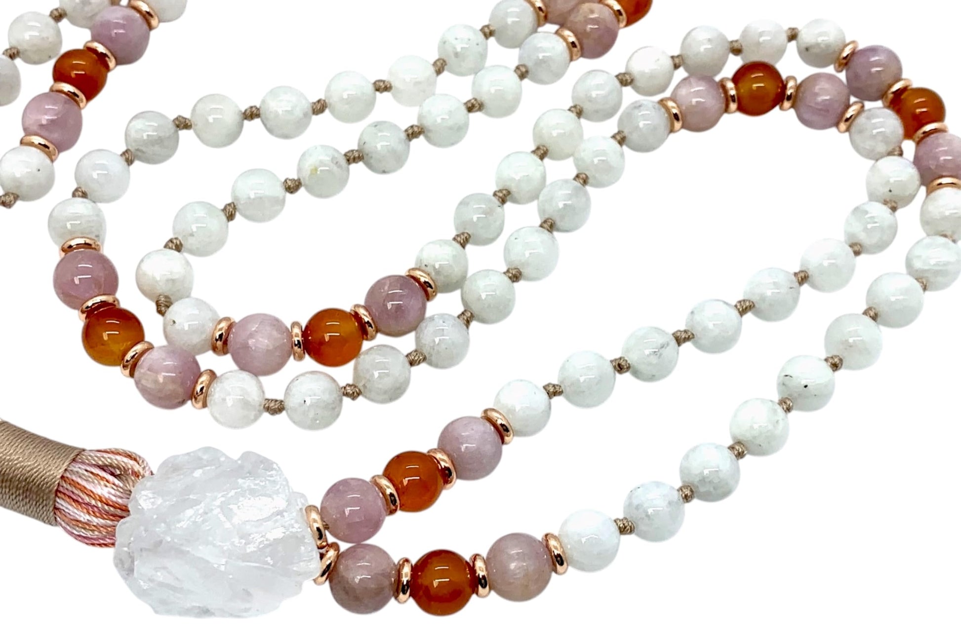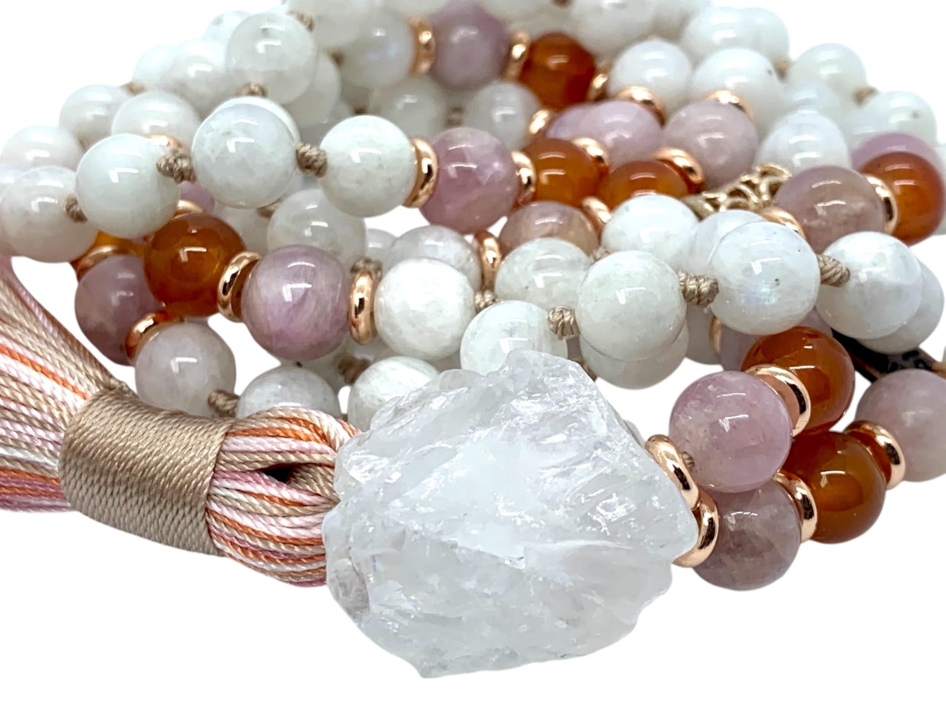 Lunessa Mala Necklace – Hand Knotted Moonstone, Kunzite & Carnelian with Raw Quartz Guru | 8mm 108 Beads | Crown-to-Sacral Chakra Alignment | June & July Birthstones | Ethically Sourced