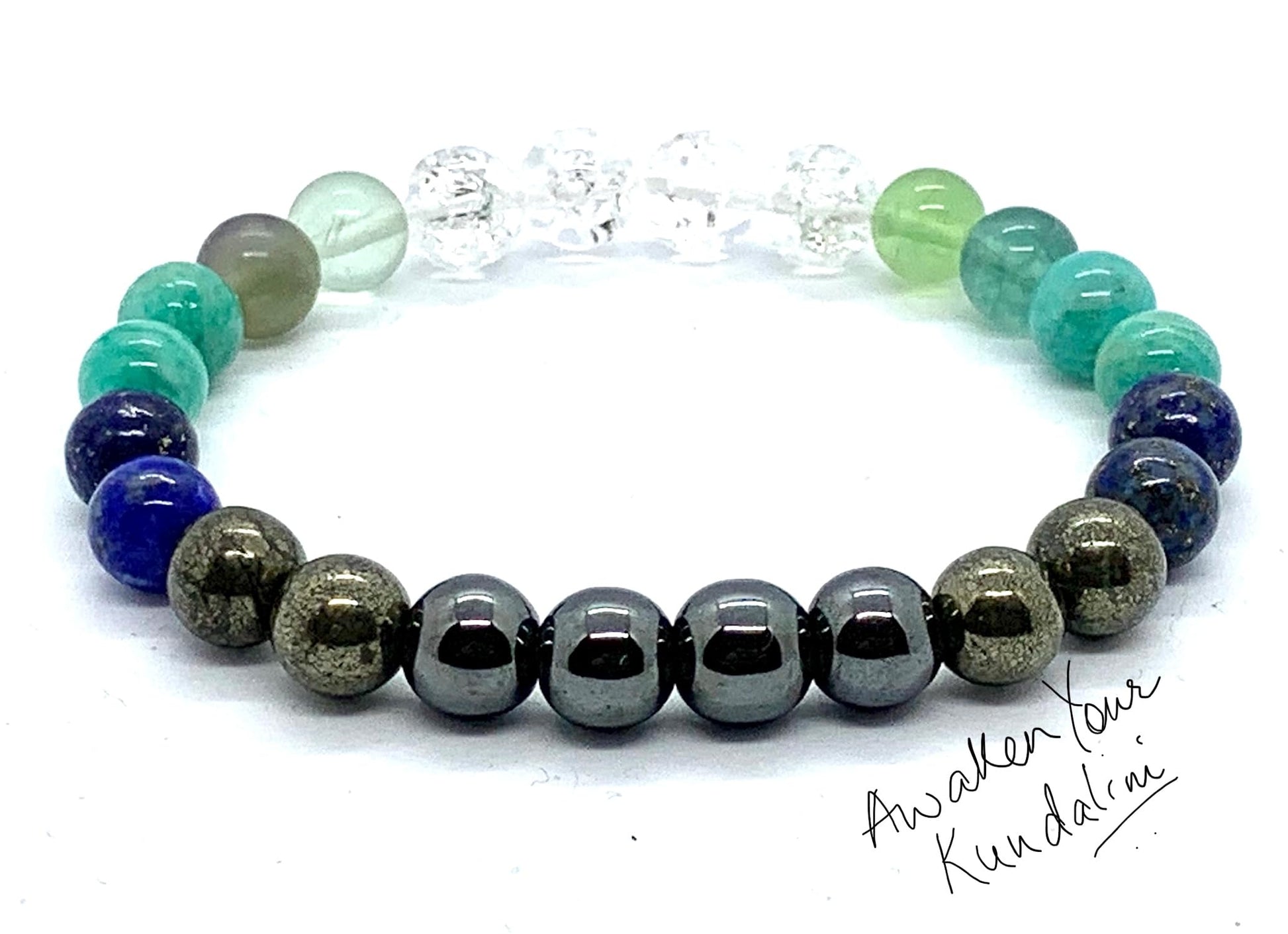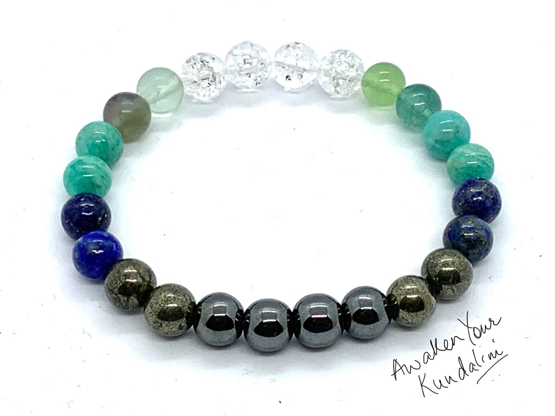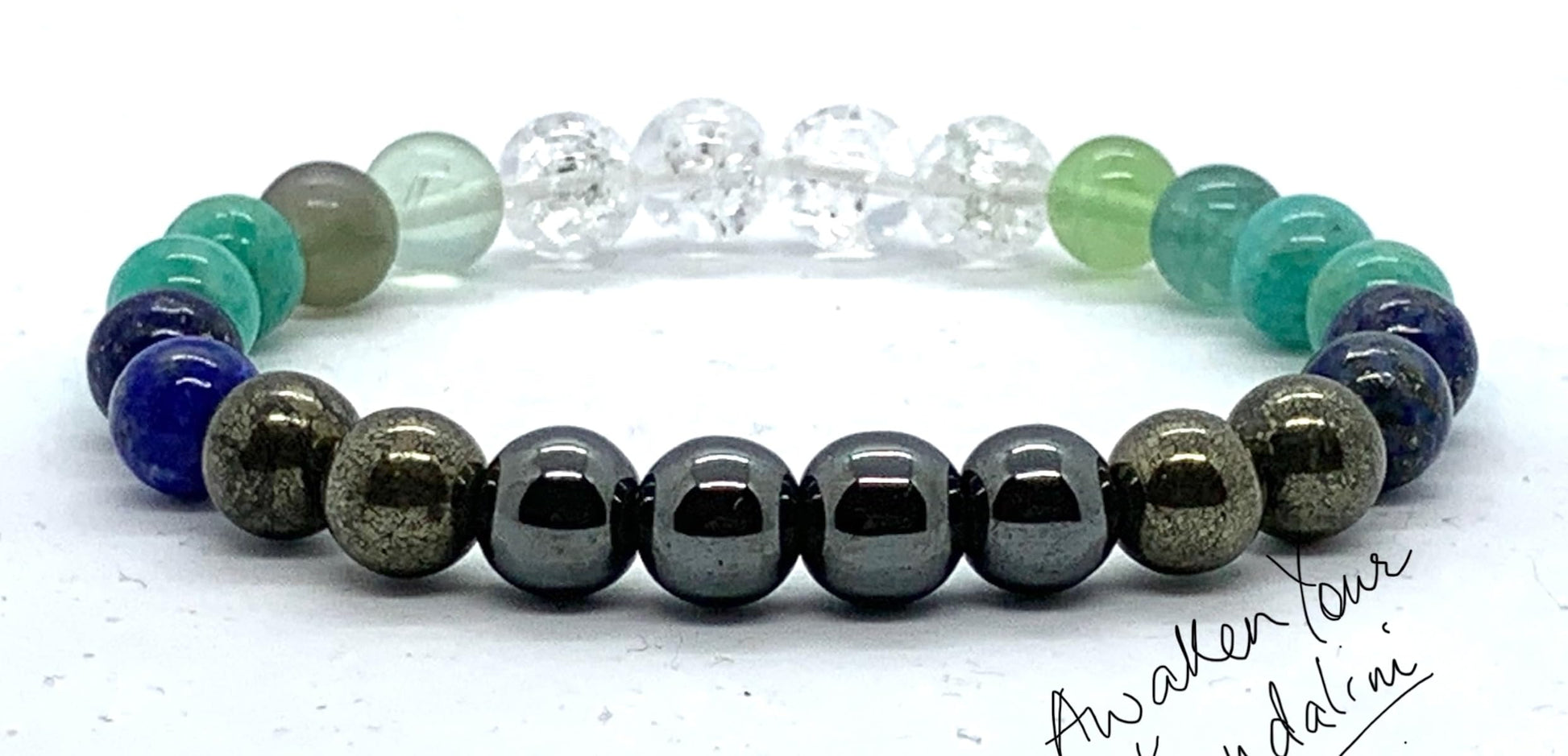 - #MercuryRetrograde #GeminiBirthstone #ThroatChakra #Pyrite #Hematite #LapisLazuli #Amazonite #Peridot #GreenAventurine #CrystalQuartz #StretchBracelet #CosmicJewelry #HealingGemstones #MentalClarity #Calmness #EnhanceCommunication #Intellect