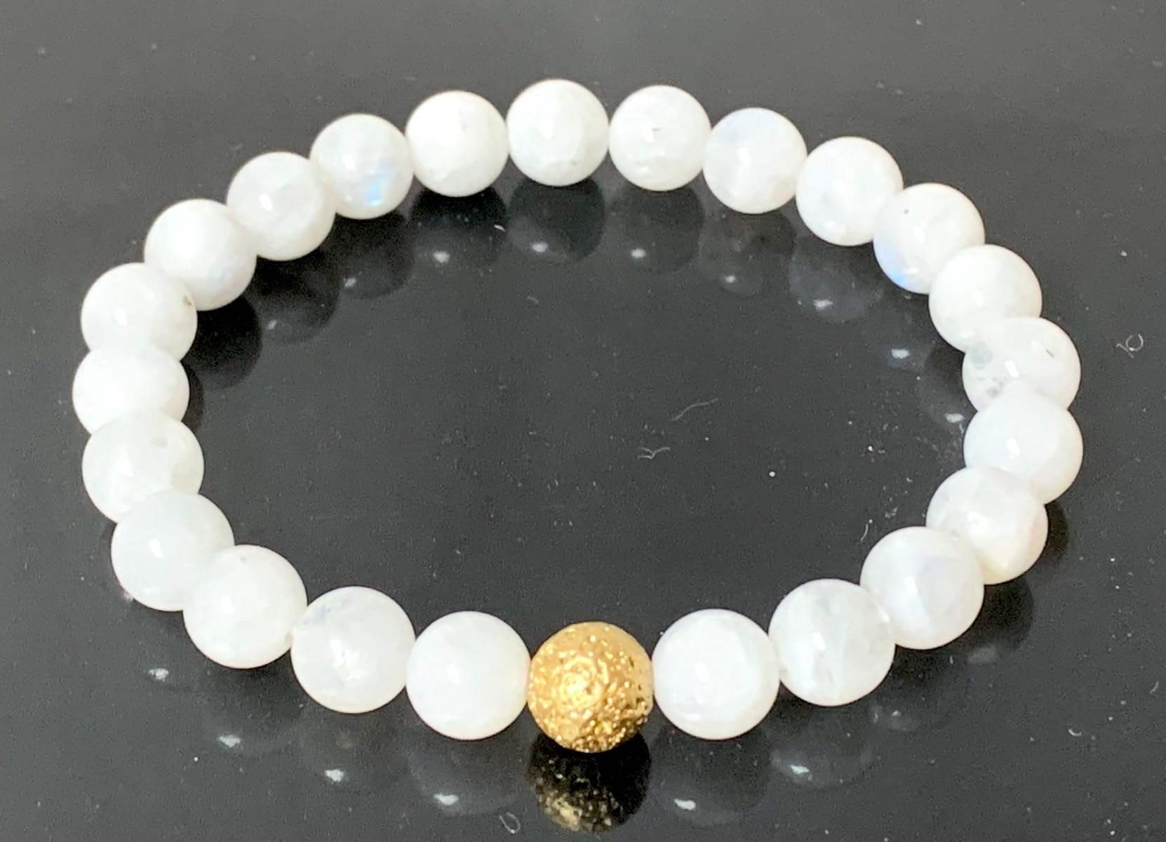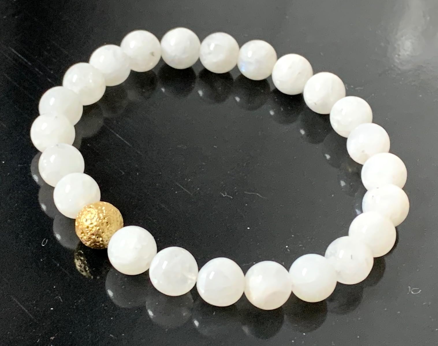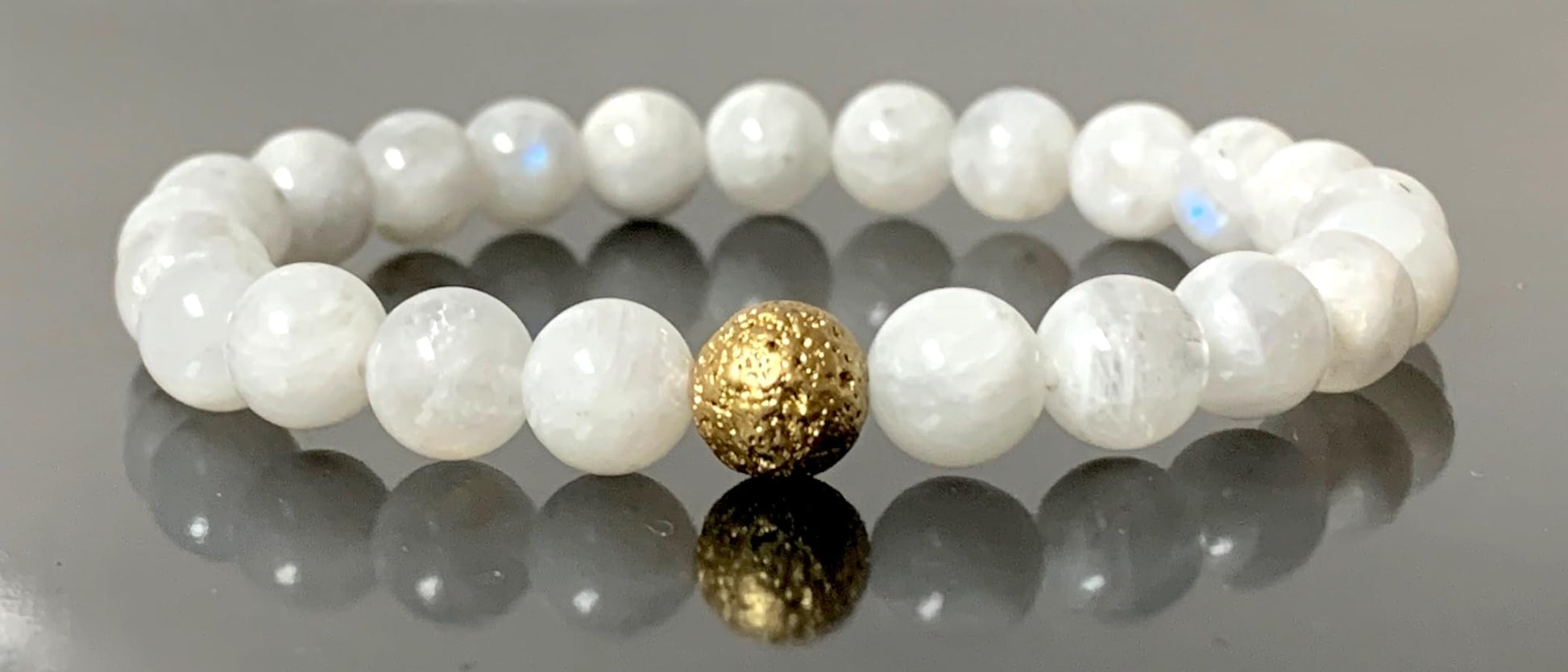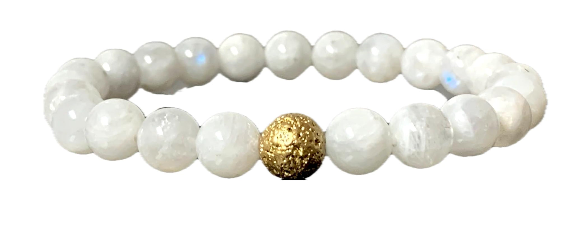 - This Moonstone Beads Stretch Bracelet is a blend of natural elegance and contemporary design, featuring 8mm Moonstone beads that glow with soft iridescence, complemented by plated Lava Beads in striking gold and silver tone finishes. Available in 6 to 9 inches, this adjustable bracelet fits comfortably on any wrist, making it a versatile piece for both casual and formal wear.