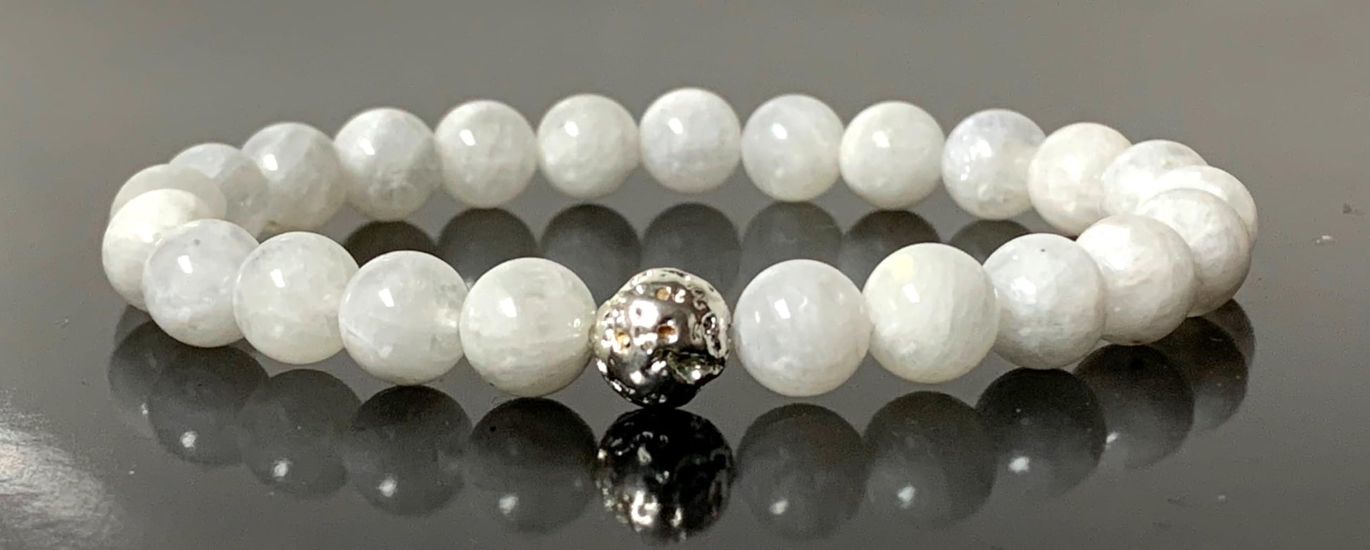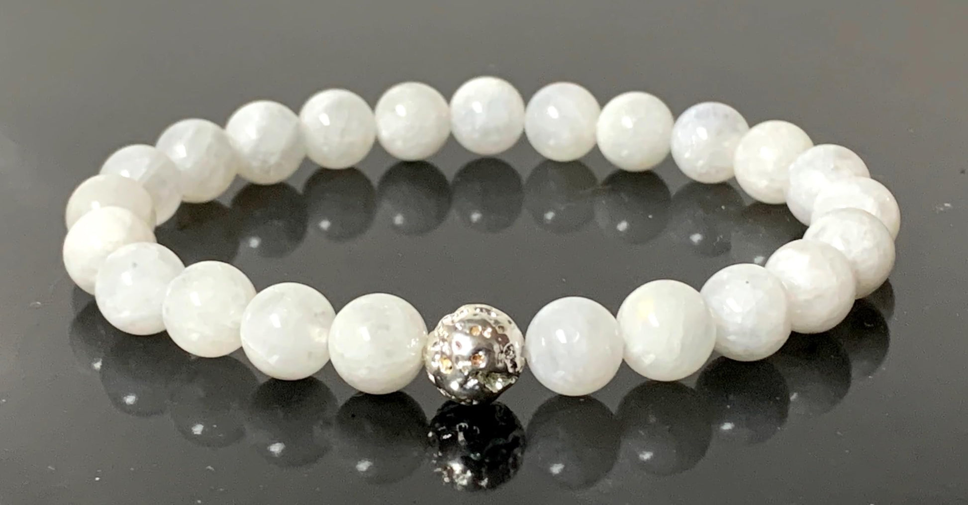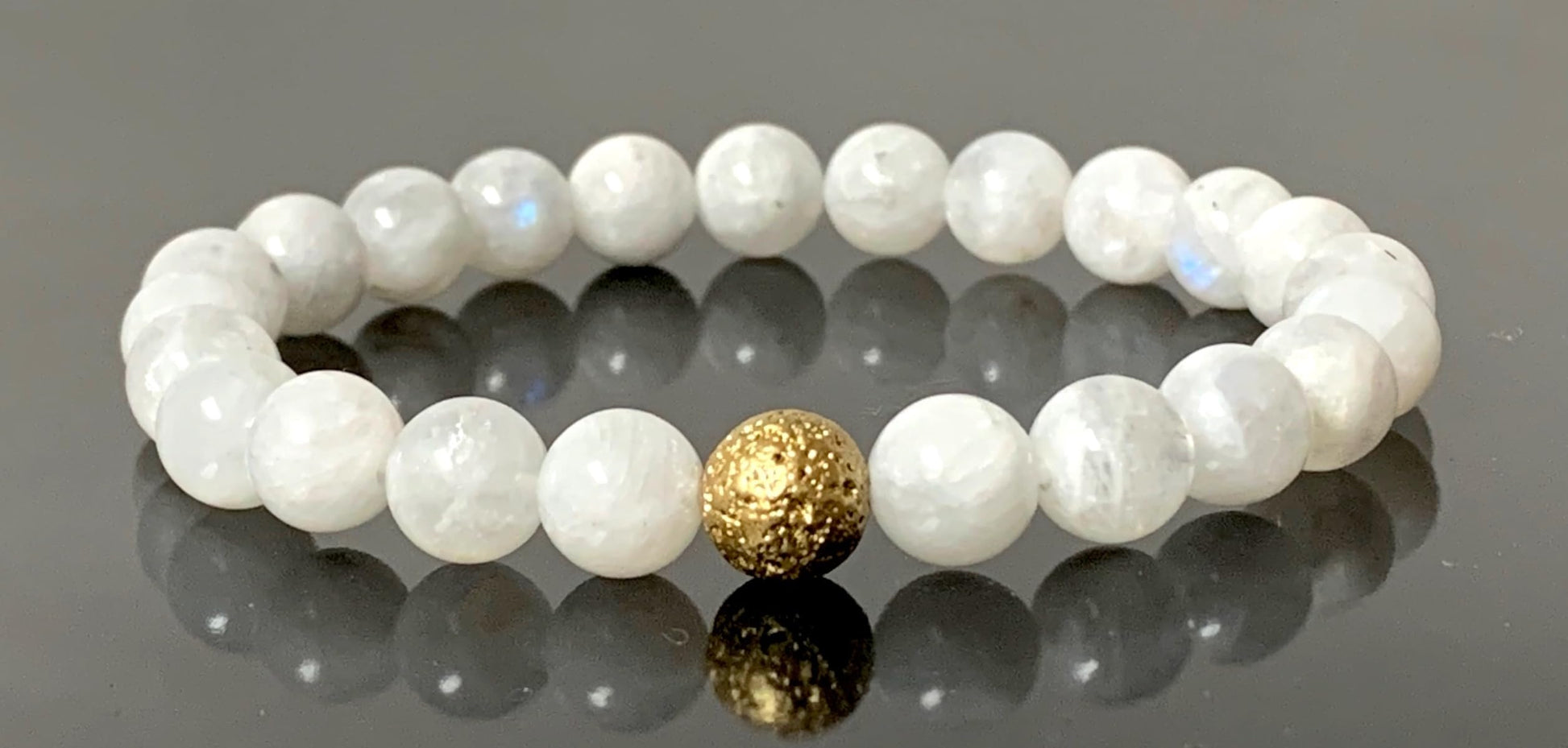 - This Moonstone Beads Stretch Bracelet is a blend of natural elegance and contemporary design, featuring 8mm Moonstone beads that glow with soft iridescence, complemented by plated Lava Beads in striking gold and silver tone finishes. Available in 6 to 9 inches, this adjustable bracelet fits comfortably on any wrist, making it a versatile piece for both casual and formal wear.