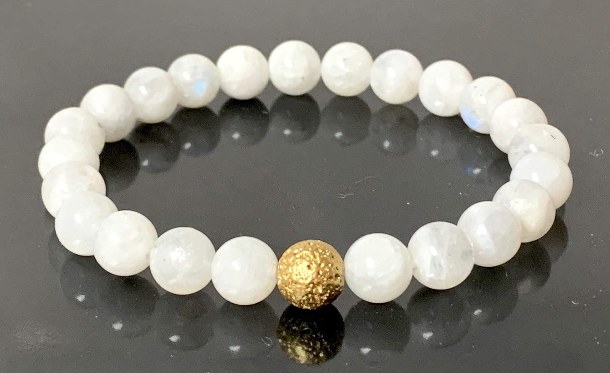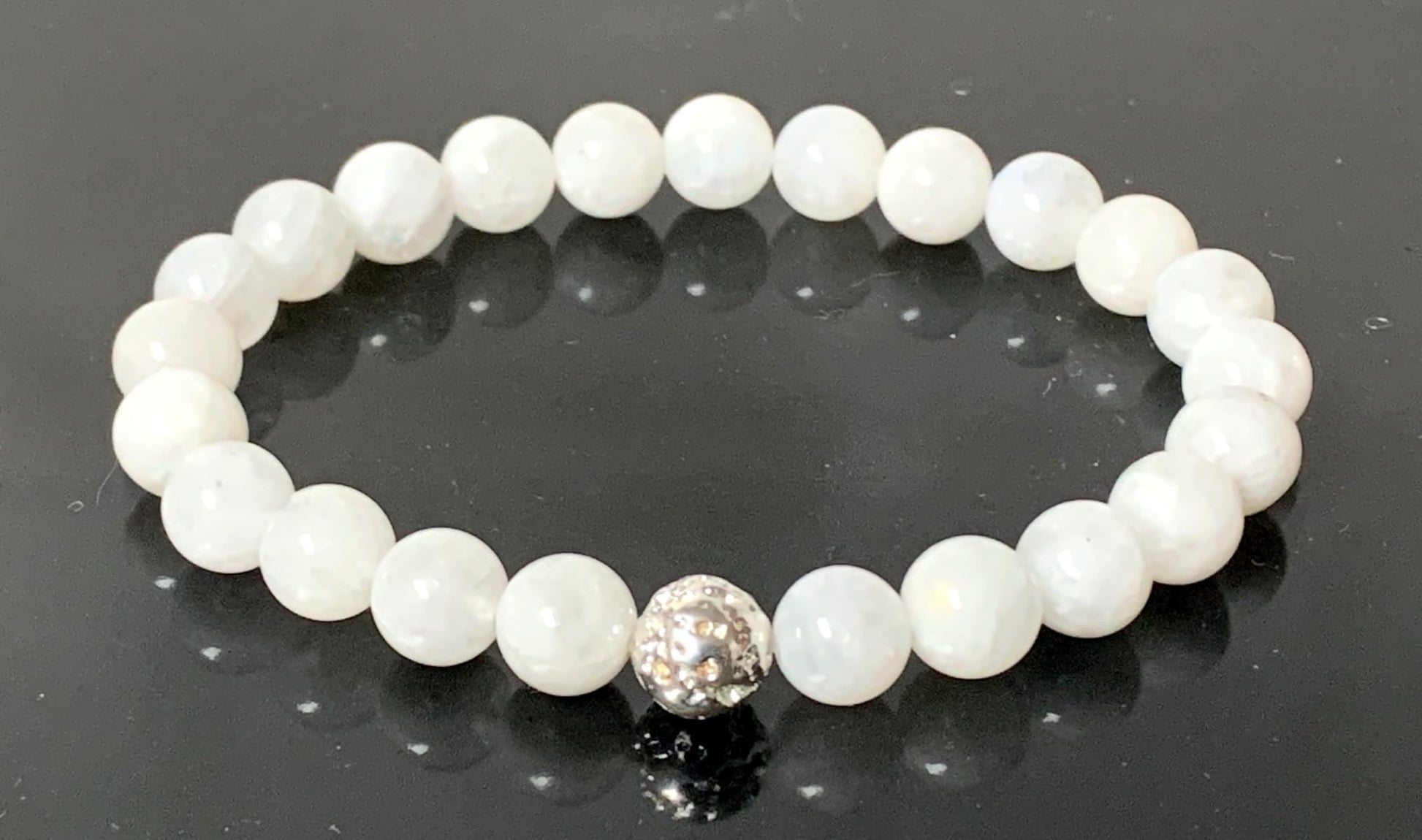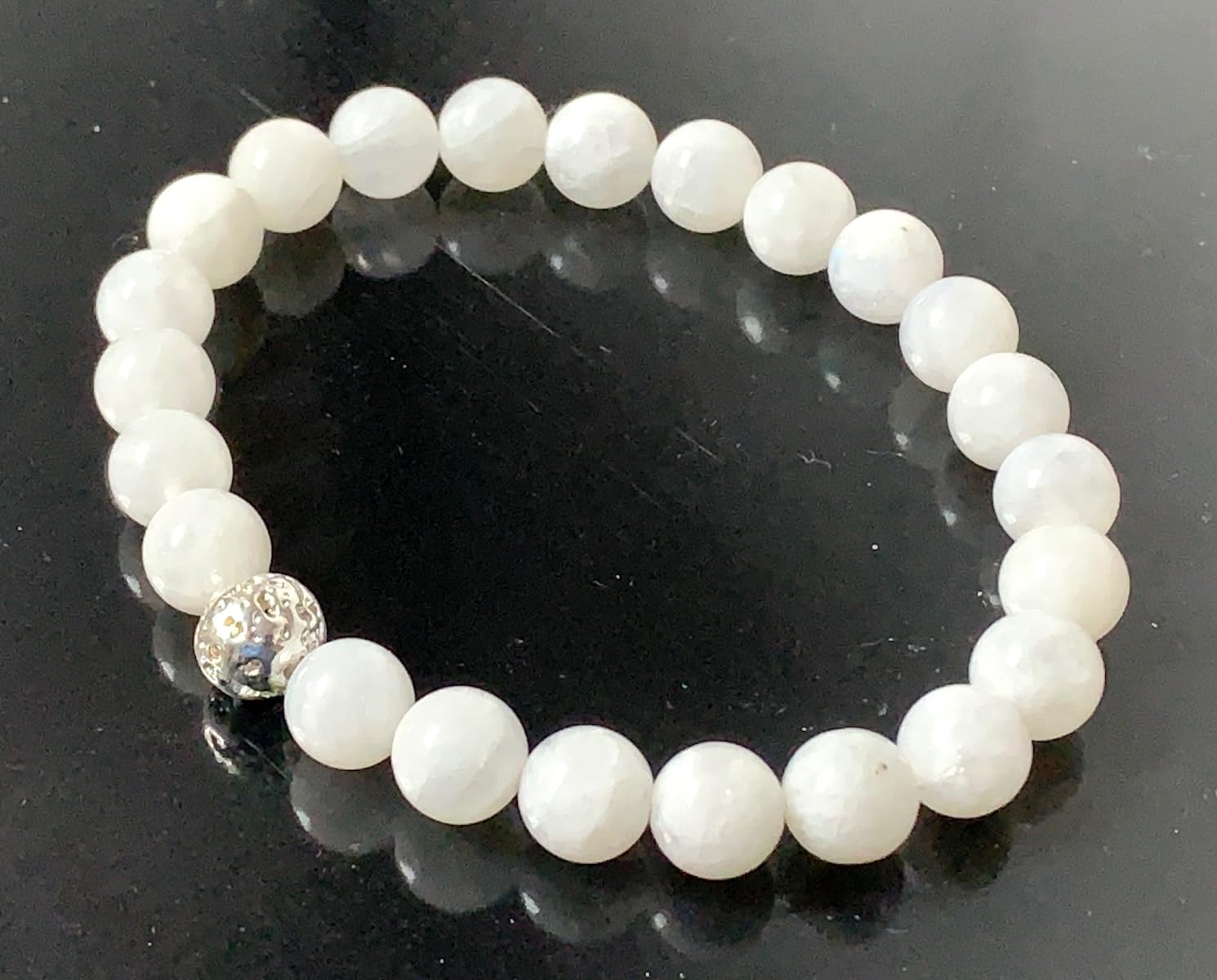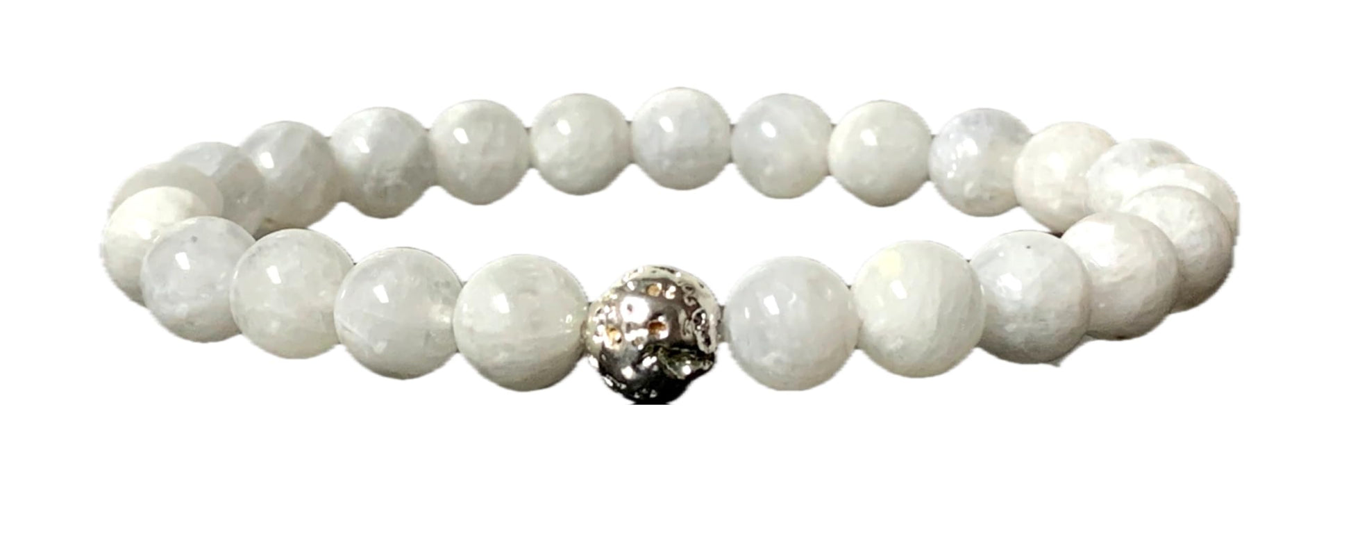 - This Moonstone Beads Stretch Bracelet is a blend of natural elegance and contemporary design, featuring 8mm Moonstone beads that glow with soft iridescence, complemented by plated Lava Beads in striking gold and silver tone finishes. Available in 6 to 9 inches, this adjustable bracelet fits comfortably on any wrist, making it a versatile piece for both casual and formal wear.