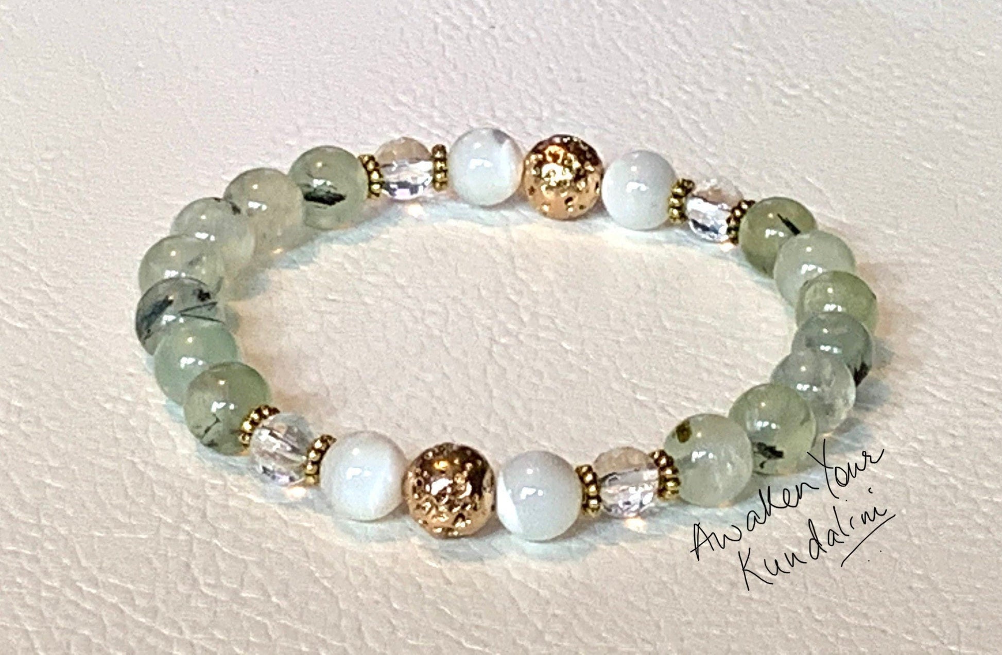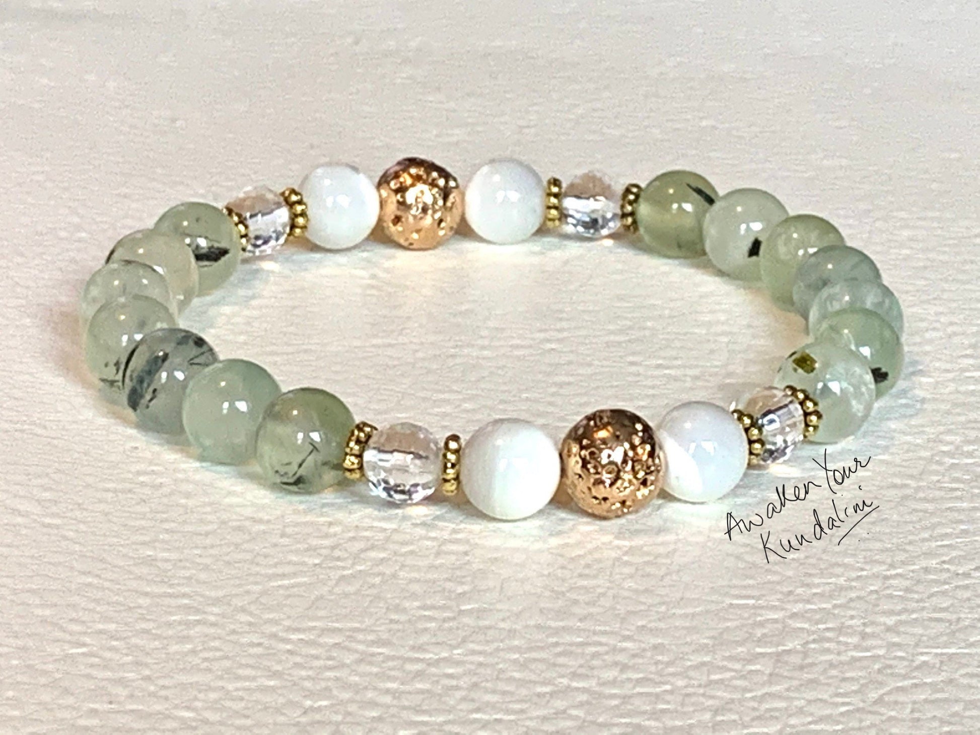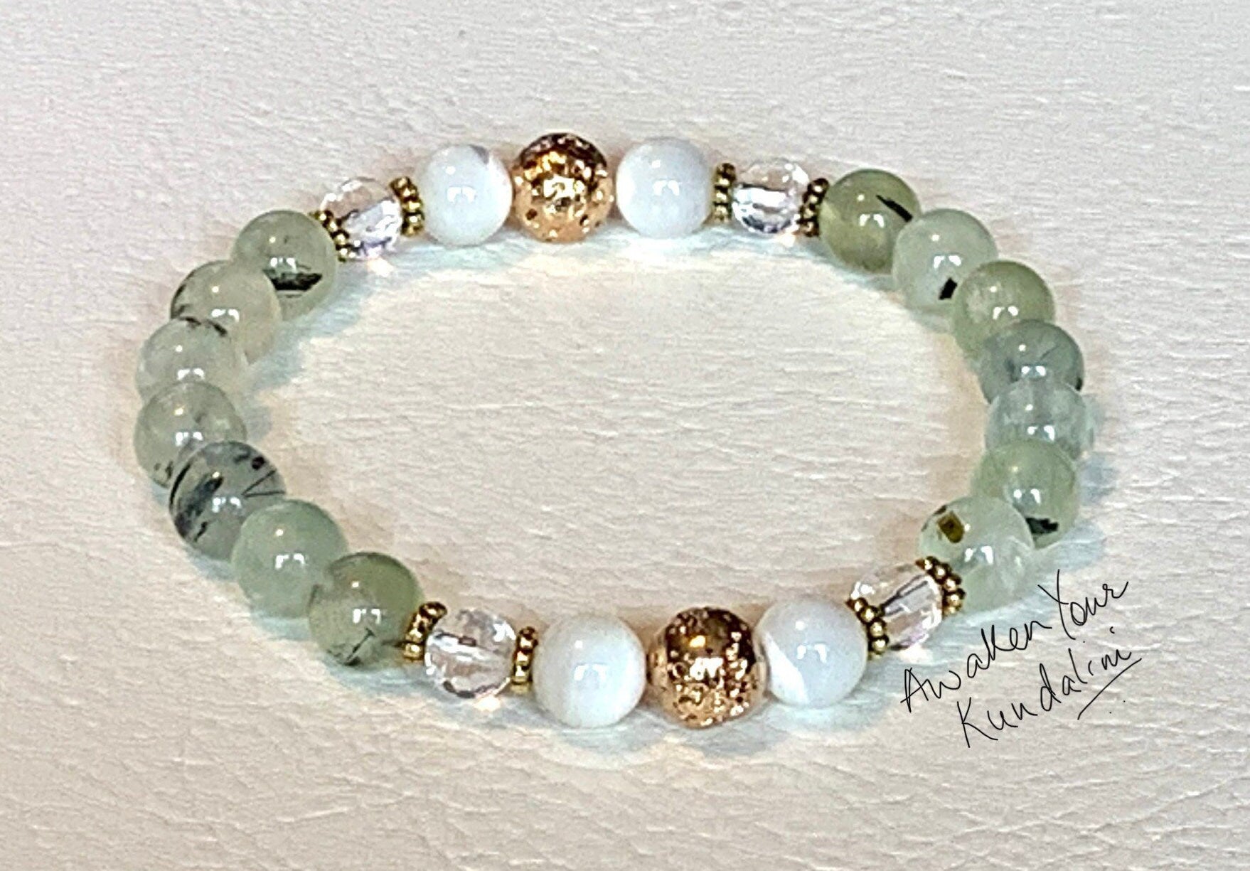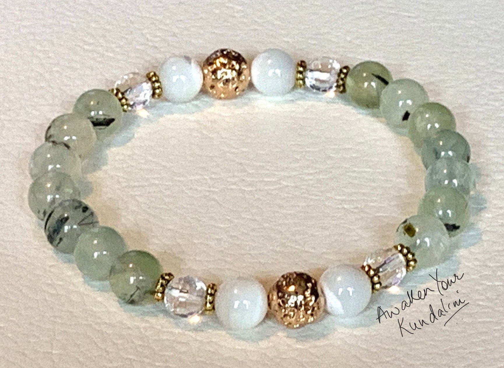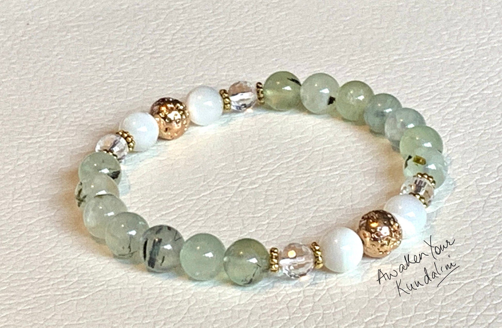 The Prehnite, Mother of Pearl & Quartz Bracelet from the ALOKA & SPHATIKA Collections by Awaken Your Kundalini is a sacred stretch bracelet available in 6mm or 8mm natural gemstone beads. This trio of stones harmonizes serenity, intuition, and clarity — making it a perfect companion for meditation, healing, and daily wear.