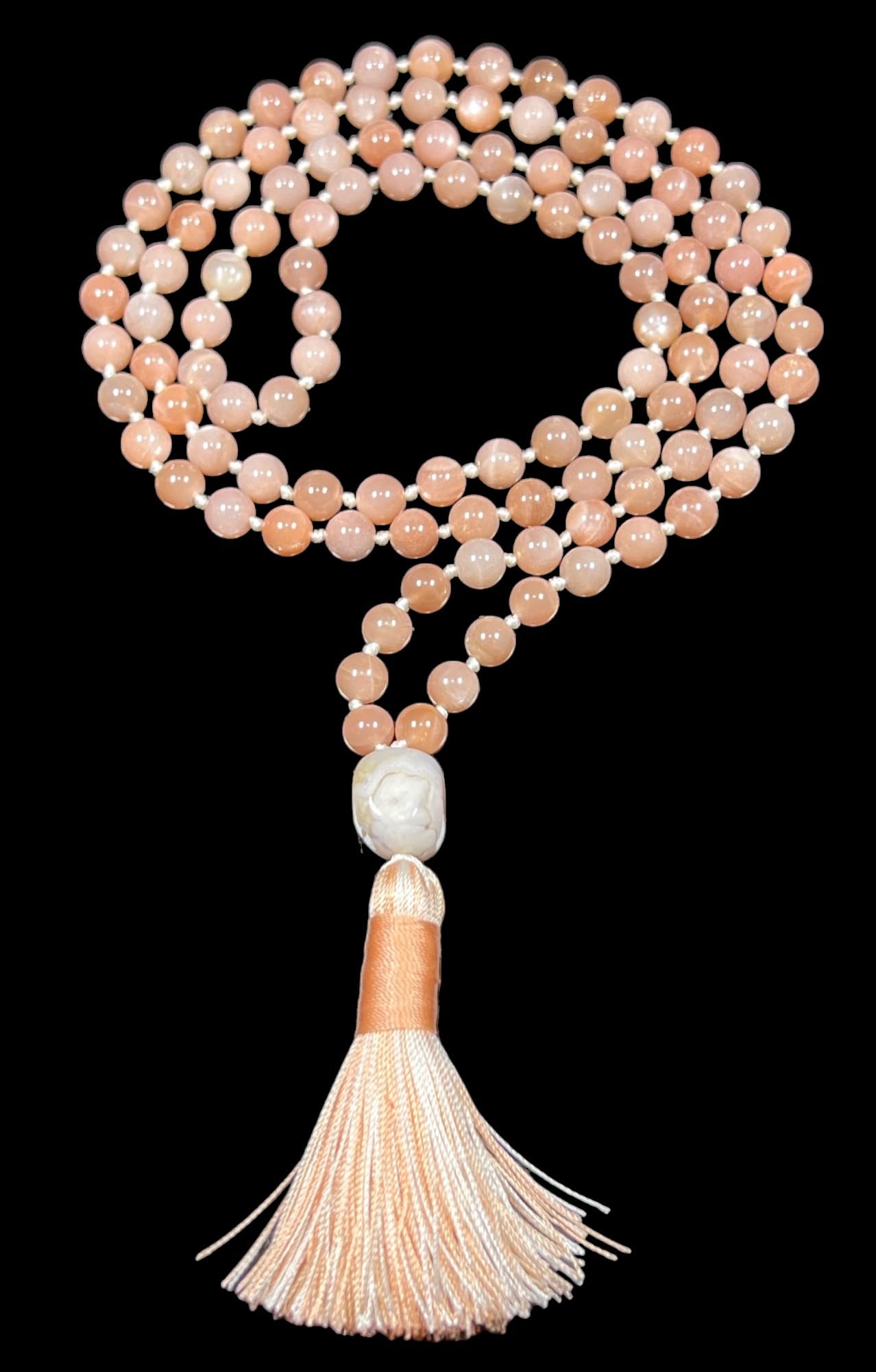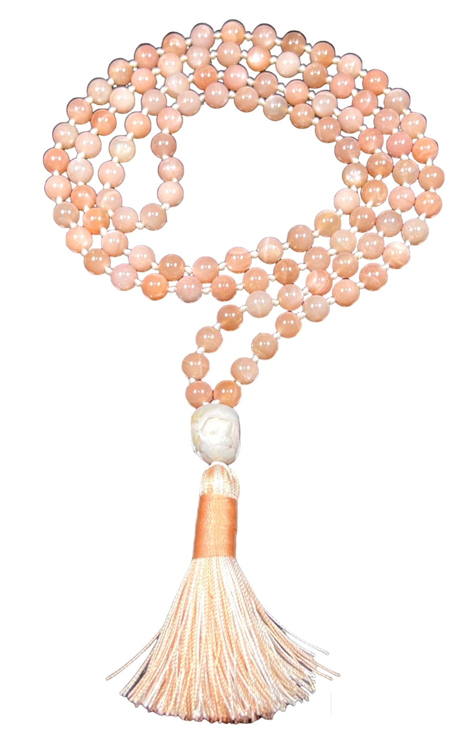 - This isn't just a necklace, it's a journey of self-love and discovery! Hand-Knotted Perfection: Meticulously crafted for durability and spiritual connection. Luminous Peach Moonstone & Rose Quartz: A powerful combination for love and intuition. Sacral Chakra Alignment: Promotes creativity, passion, and emotional balance. 108+1 Beads: Traditional mala design for spiritual practices.