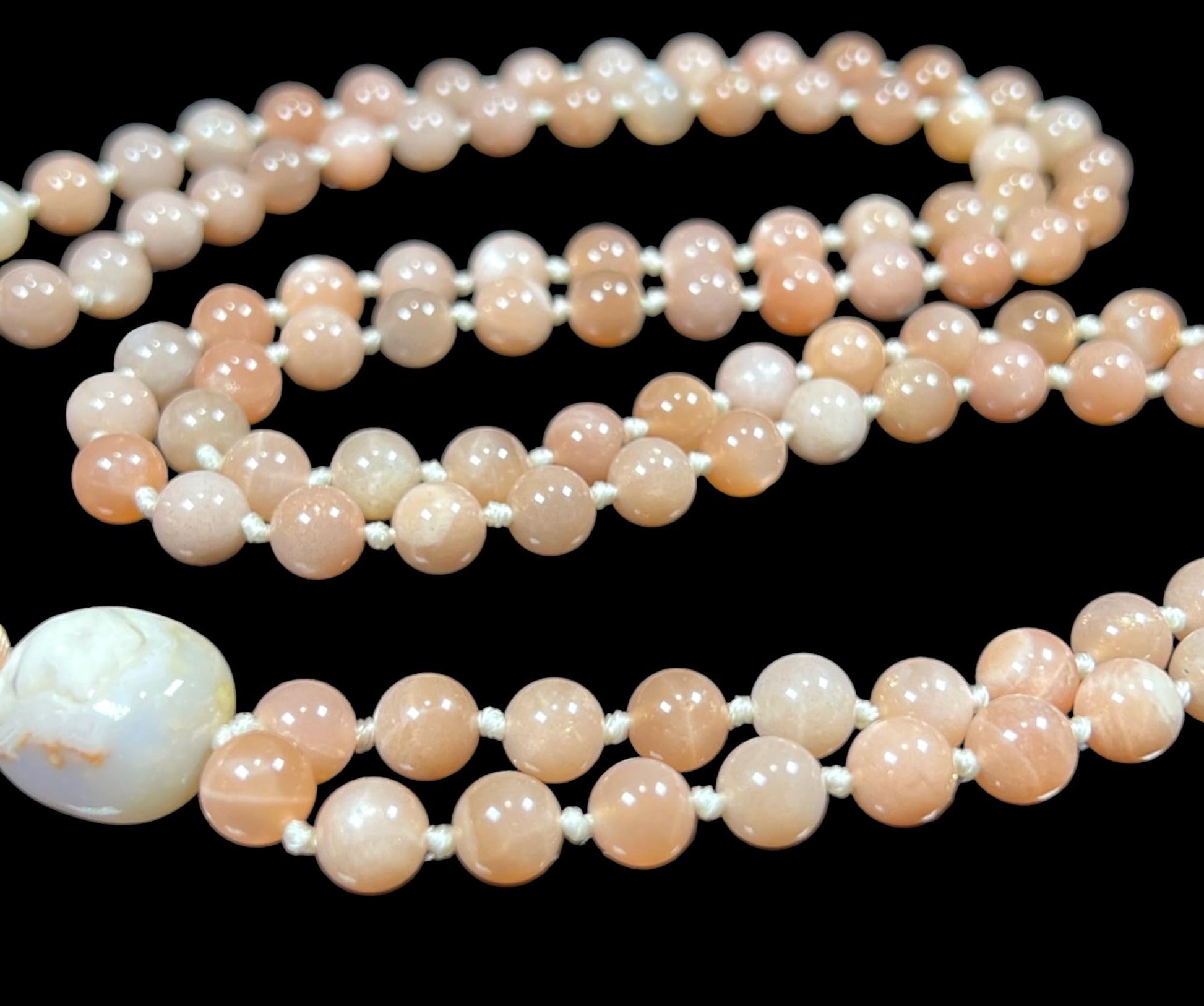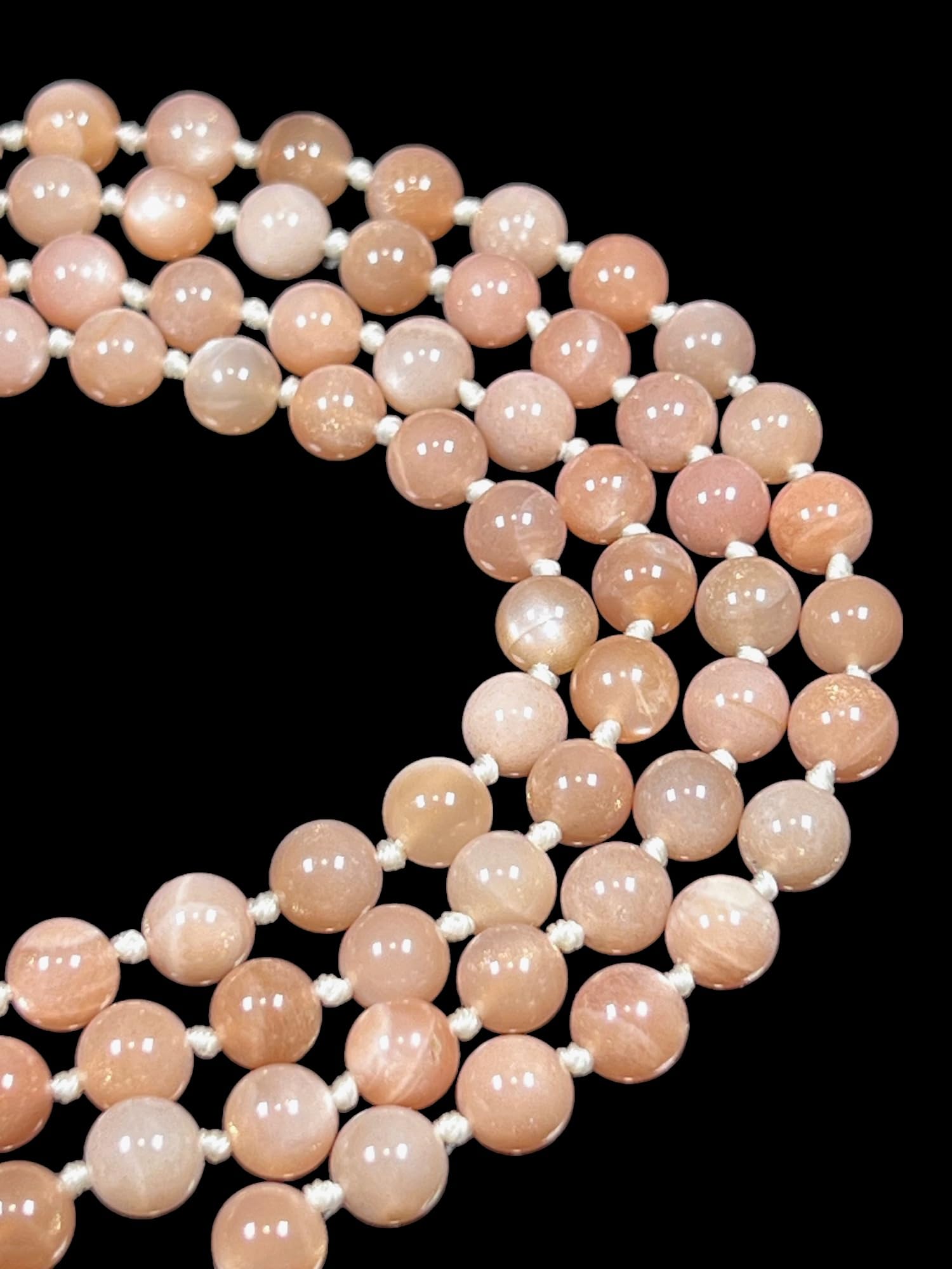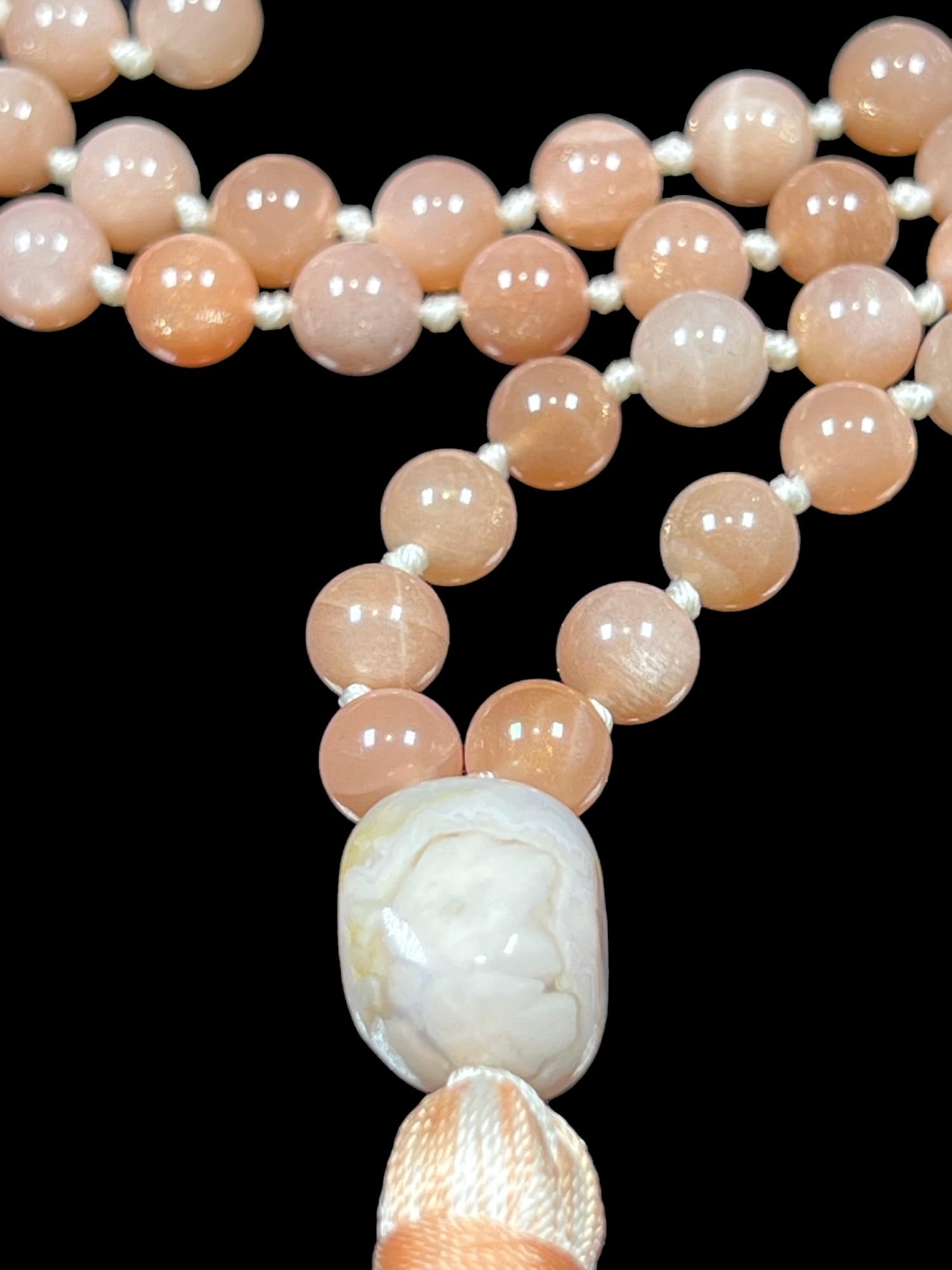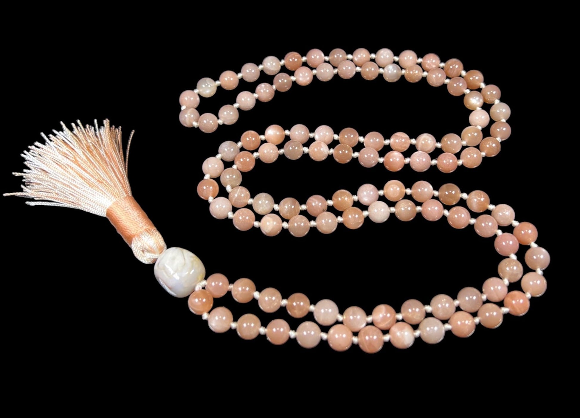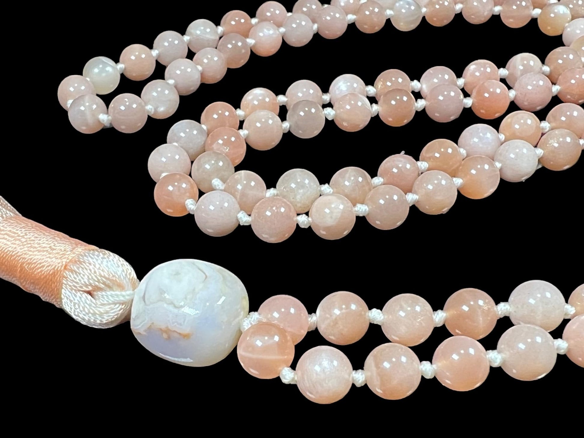 - Product Details: Material: Genuine Peach Moonstone (8mm beads) & Rose Quartz (Guru Bead) Length: Approximately 45 inches (when laid flat) Style: Hand-knotted cord, 108 beads