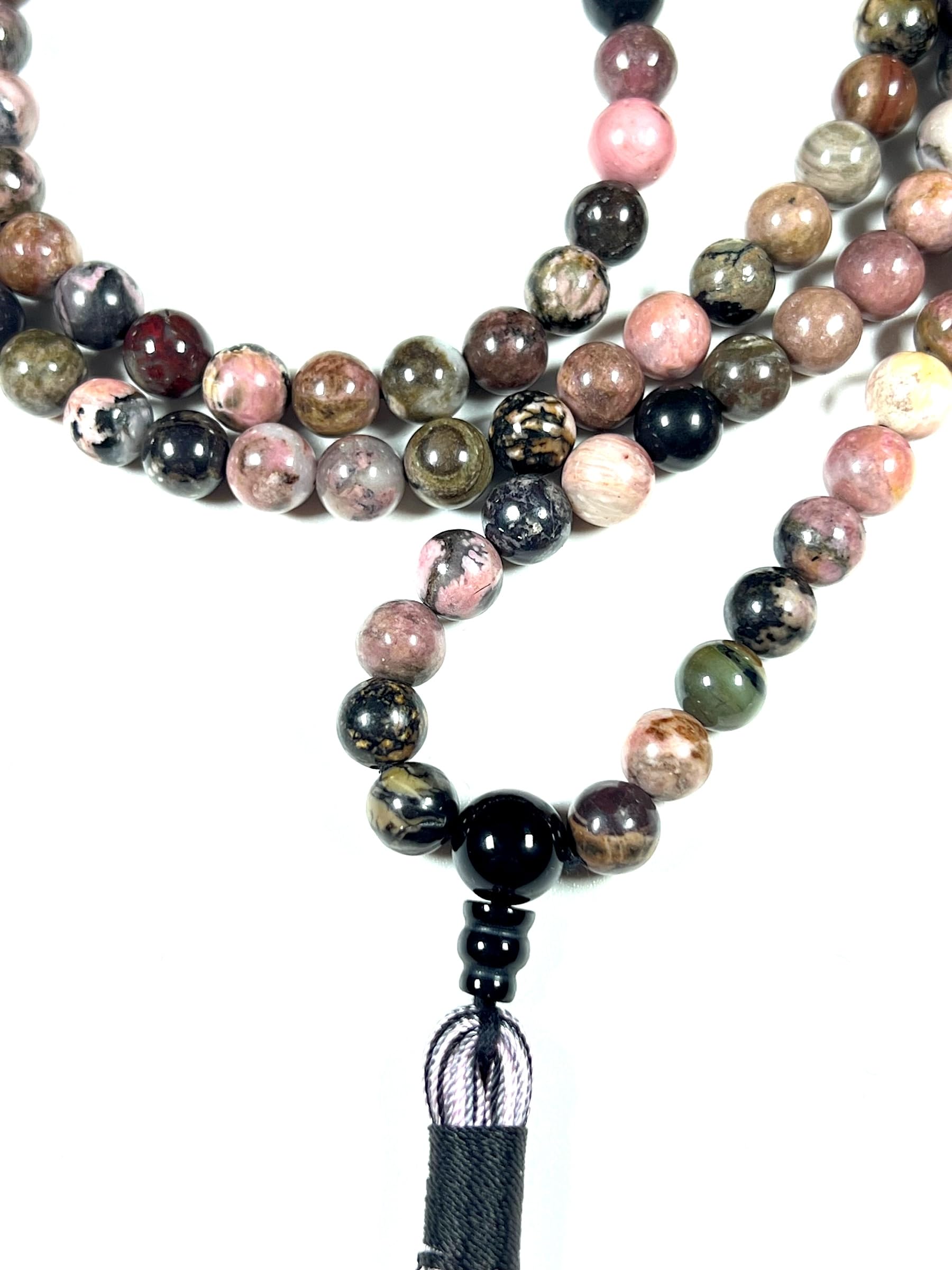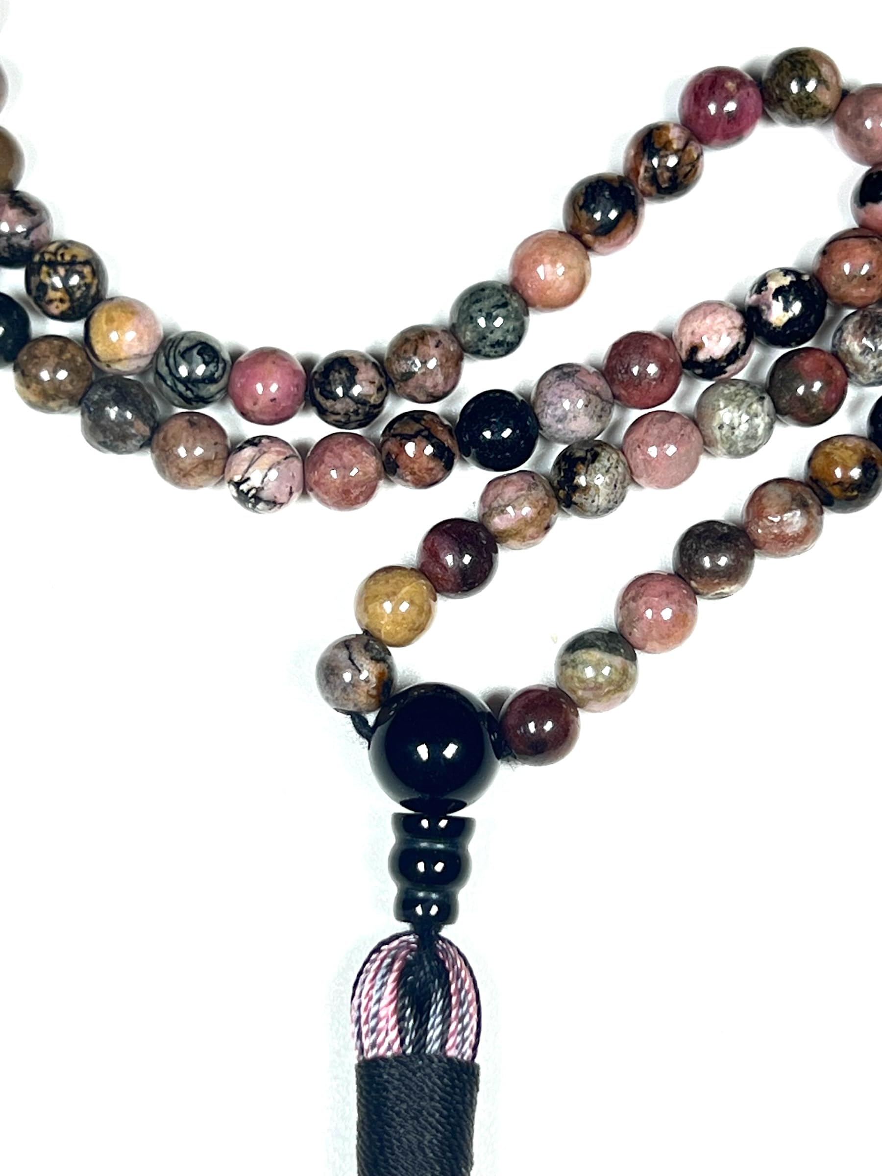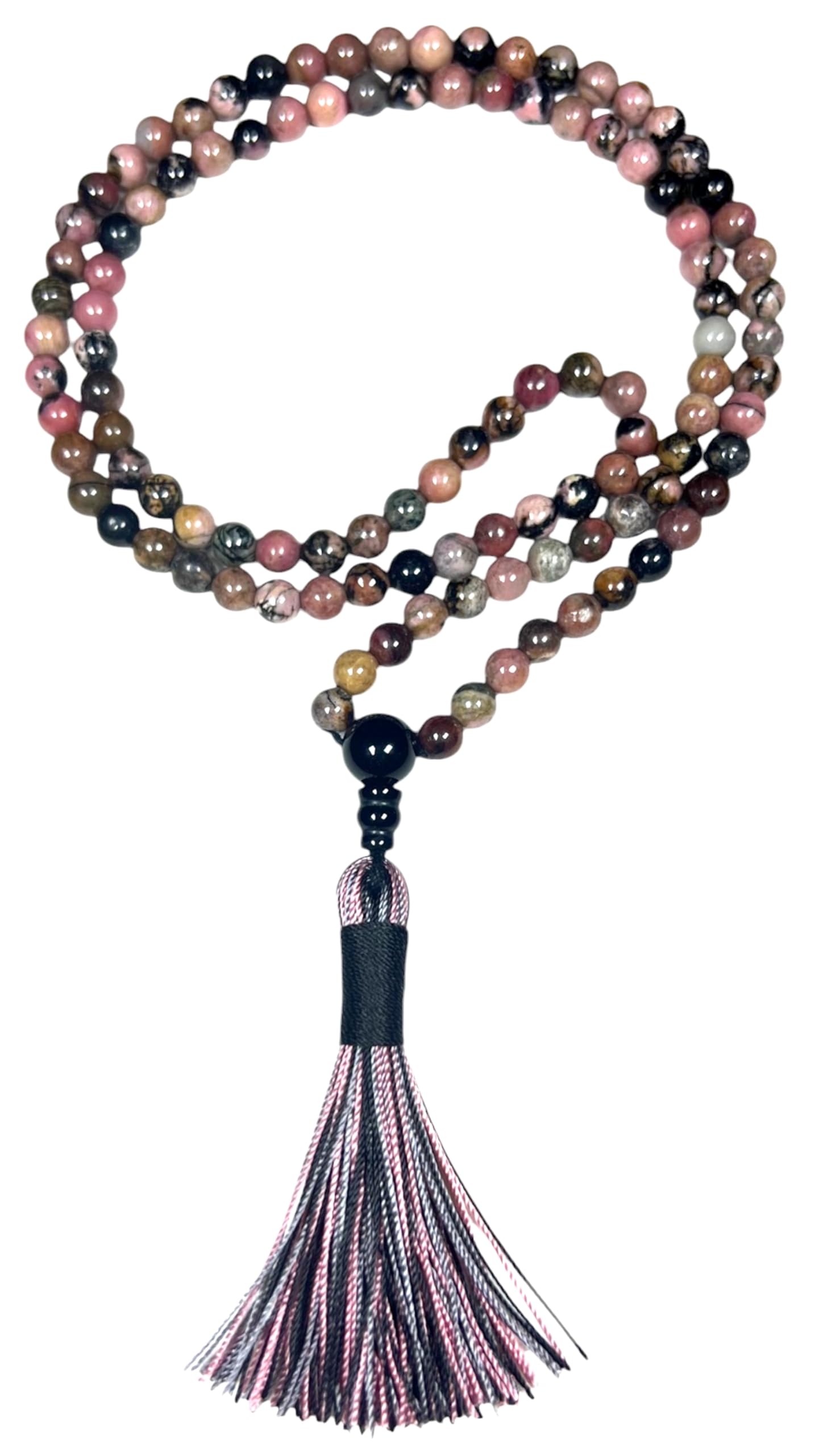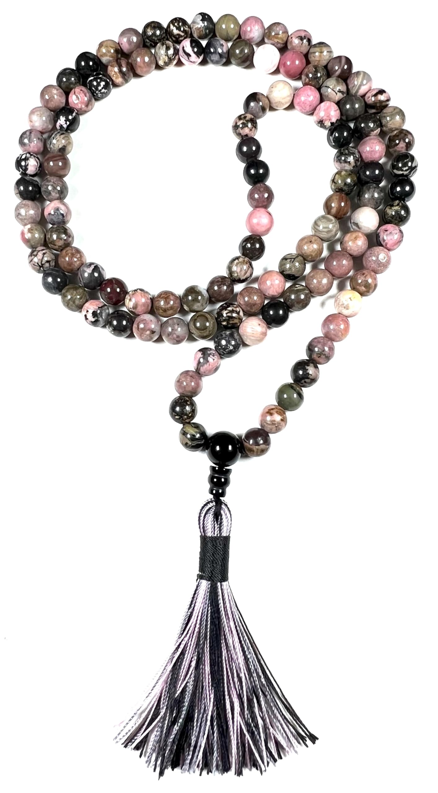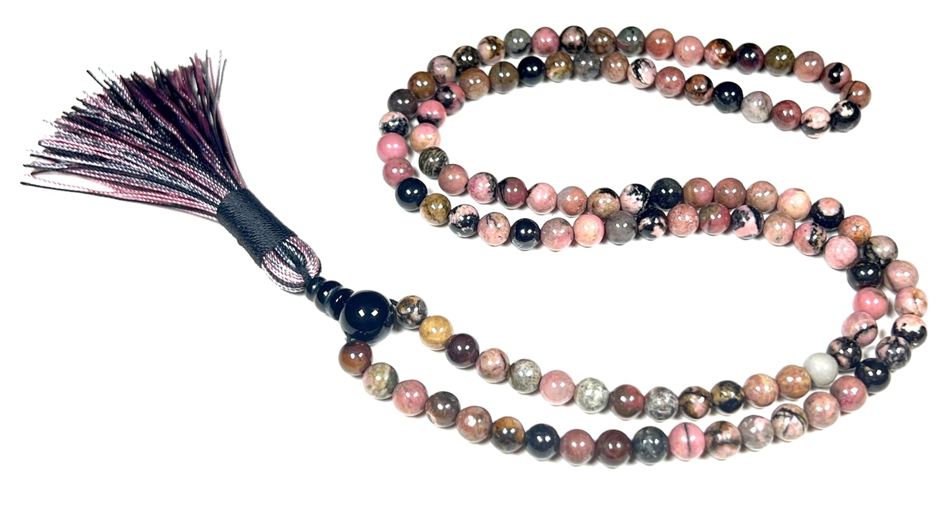 - #RhodoniteMalaBeads #BlackOnyxNecklace #HeartChakraJewelry #GeminiBirthstone #MeditationBeads #SpiritualJewelry #HandmadeMala #YogaAccessories #MindfulnessTools #NaturalStoneNecklace